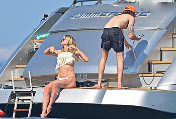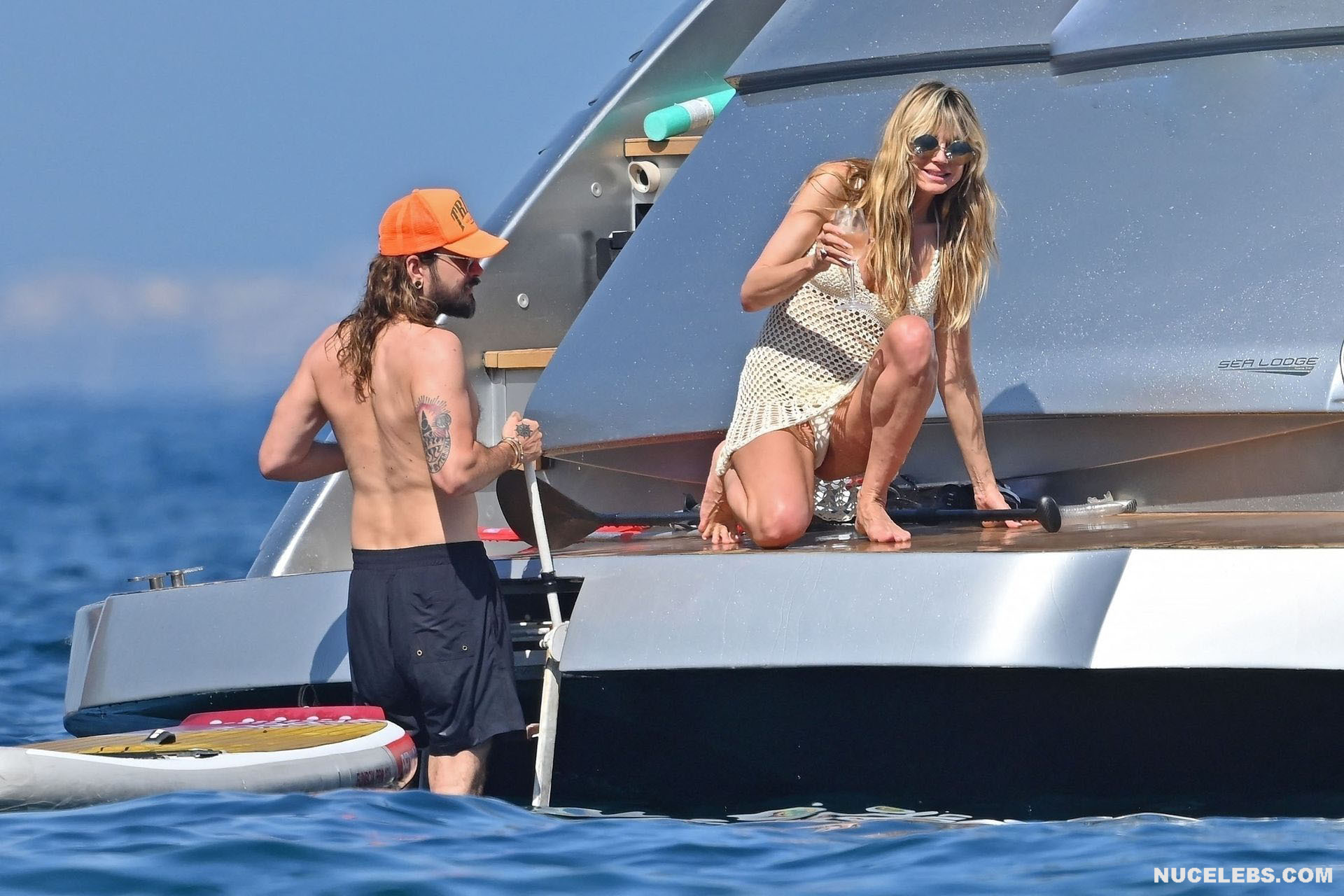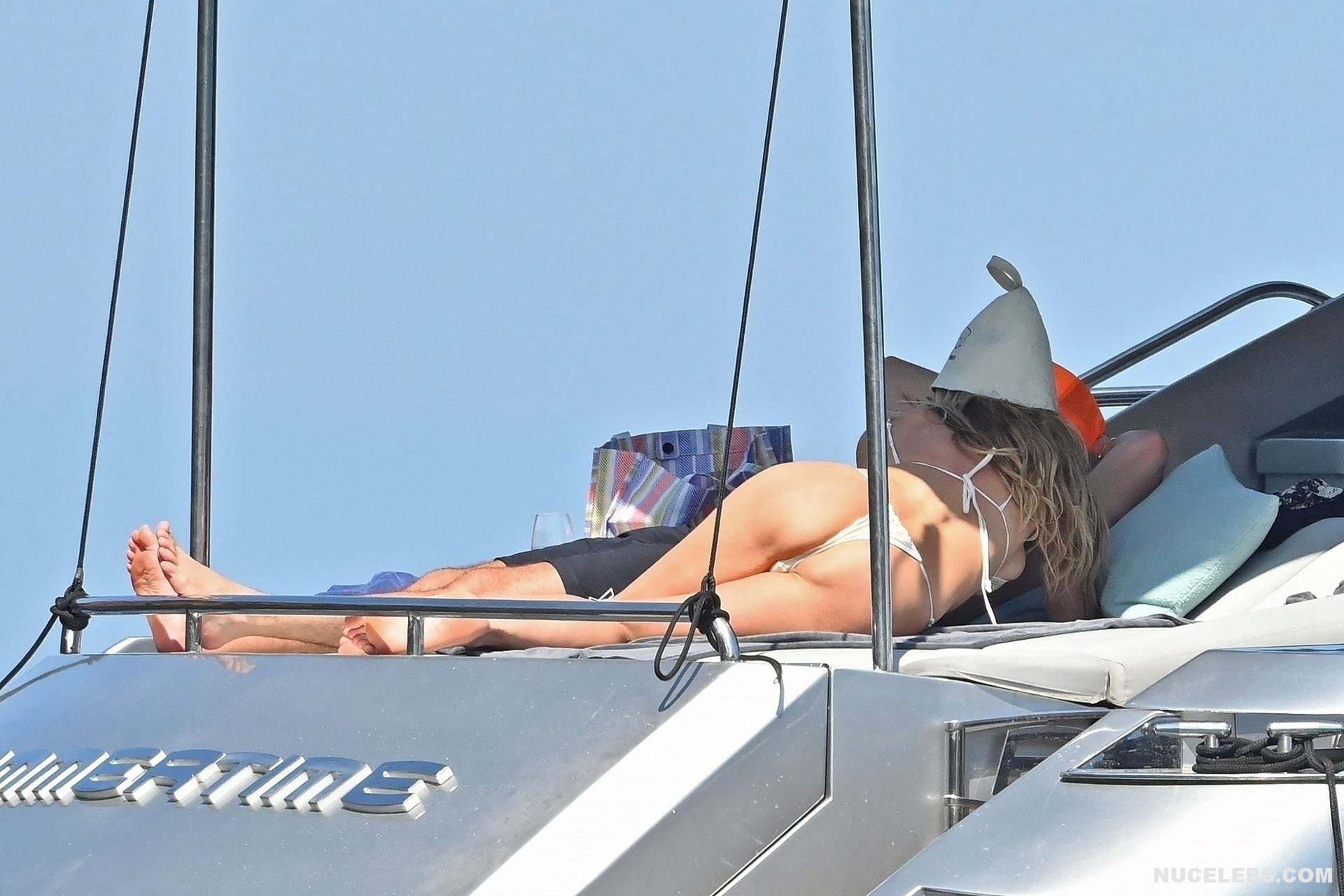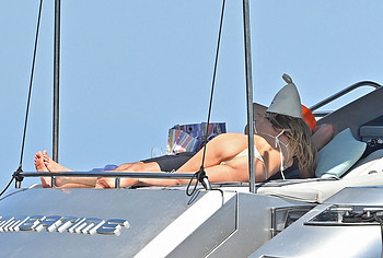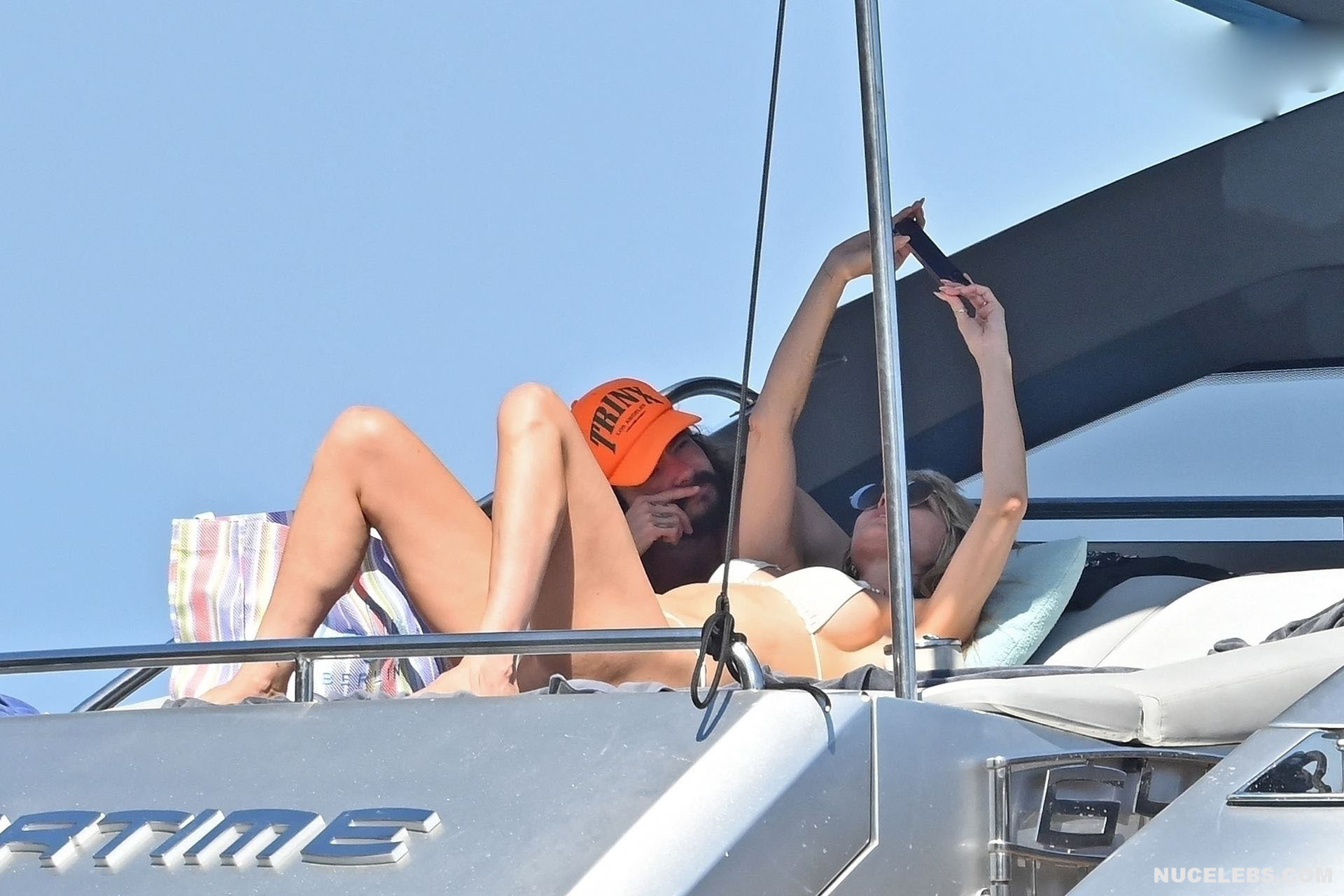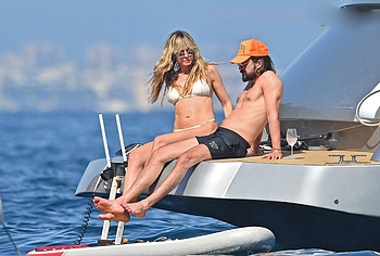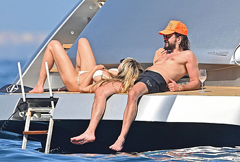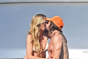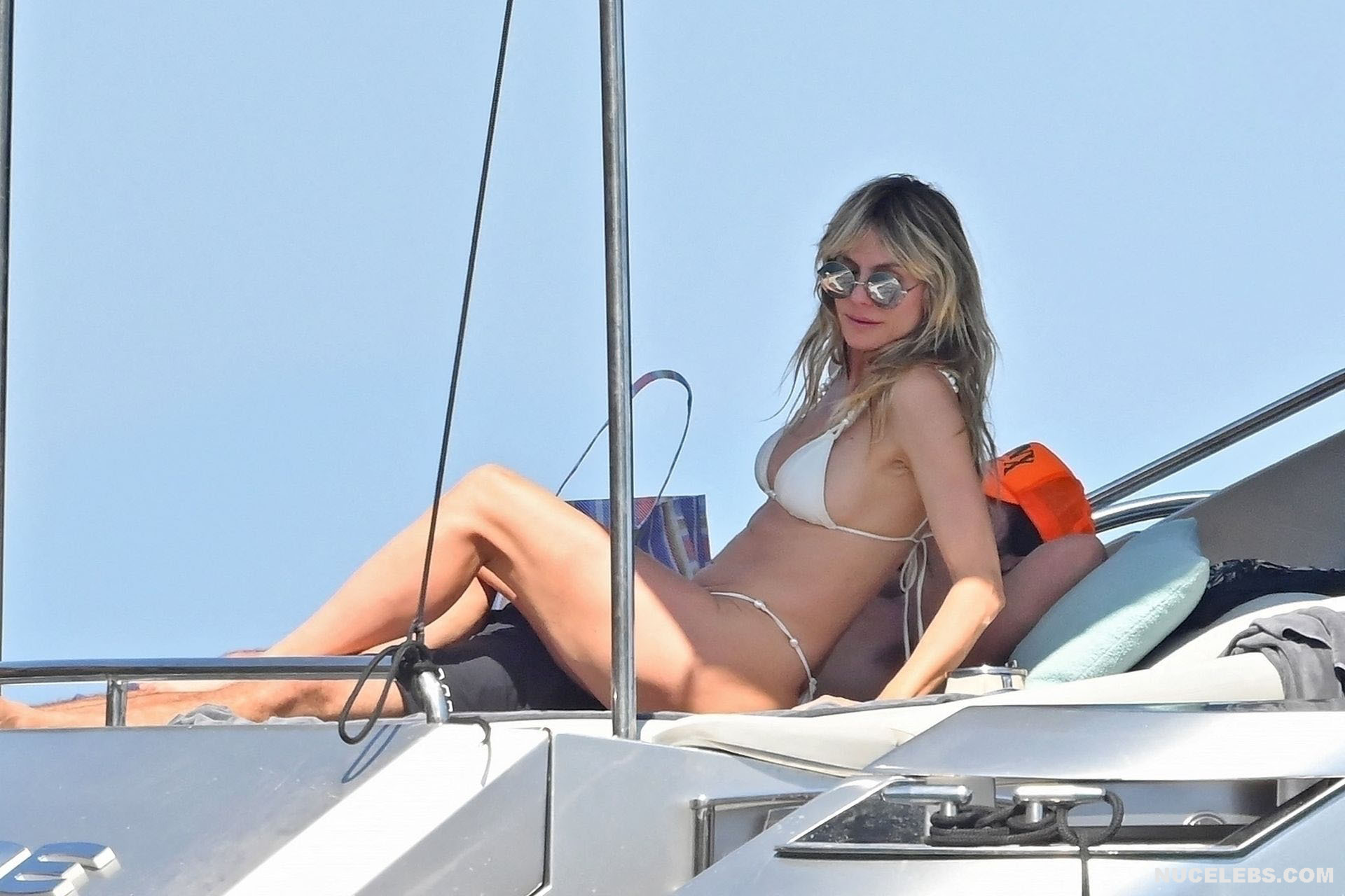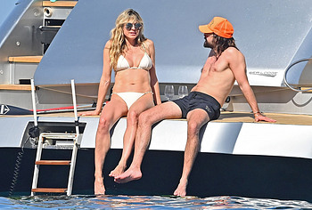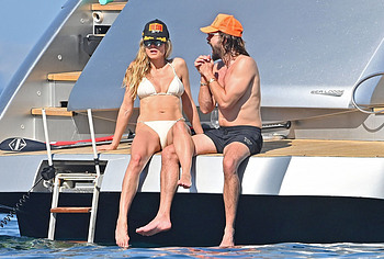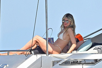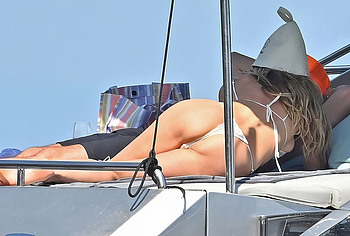 Dive into Heidi Klum’s aquatic escapades as she dives off the yacht’s deck into the ocean’s embrace. This German supermodel once again showed off her slim figure in a petite white bikini. By the way, this beauty didn’t miss the opportunity to turn her back to the camera to show her nice butt in white panties. Moreover, Heidi Klum’s juicy boobs were naked at that moment and she held them lightly with her hand. And here is a selfie in which Heidi Klum not only showed her nude tits but also pushed her black panties down, exposing her pubis.