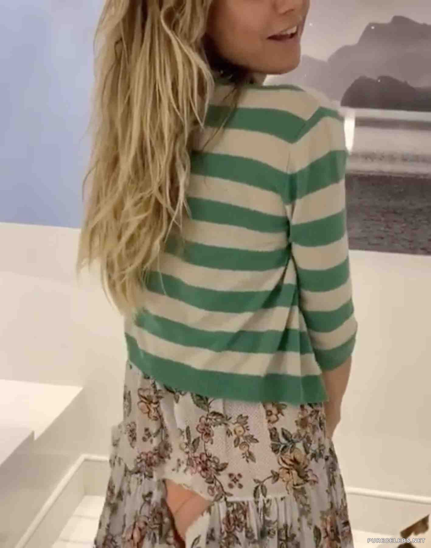 Oops, the German top model Heidi Klum found herself in an awkward situation, flashing her panties in front of the camera. The girl was wearing a striped jacket and a white skirt with a print. The star danced, turning her back to the camera, and did not notice that her skirt was torn and her charming ass in beige panties could be seen. How seductive and sexy it looked, it is simply impossible to resist such a hot beauty!
