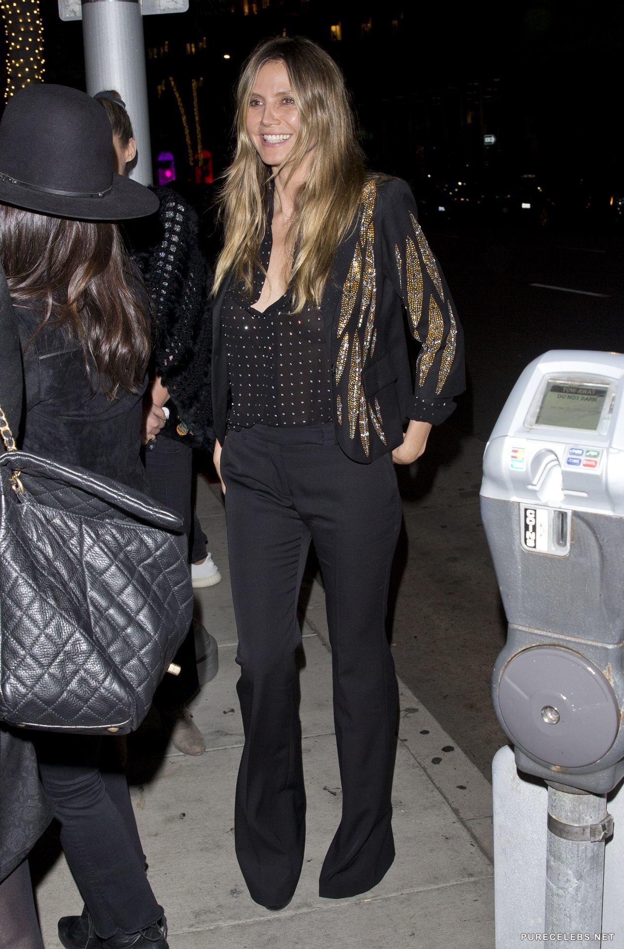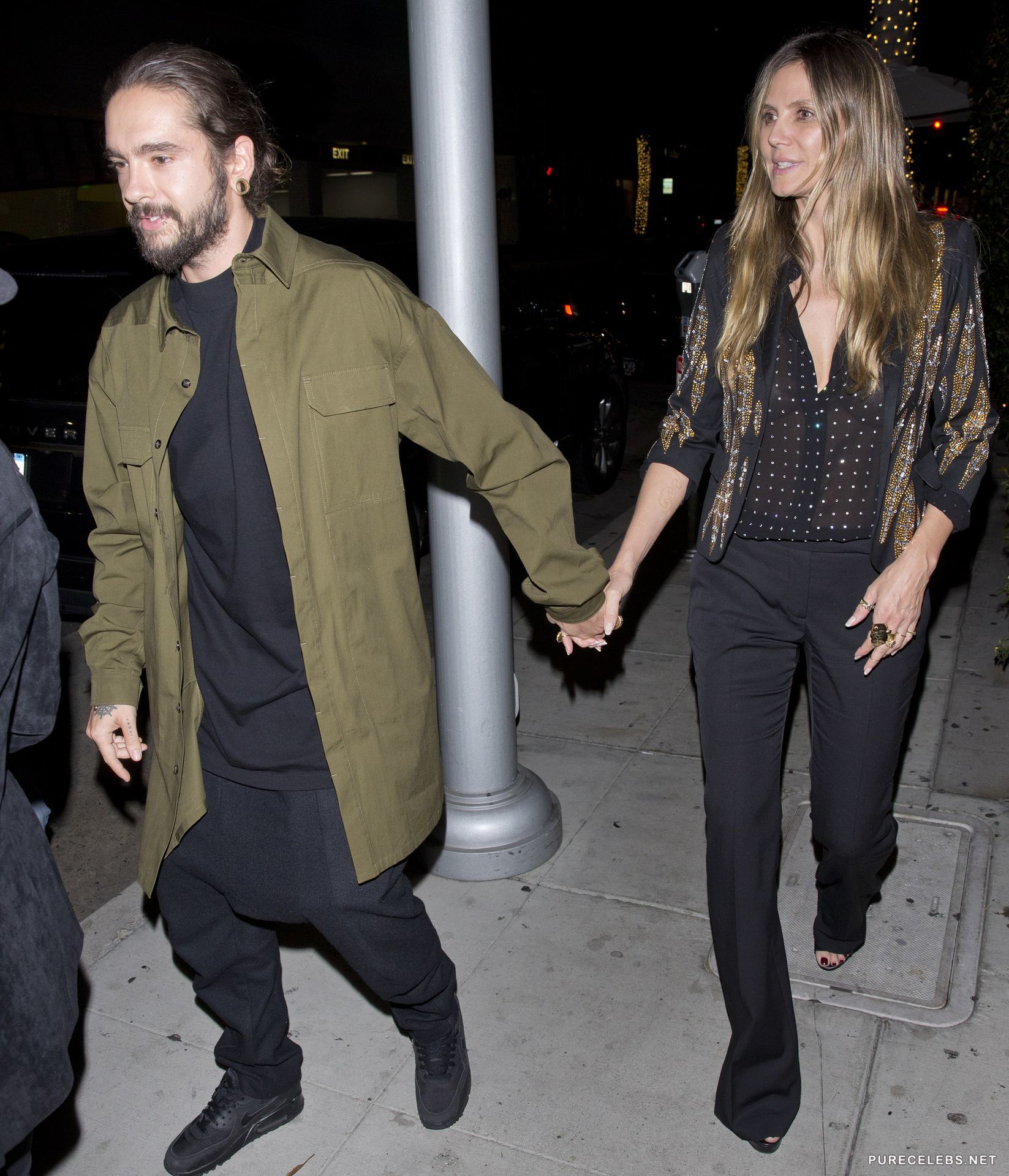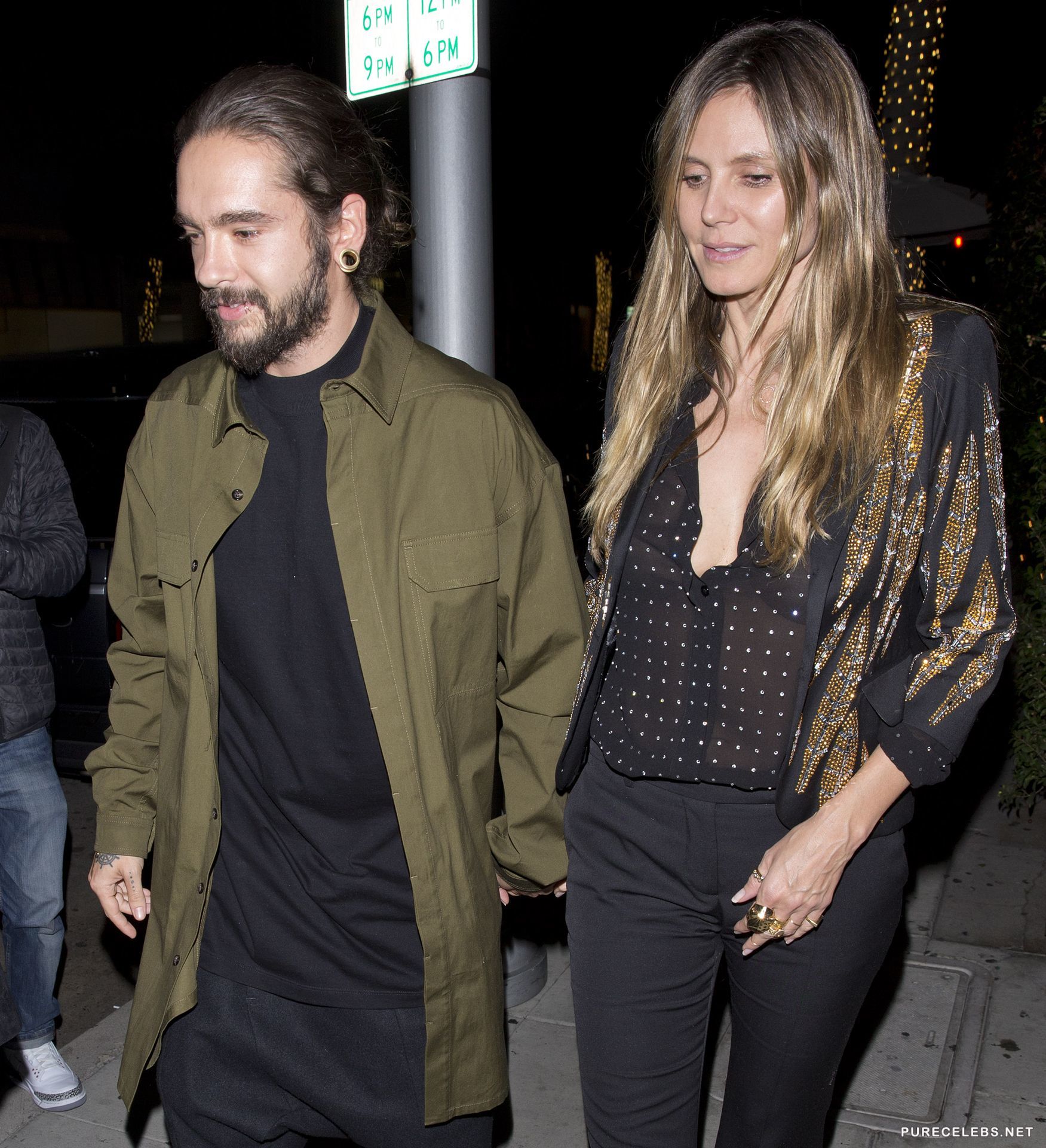 Heidi Klum was seen with a huge smile on her face and in a see through shirt, without a bra, going out of a restaurant, where she had a pleasant dinner with a younger man, who was holding her hand on their way out. This gorgeous German model looks stunning and this time she seemed like she barely had any make- up on, still she looked as amazing as always.
