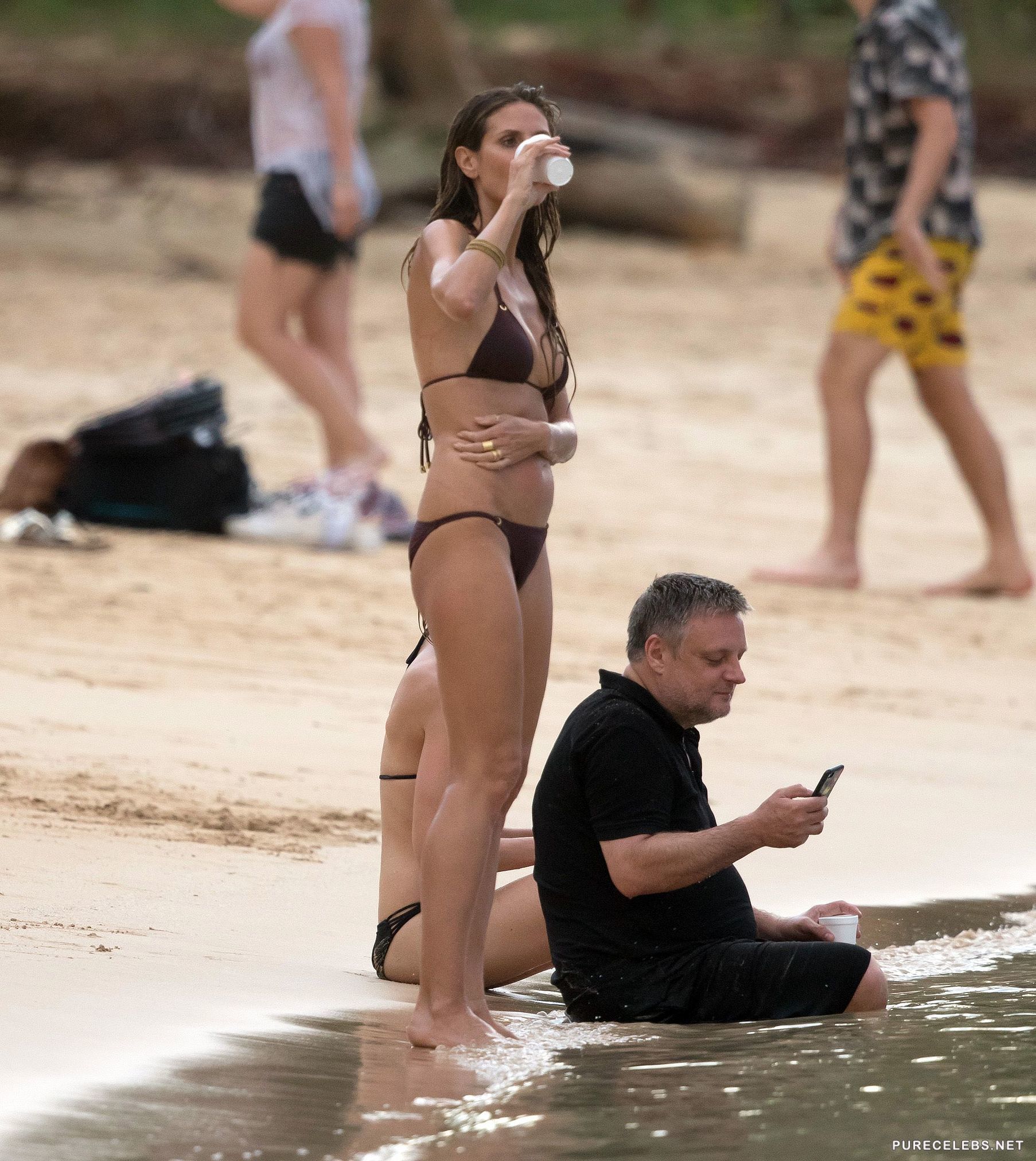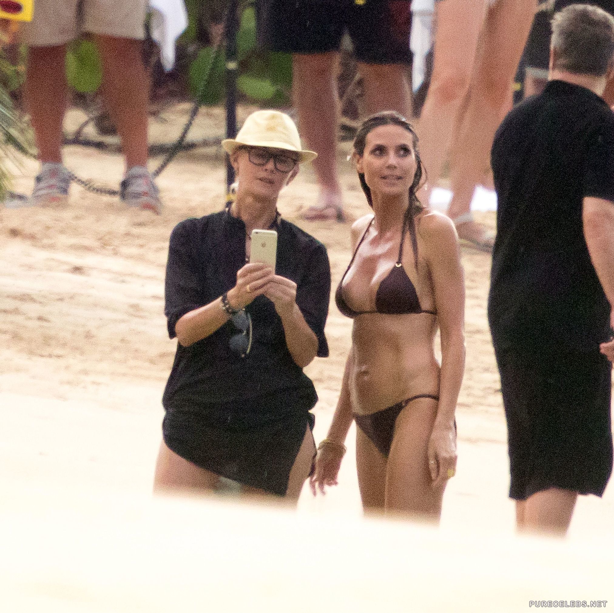 We all love to see a sexy cougar, especially when she is soaking wet and when that cougar is Heidi Klum, we are sure no man could resist her charm. The stunning MILF is looking hotter than ever in a miniature brown bikini while enjoying herself on the beach. The small pieces of fabric can cling to Heidi’s skin when she gets out of the water, revealing her nipples and framing her butt.