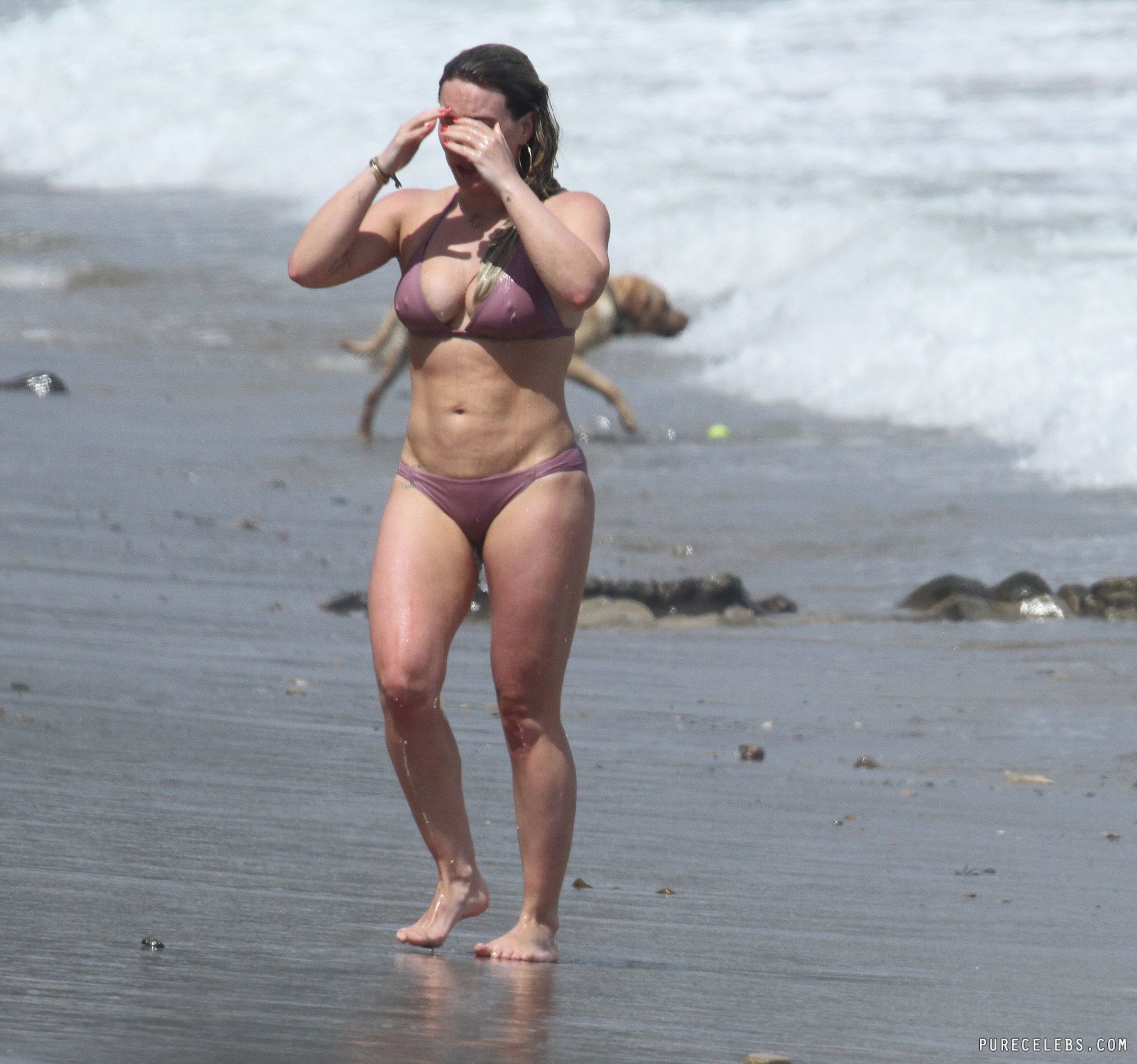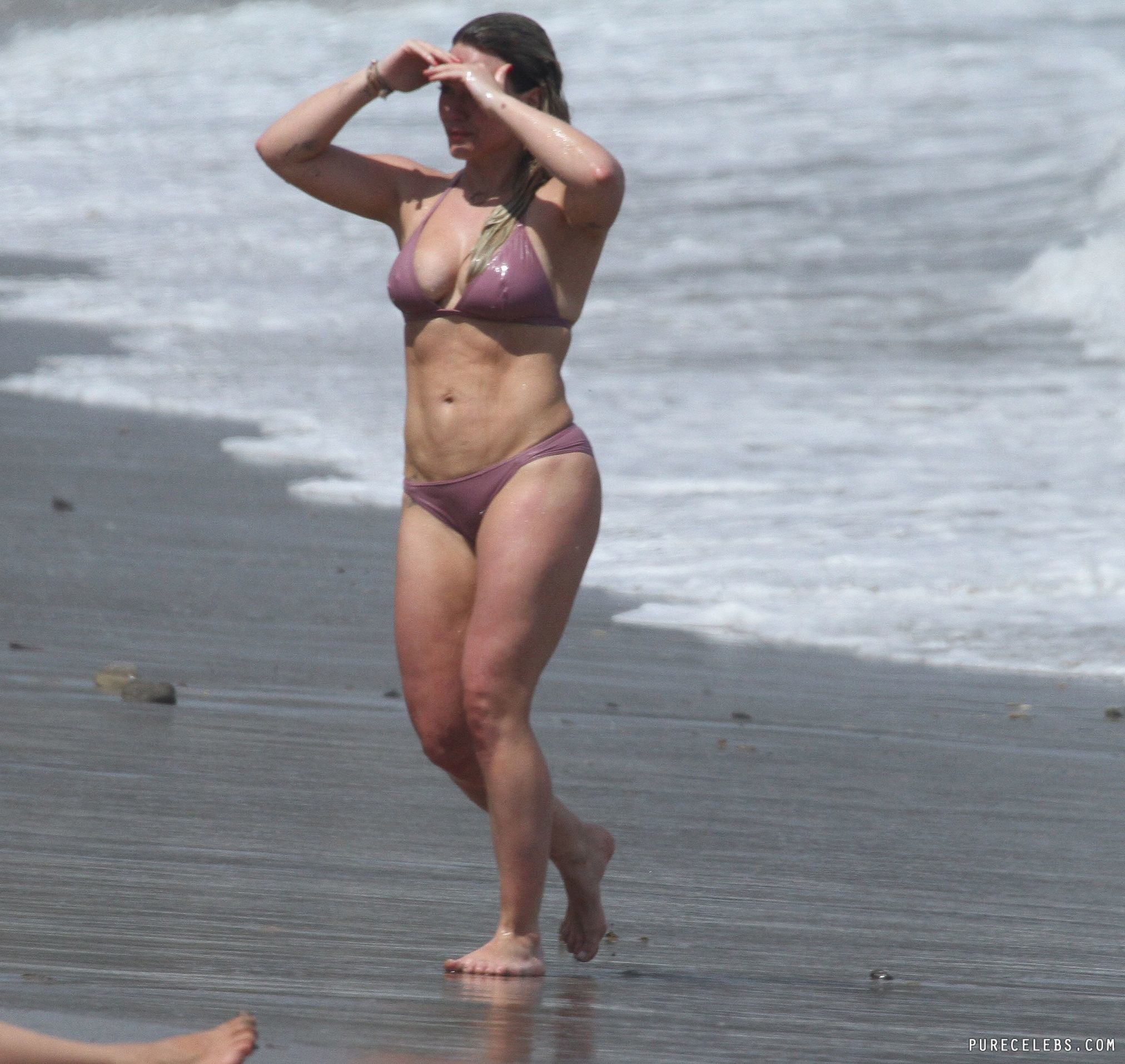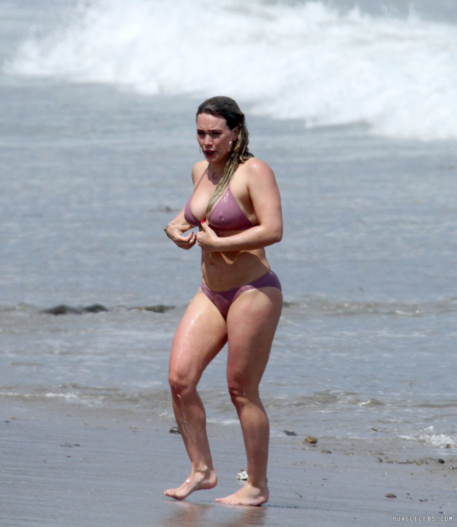 Paparazzi managed to catch the charming blonde Hilary Duff during her beach vacation. The American singer looked very seductive in a small purple bikini. Especially sexy were Hilary Duff’s nude tits in a wet bra, through which her poking nipples were visible. In addition, through her tight-fitting wet panties, the great cameltoe of Hilary Duff was visible.