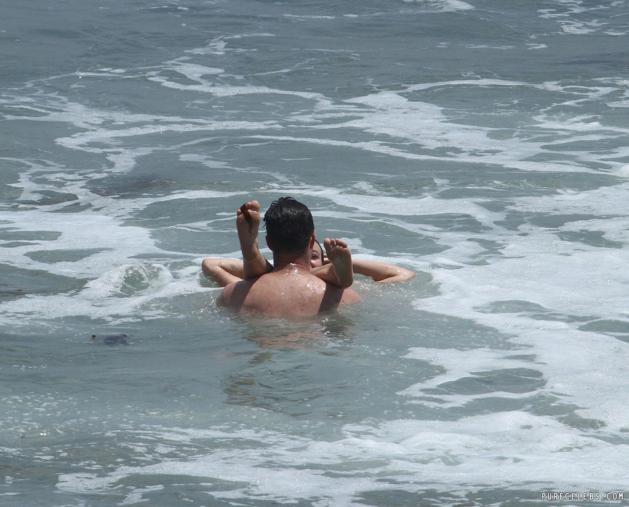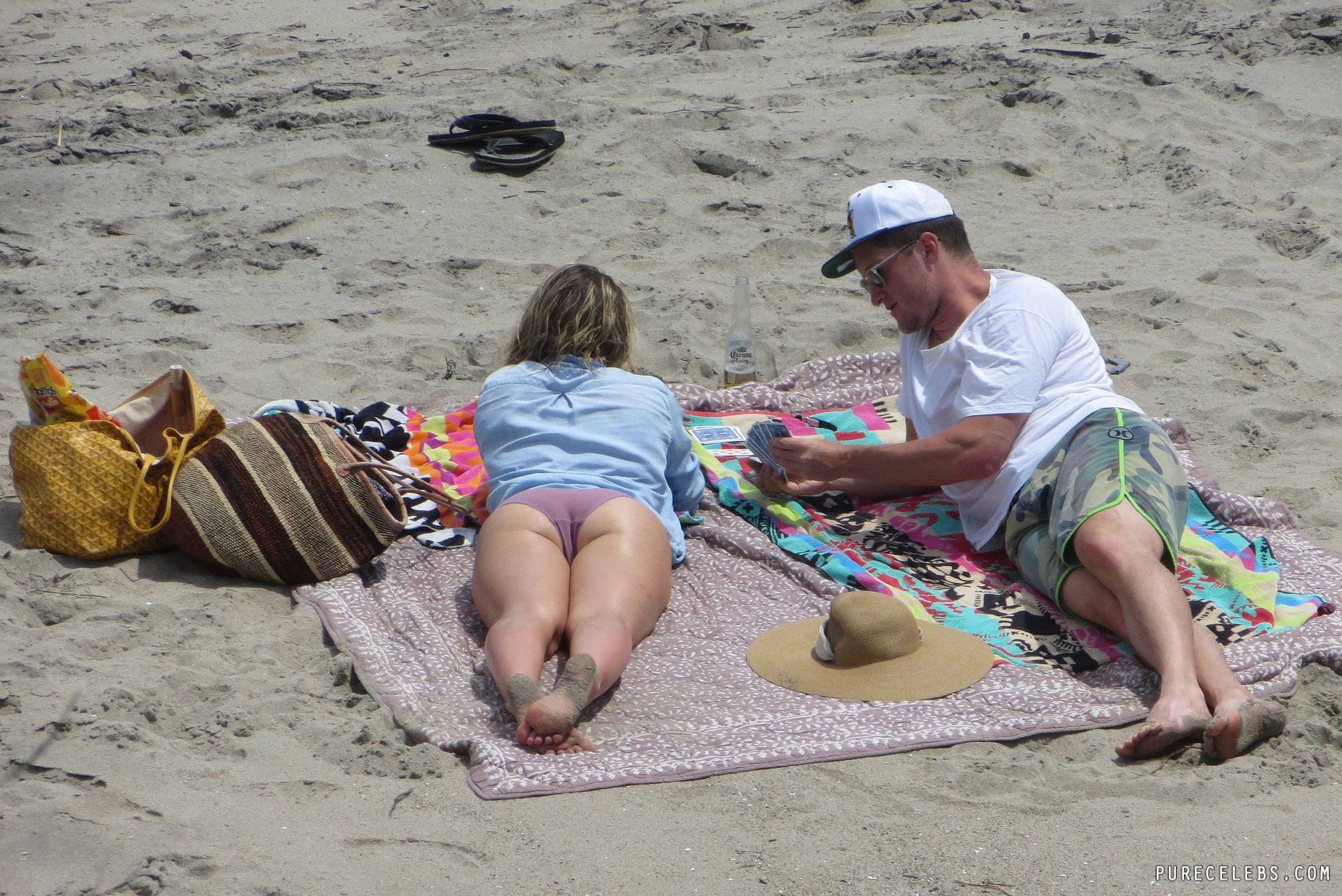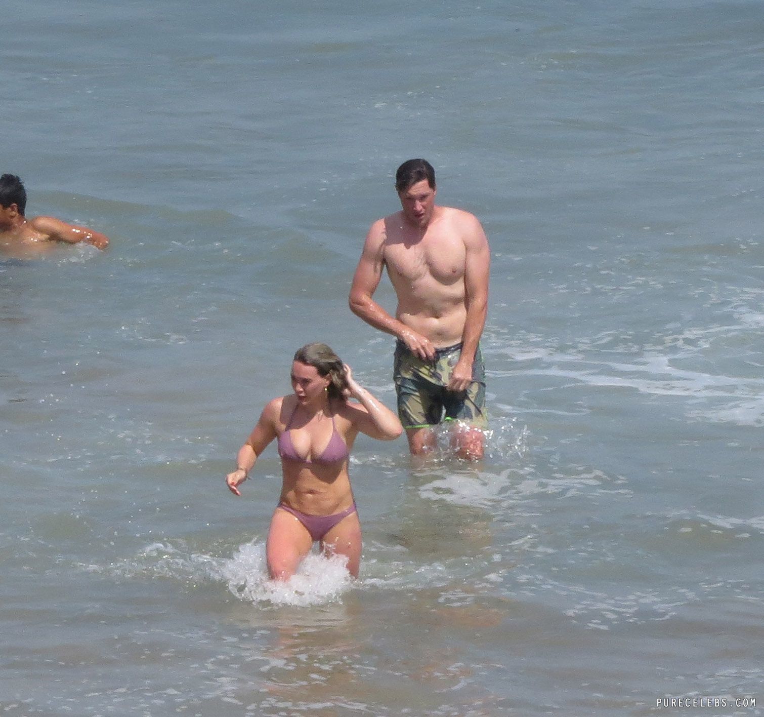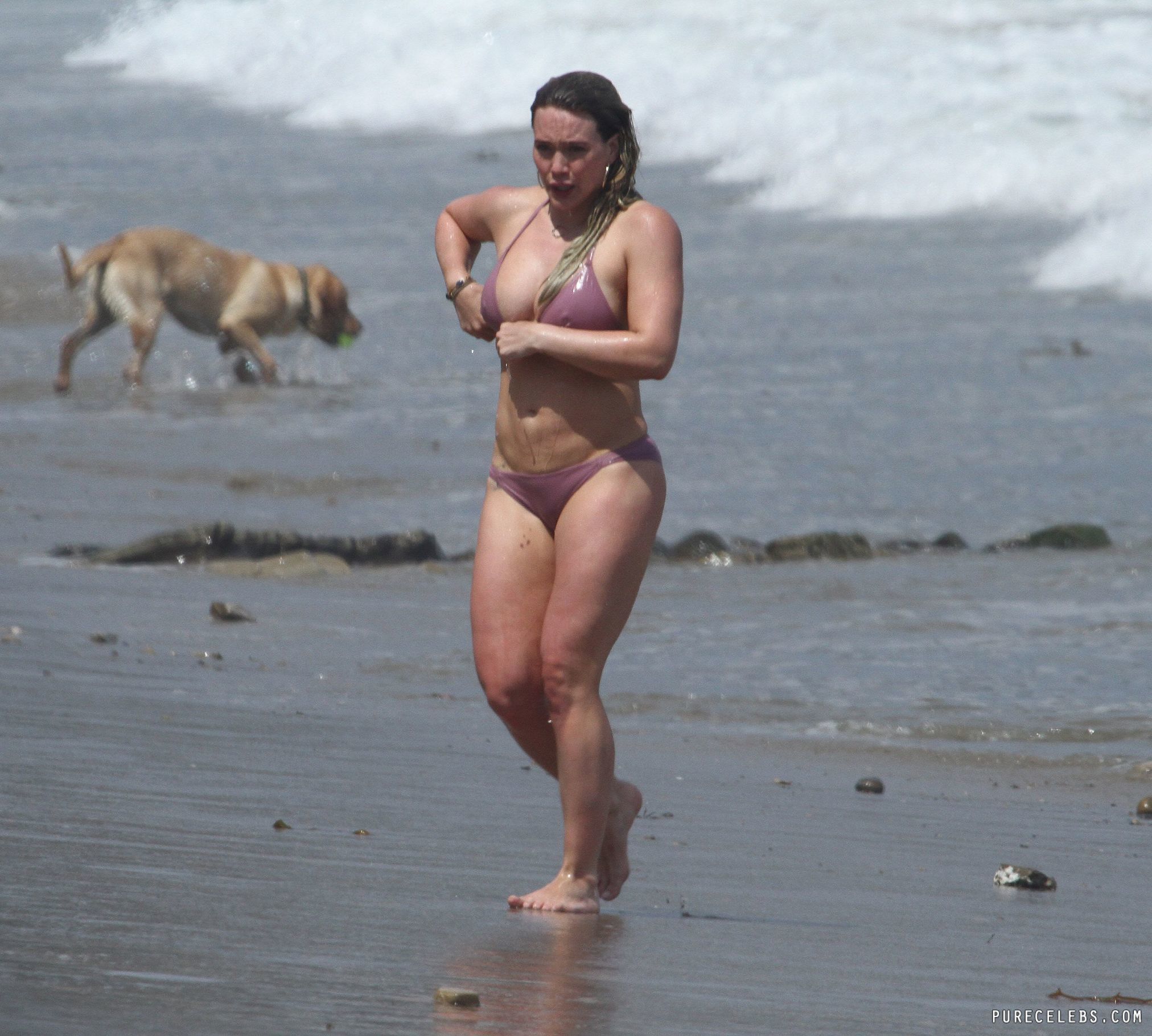 Paparazzi managed to catch the charming blonde Hilary Duff during her beach vacation. The American singer looked very seductive in a small purple bikini. Especially sexy were Hilary Duff’s nude tits in a wet bra, through which her poking nipples were visible. In addition, through her tight-fitting wet panties, the great cameltoe of Hilary Duff was visible.