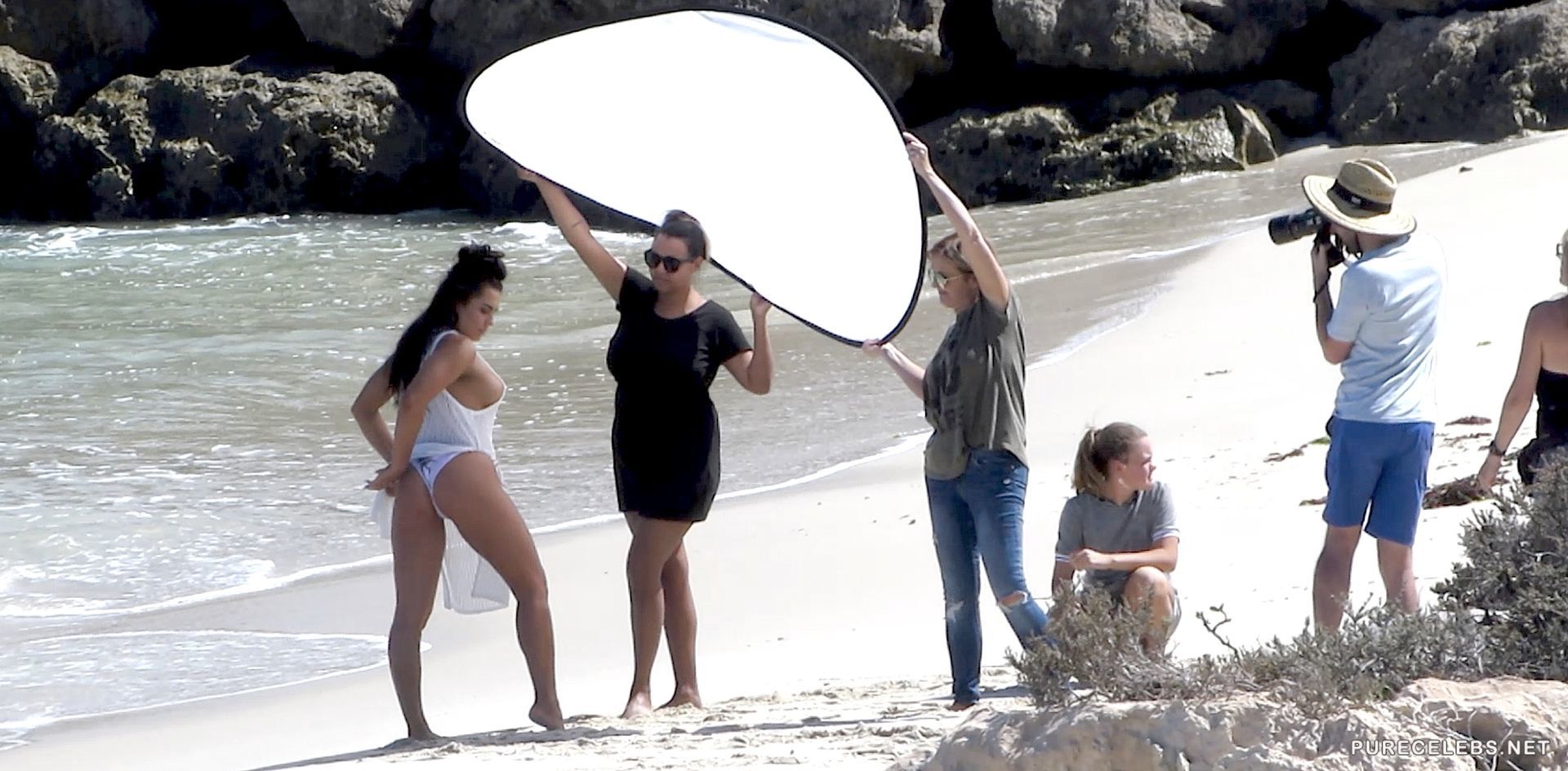 Recently, a stunning model Holly Young took part in a photo shoot showing off her chic curves. The star posed for photographers on the beach dressed in a tiny white bikini. Cute bra slightly covered her huge juicy melons and it seemed that they were about to jump out. Her narrow white thongs emphasized her gorgeous peachy posterior. This beauty looks so sweet, isn’t she?