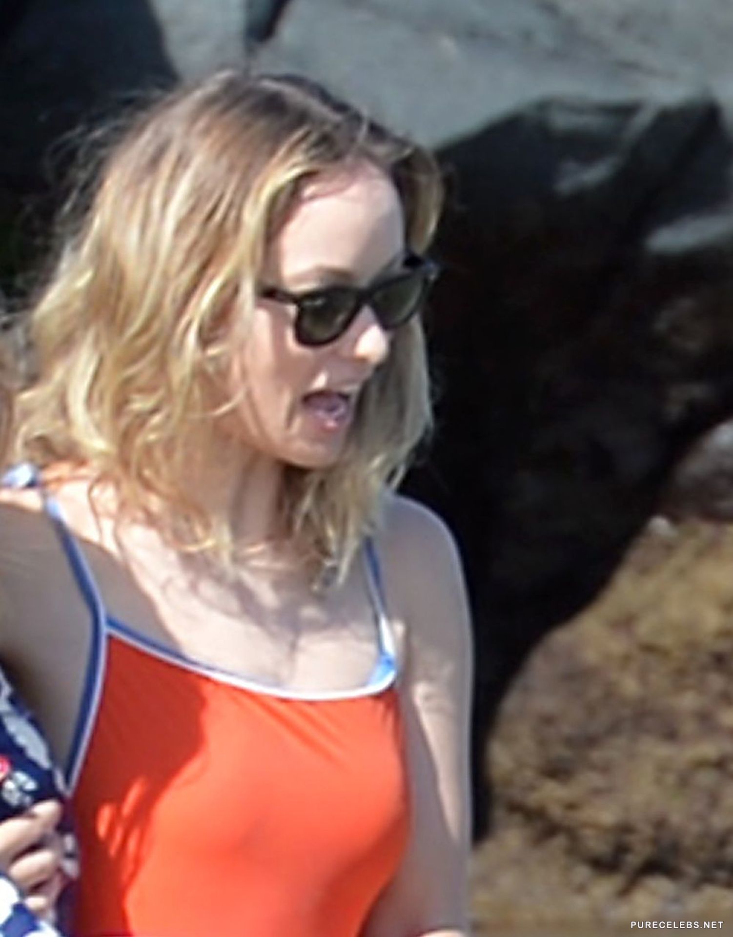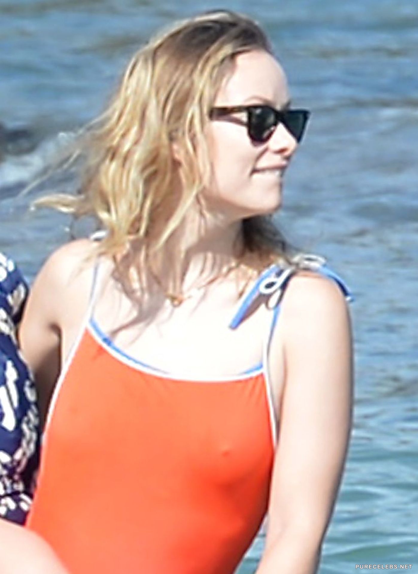 Not long ago, Hollywood actress Olivia Wilde was caught by paparazzi when she was resting on the beach. The celebrity wore a bright red swimsuit and black sunglasses. It was simply impossible to look away from the wonderful curves of her gorgeous body, and especially from her beautiful juicy boobs with poking nipples, which could be seen through her tight swimsuit. And her wonderful buttocks looked just gorgeous!