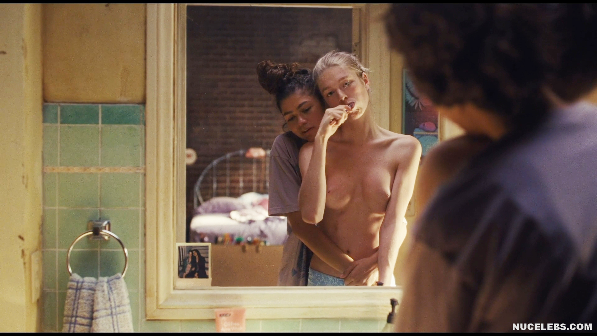 Hunter Schafer did a great job in the Euphoria series, where she showed her nude breasts. It is worth noting that she manages to be not only an excellent fashion model, but also a wonderful actress! Her hot lesbian kissing with a girl will surely ignite your imagination. And in one of the scenes, Hunter Schafer will go topless in the bathroom, flaunting her wonderful buttocks in skimpy panties. Oh, Hunter Schafer nude juicy tits with hard nipples looked very sexy when reflected in the mirror, right?