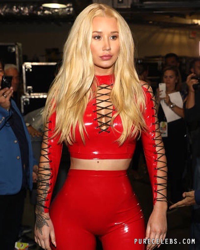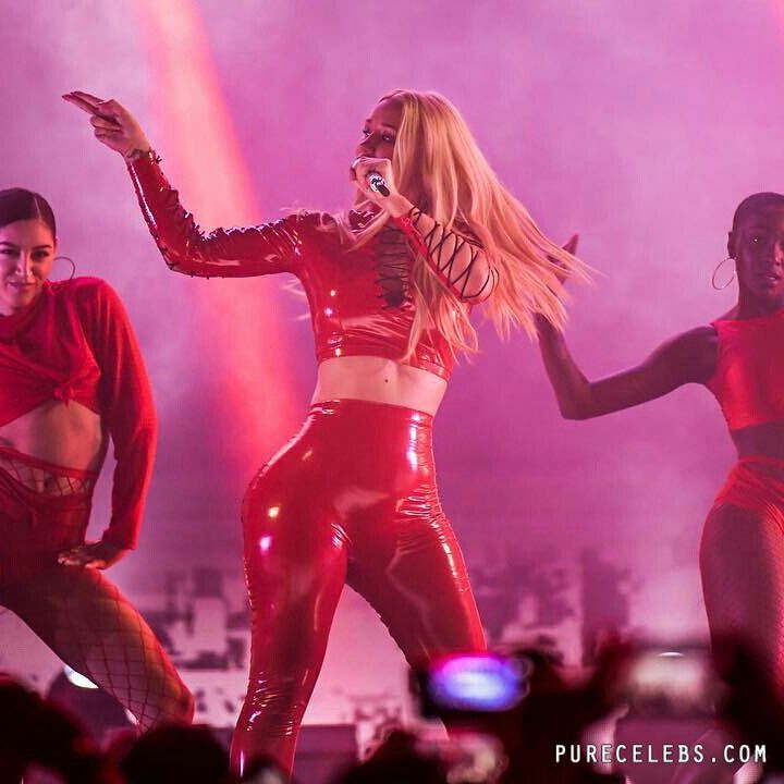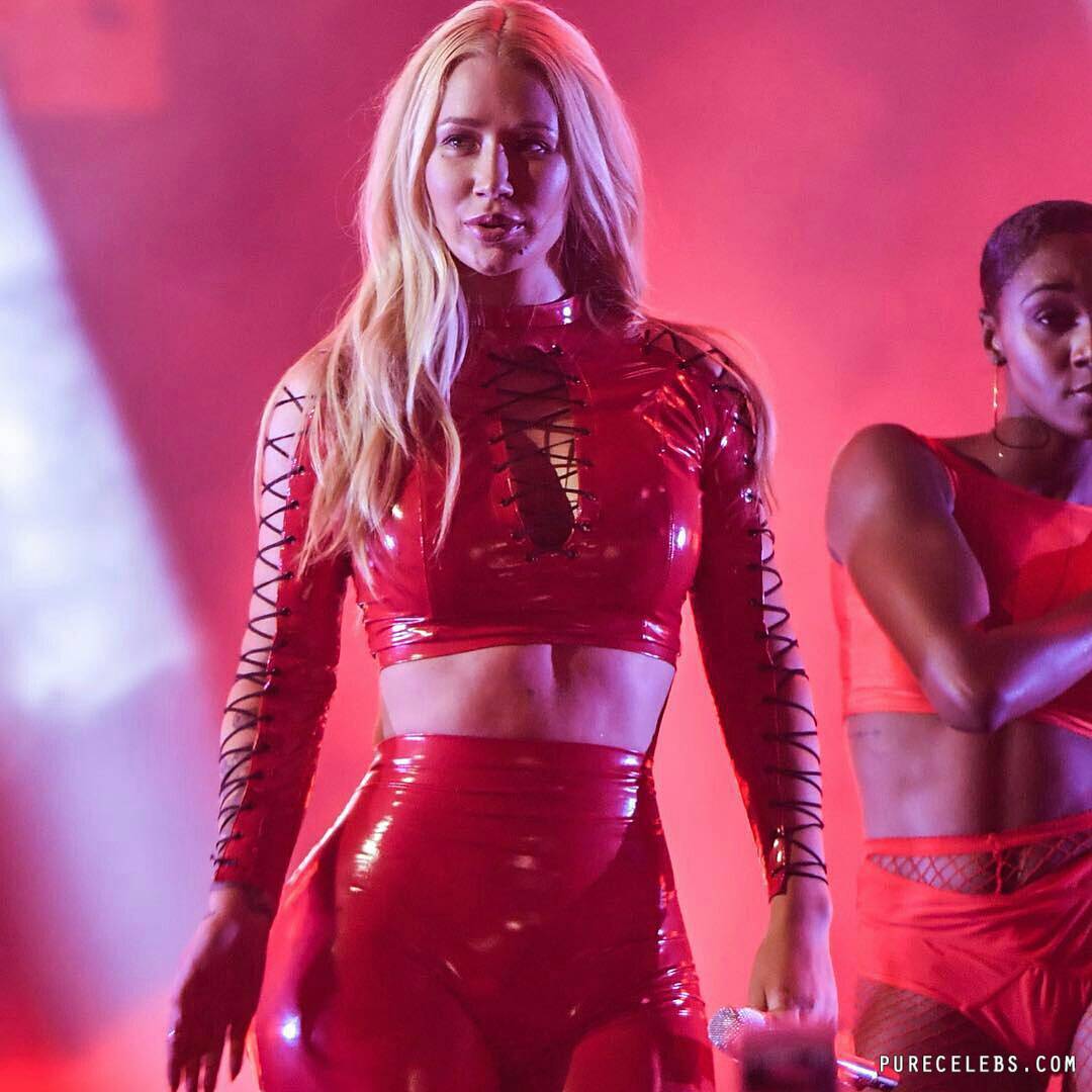 Iggy Azalea, an Australian-American rapper, loves to delight her fans with her sexy outfits during stage performances. For example, at one of her concerts, a celebrity was wearing a red latex top with black lacing. And it is worth noting that her big boobs in it looked very sexy. And you can not resist the Iggy Azalea chic butt, which was almost nude, covered only with thin black laces. The girl shaked her ass and it was an amazing sight!
