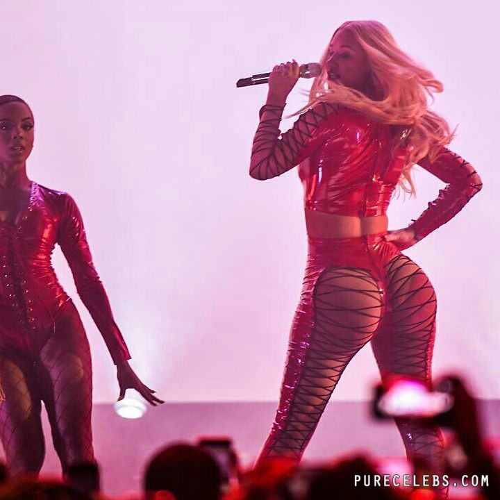 Iggy Azalea, an Australian-American rapper, loves to delight her fans with her sexy outfits during stage performances. For example, at one of her concerts, a celebrity was wearing a red latex top with black lacing. And it is worth noting that her big boobs in it looked very sexy. And you can not resist the Iggy Azalea chic butt, which was almost nude, covered only with thin black laces. The girl shaked her ass and it was an amazing sight!
