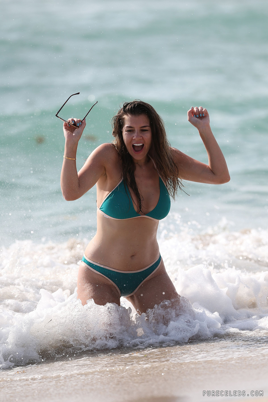 One of our favorite Welsh model and television personality is showing us her enjoyment when she wears blue bikini and having fun in the water, on the hot sunny day, in front of the beach. While splashing water around her, she is getting wet, and you can notice smile on her face because she is enjoying getting wet. Although she hides her attributes with her swim suit, none the less we can notice how attractive she is.