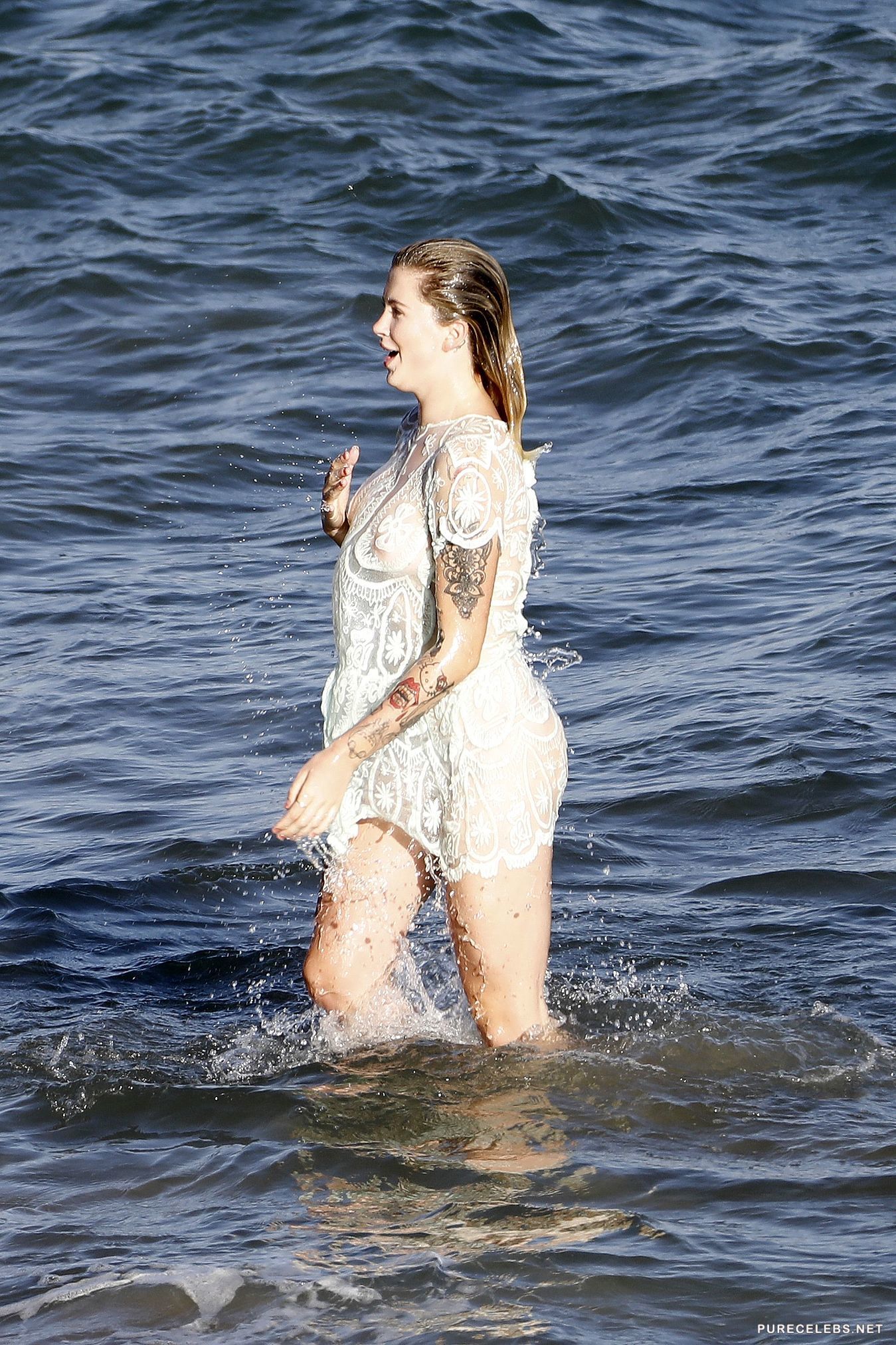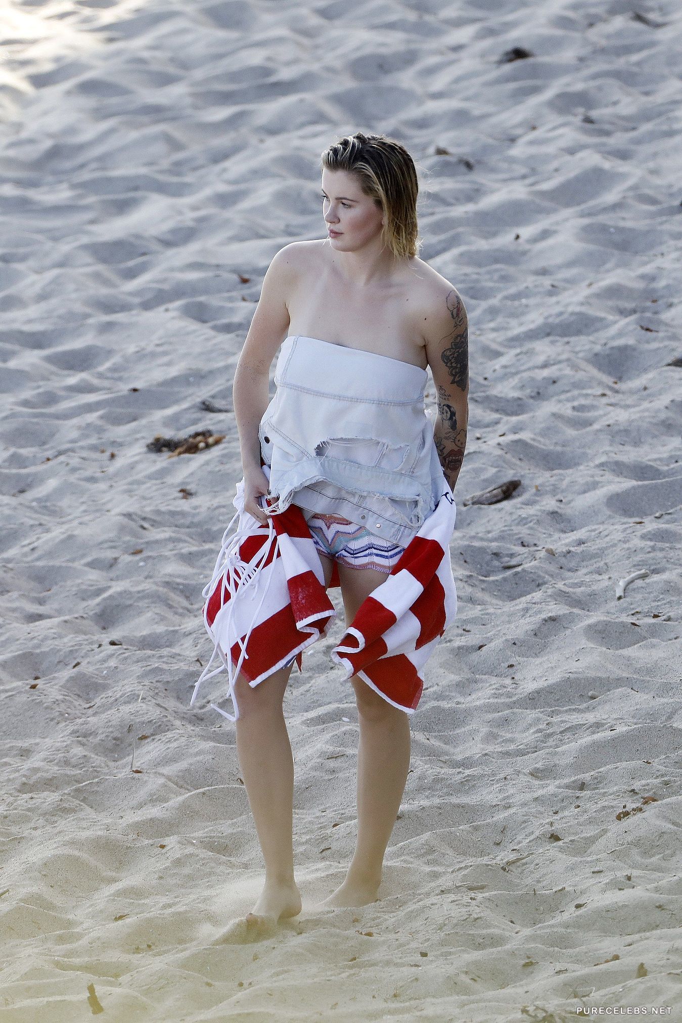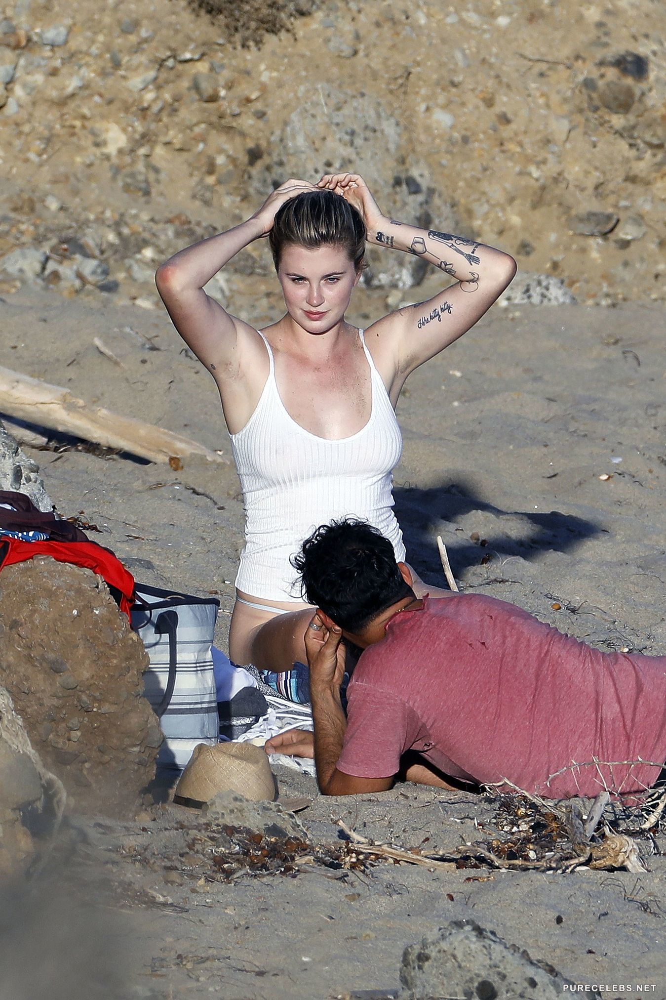 Being daughter of Alec Baldwin and Kim Basinger, she got hot looks from her mother, which Ireland Baldwin used to become successful actress and fashion model. She was signed with IMG Models and later appeared in W Magazine, Vanity Fair, DuJour and many others. These pictures show Ireland posing on the beach, showing off her amazing body, big tits and nice ass, while wearing see through shirt or just going around being topless.