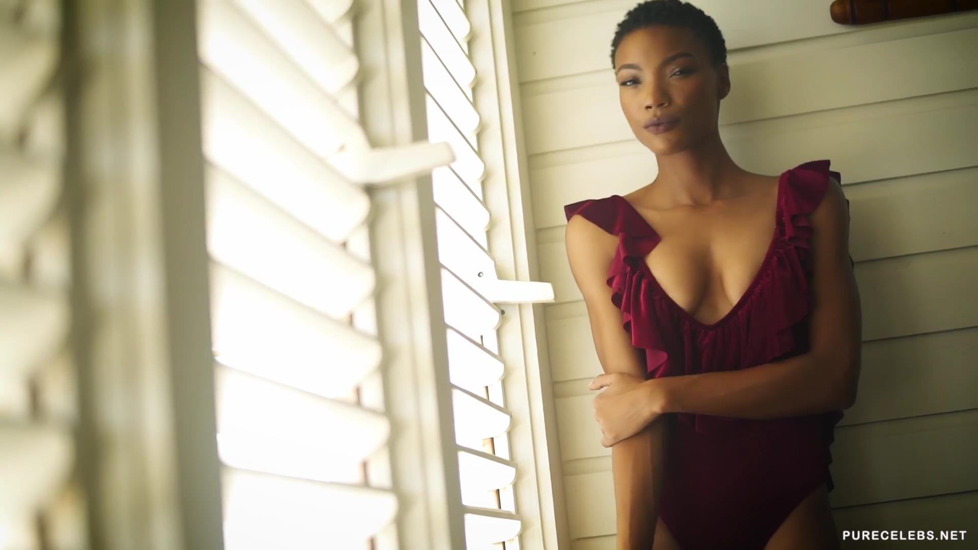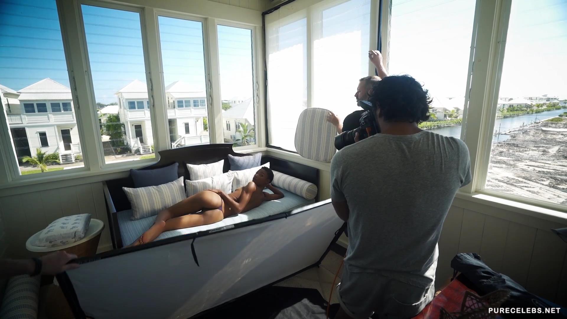 It is always fun to see a new face among all the lovely ladies posing for Sports Illustrated magazine. The newcomer we are going to feature today is the gorgeous ebony babe, Iyonna Fairbanks. This dark skinned babe posed in the smallest bikini you can imagine, playfully smiling for the camera. And she looks absolutely stunning lying on a bed wearing only a little purple thong.