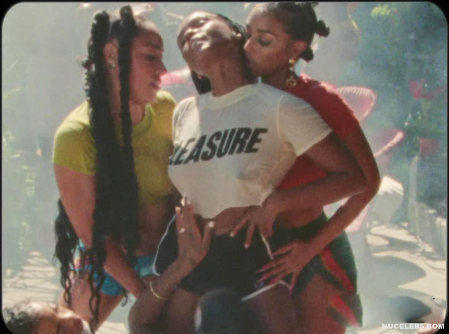 You will howl with delight, looking at Janelle Monáe nude huge boobs in Lipstick Lover! This internet celebrity enjoyed teasing everyone with her huge melons shining through a white wet T-shirt when she came out of the pool. But she decided not to stop there and also decided to pose topless. Janelle Monáe nude tits looked damn sexy when she sat at a woman’s feet and smoked a cigar. By the way, her passionate lesbian kisses will also make your heart beat faster!