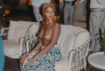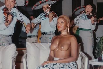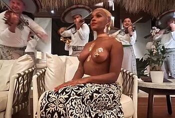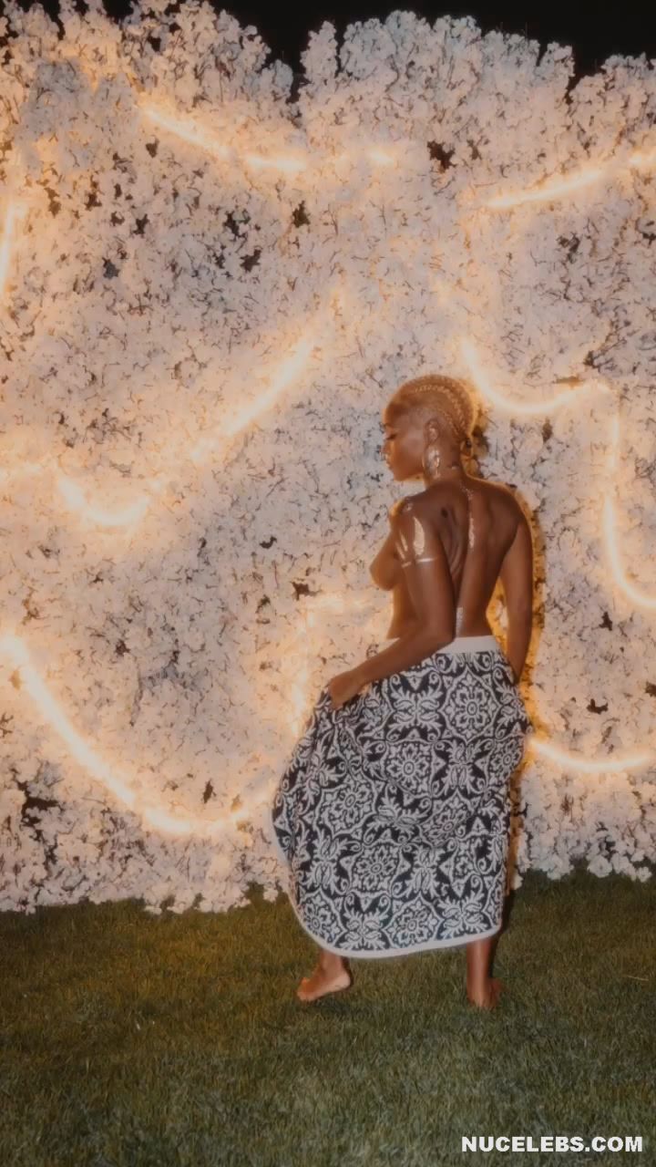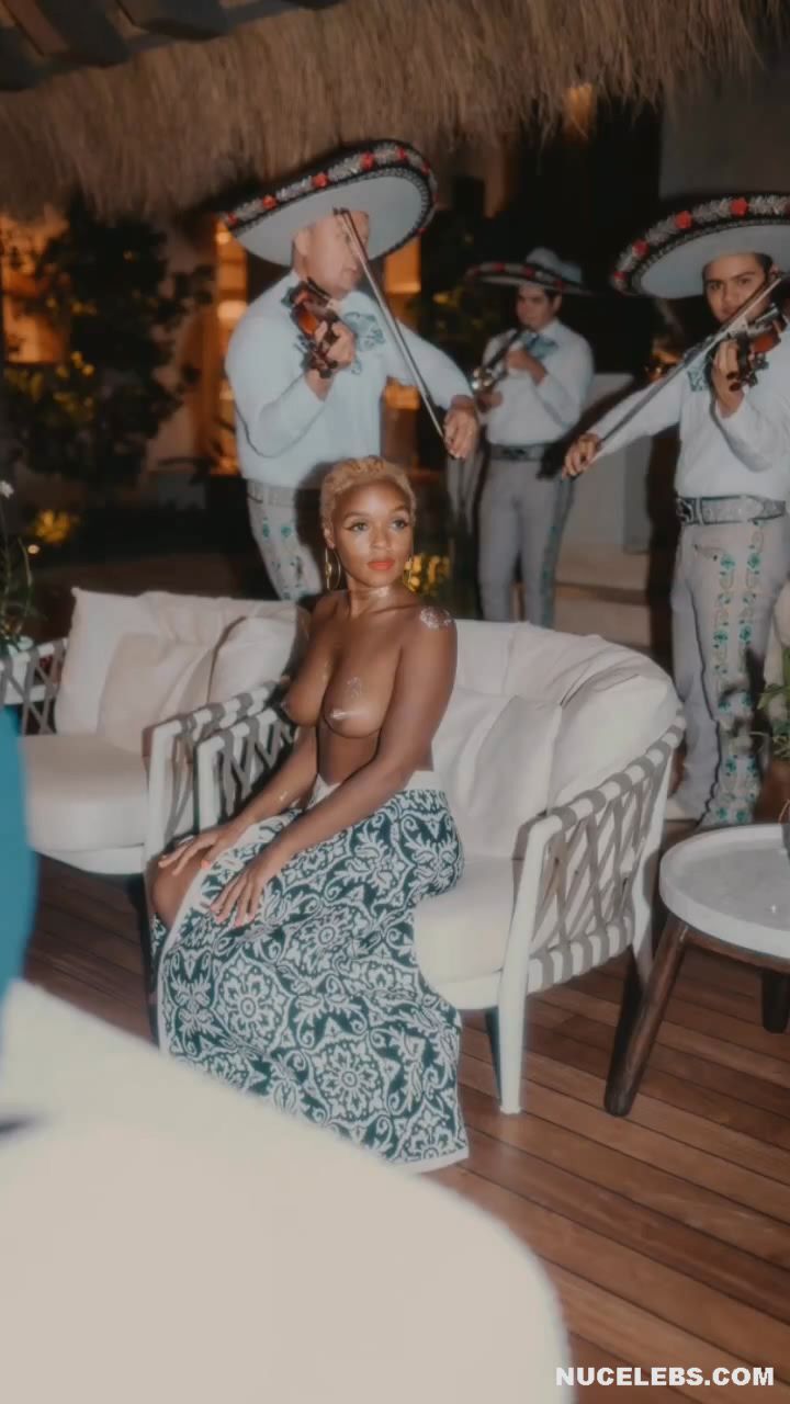 Graceful and radiant, Janelle Monae exudes an aura of timeless beauty. This LGBT activist is also not shy about posing topless. So, Janelle Monae showed her nude tits during one of the performances. The singer, dressed in a black and white long skirt, was sitting on a chair, and musicians were standing nearby with violins in their hands. Janelle Monae’s nude breasts were painted with silver patterns and this made them even more seductive.