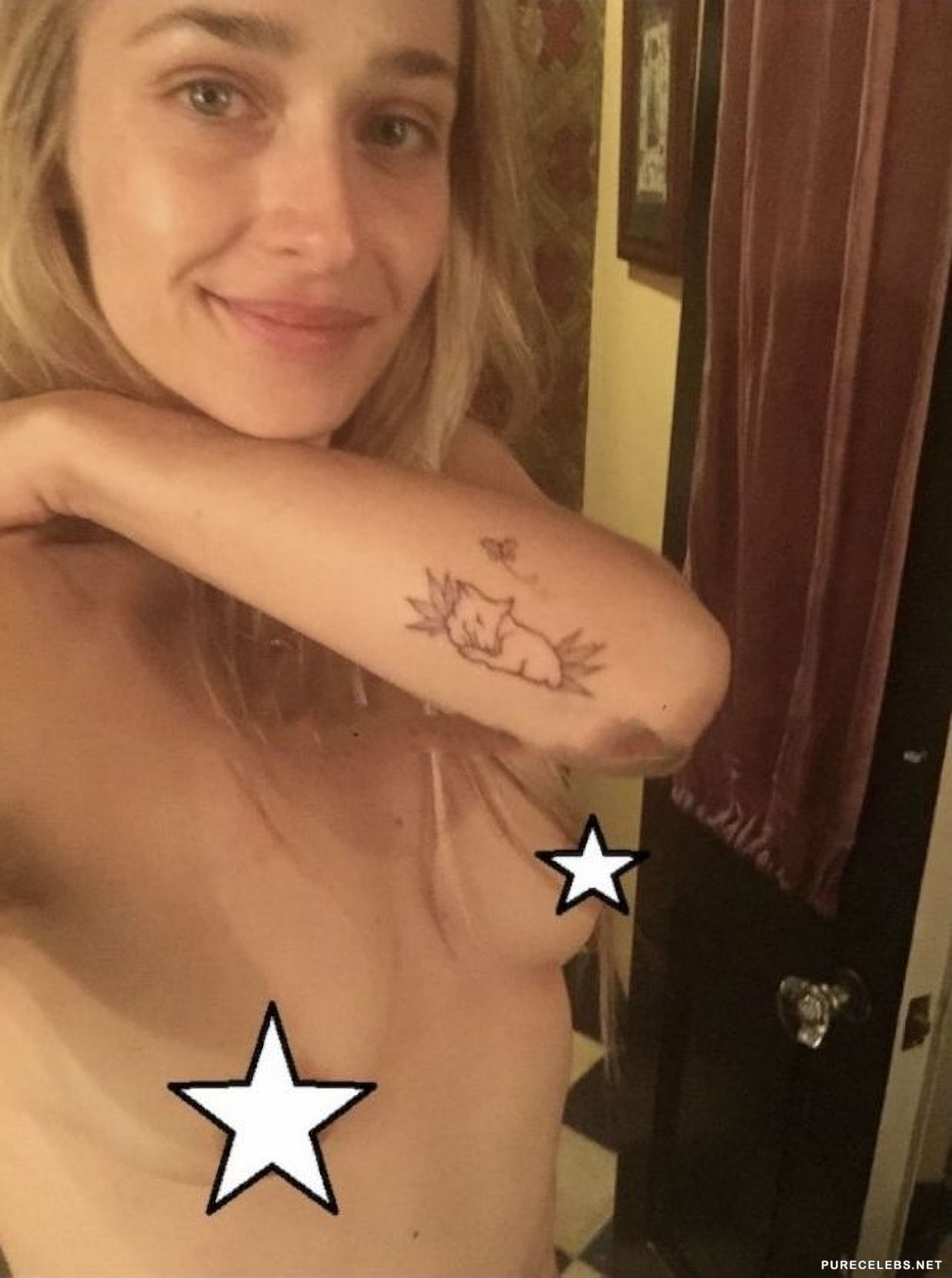 A few days ago the fappening photos of Jemima Kirke were leaked. Actually, the actress wanted to demonstrate her new tattoo on her arm. But when she was photographed, she did not calculate that her bare breasts could get into the camera lens. The star is cute smiling at the camera and we can admire her wonderful round boobs with hard nipples.