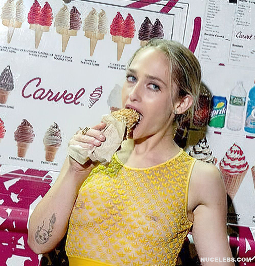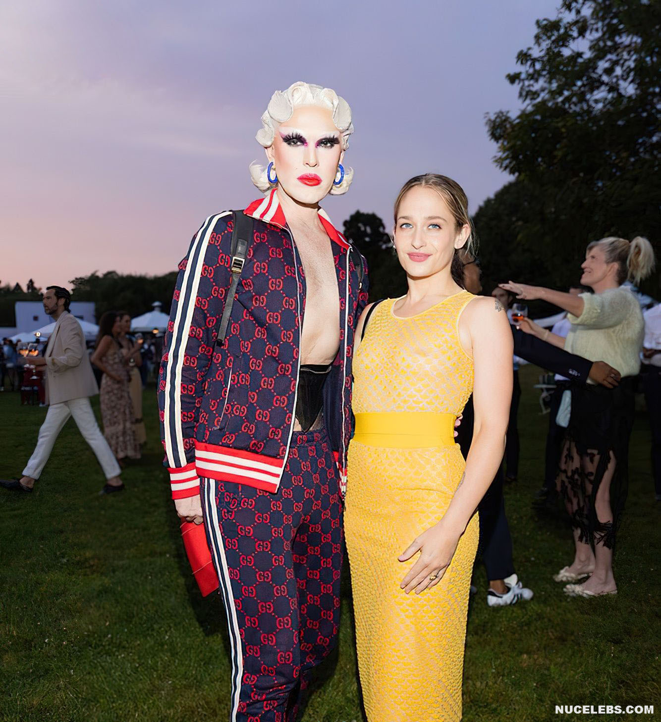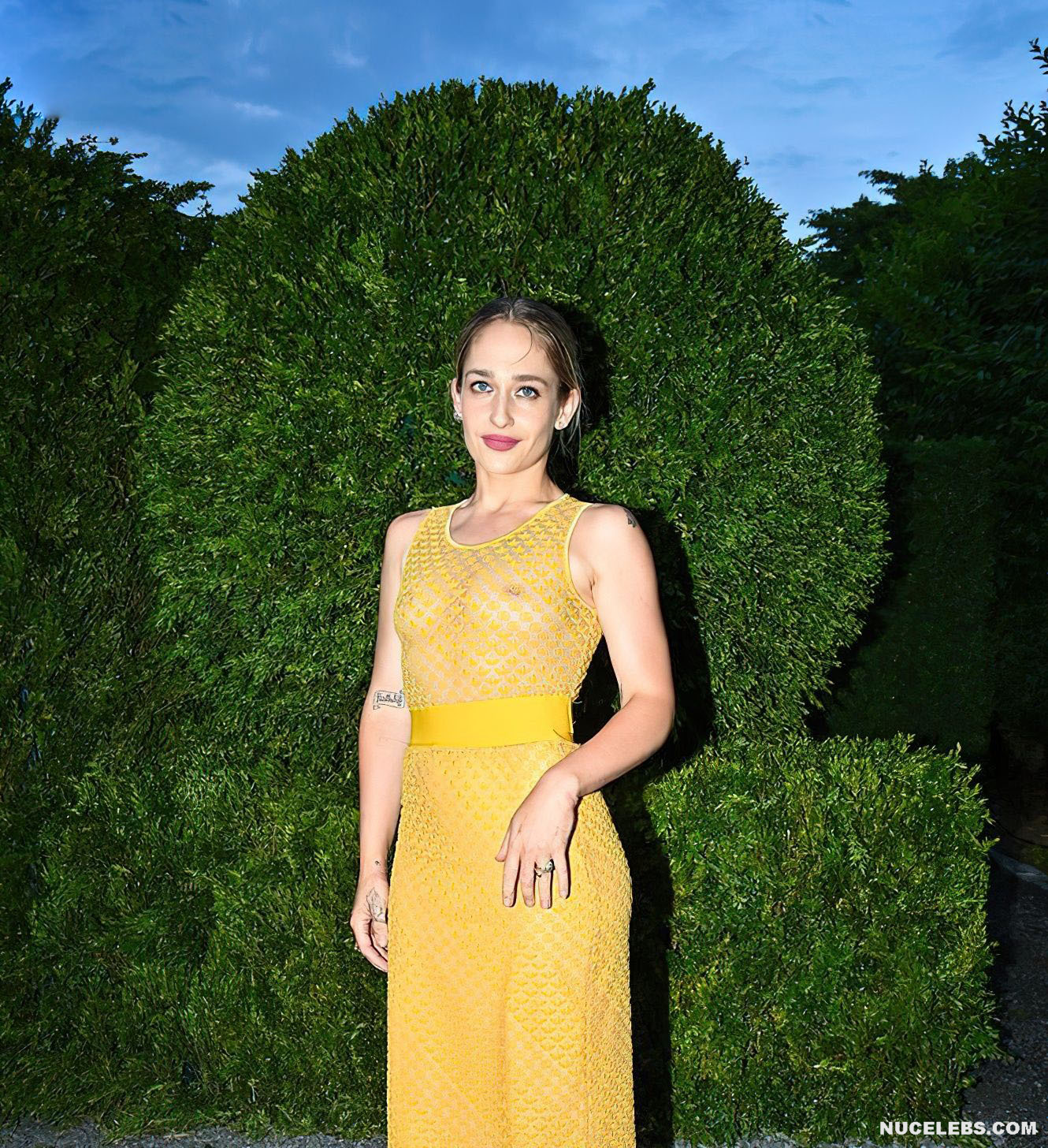 Jemima Kirke’s ability to effortlessly carry herself in various outfits adds to her magnetism and allure. At times, Jemima Kirke even shows parts of her naked body to the public. As, for example, it happened at one of the events where she appeared in a yellow dress. The dress had a small embroidered print on transparent fabric. And this celebrity was braless, so her top was practically not covered. So all the attention of the paparazzi was focused on Jemima Kirke nude tits with small dark nipples.
