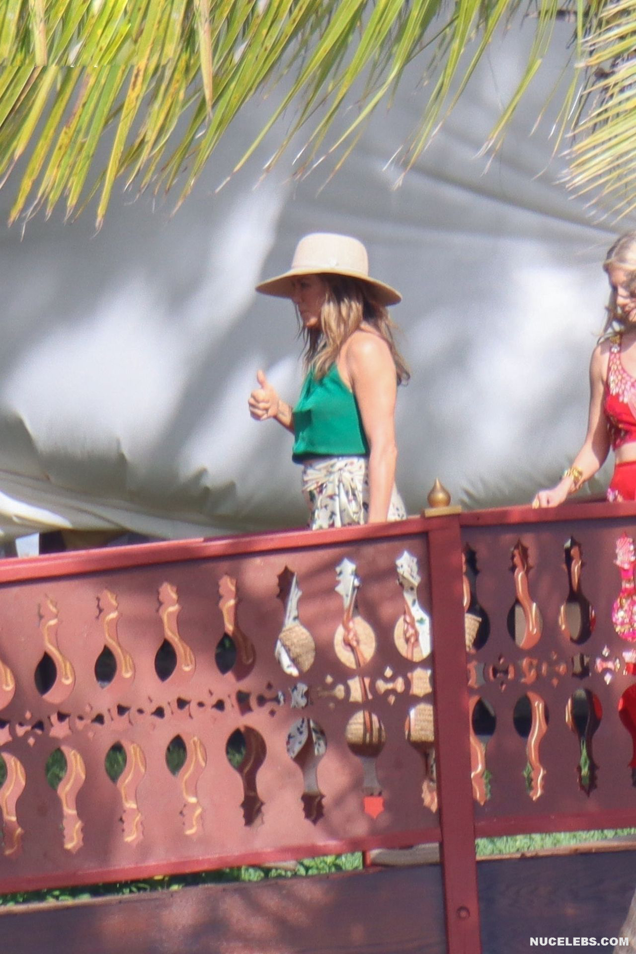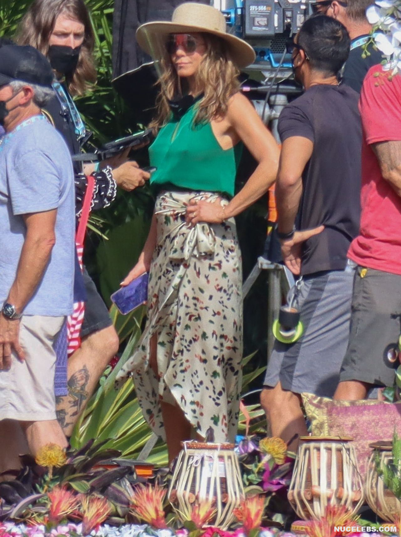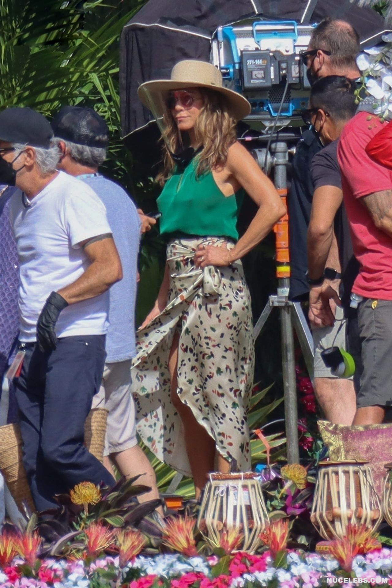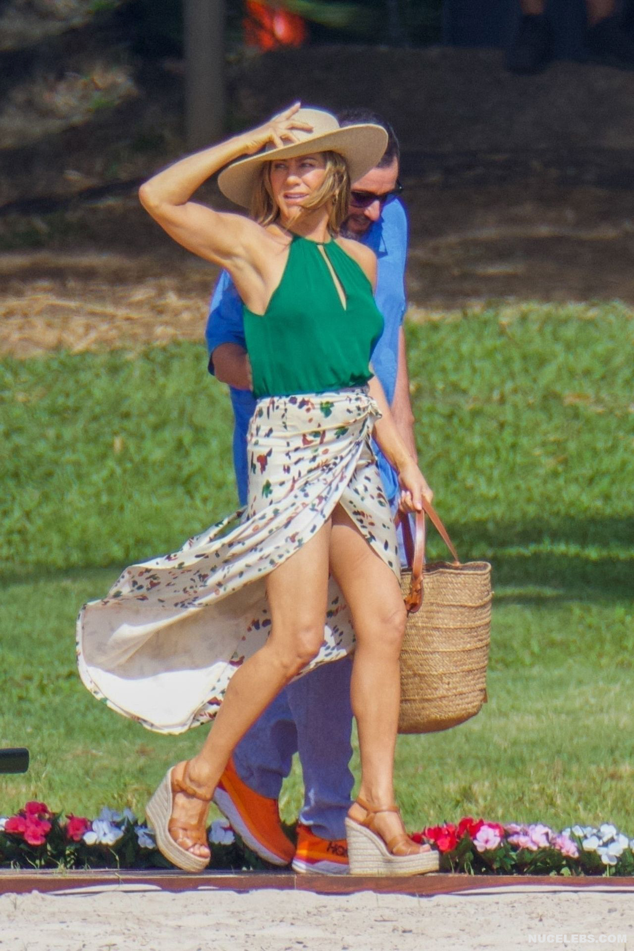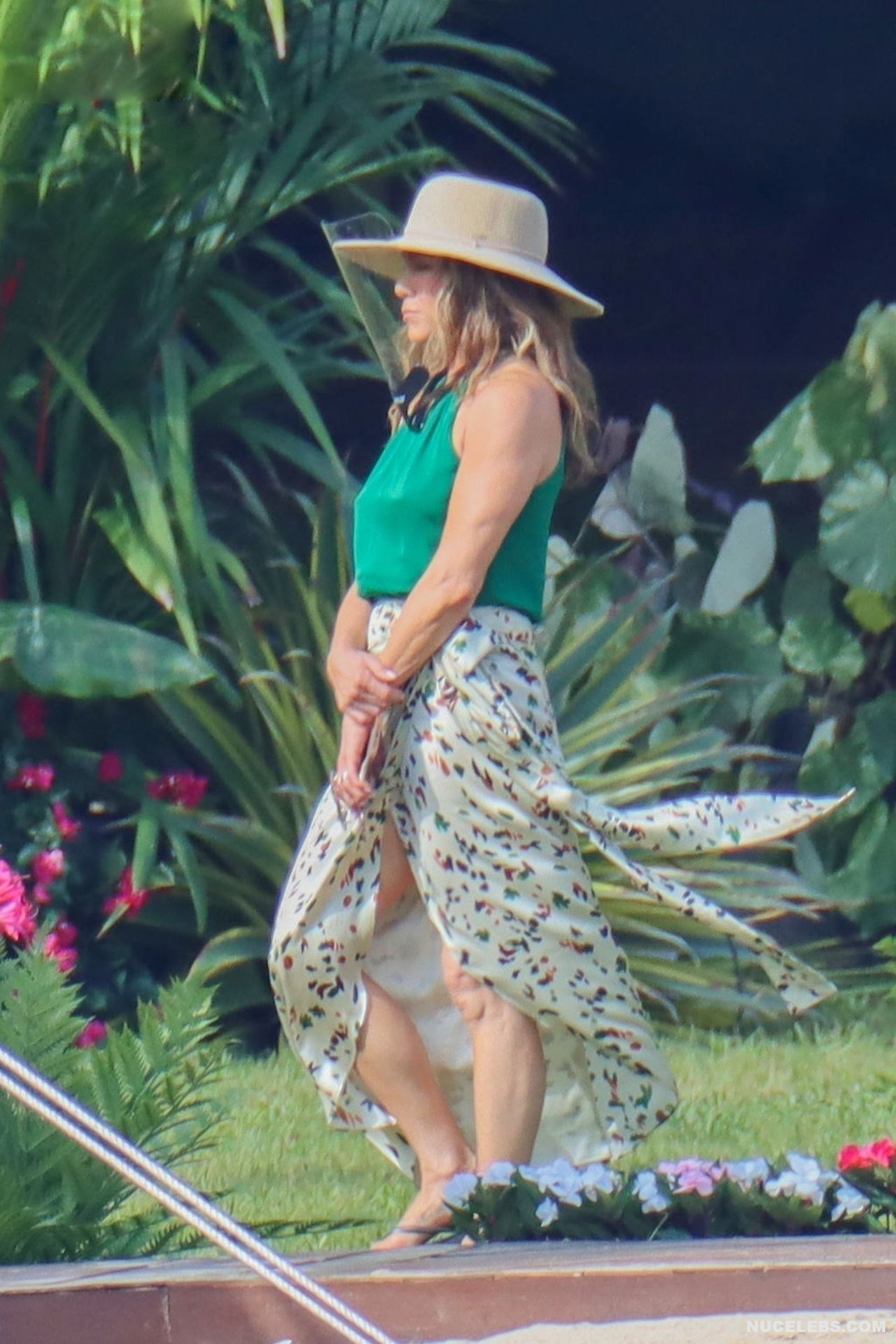 Despite the fact that she has a great figure for her age, Jennifer Aniston is in no hurry to show nude. Although the paparazzi who constantly follow her managed to make some hot shots. So, they filmed this Hollywood actress walking near the palm trees. The celebrity was wearing a cute green top that showed her poke nipples. In addition, Jennifer Aniston’s long skirt opened to the sides in a gust of wind and her small panties became visible to everyone, hiding her nude pussy!