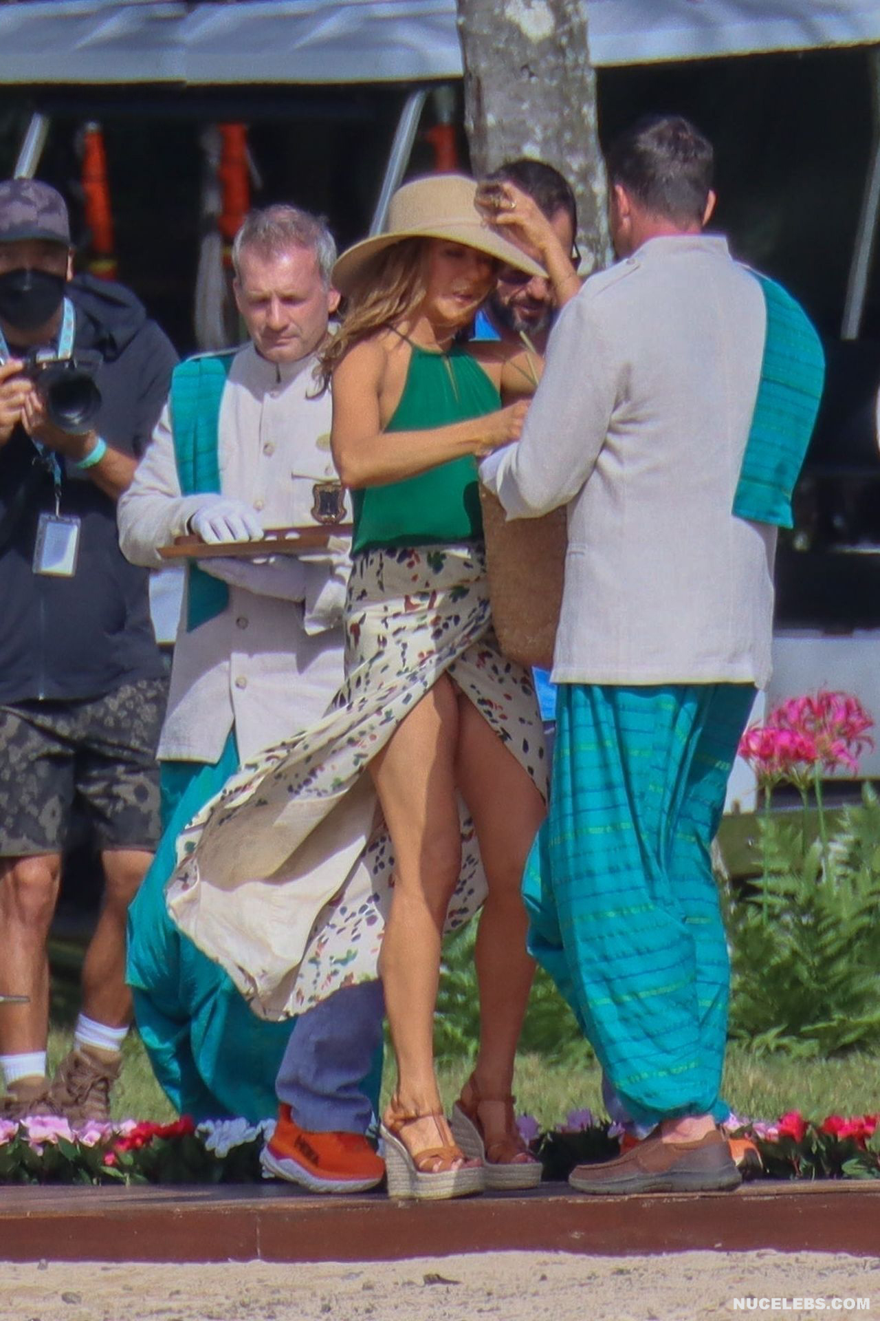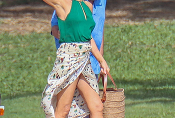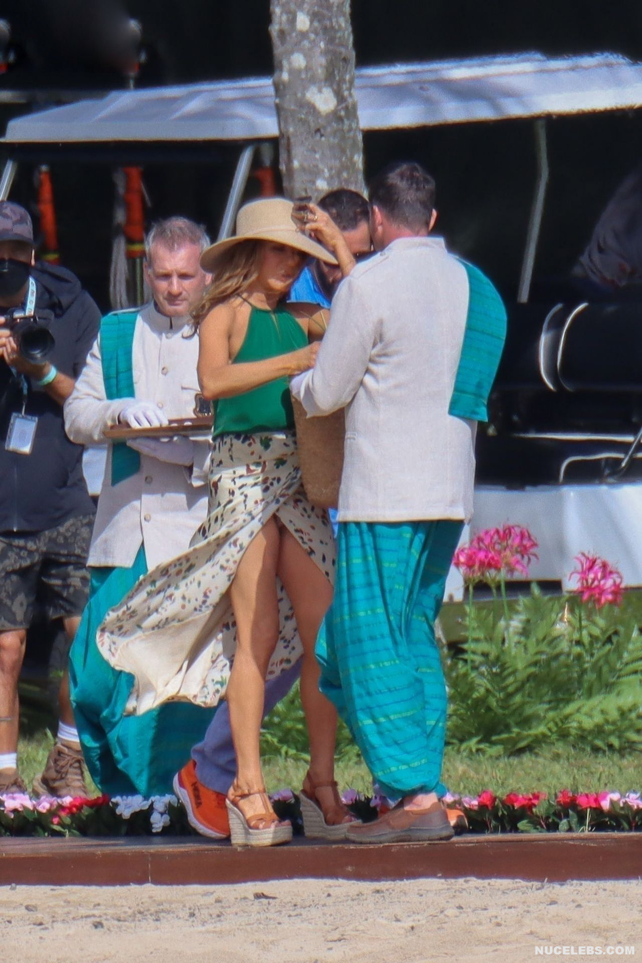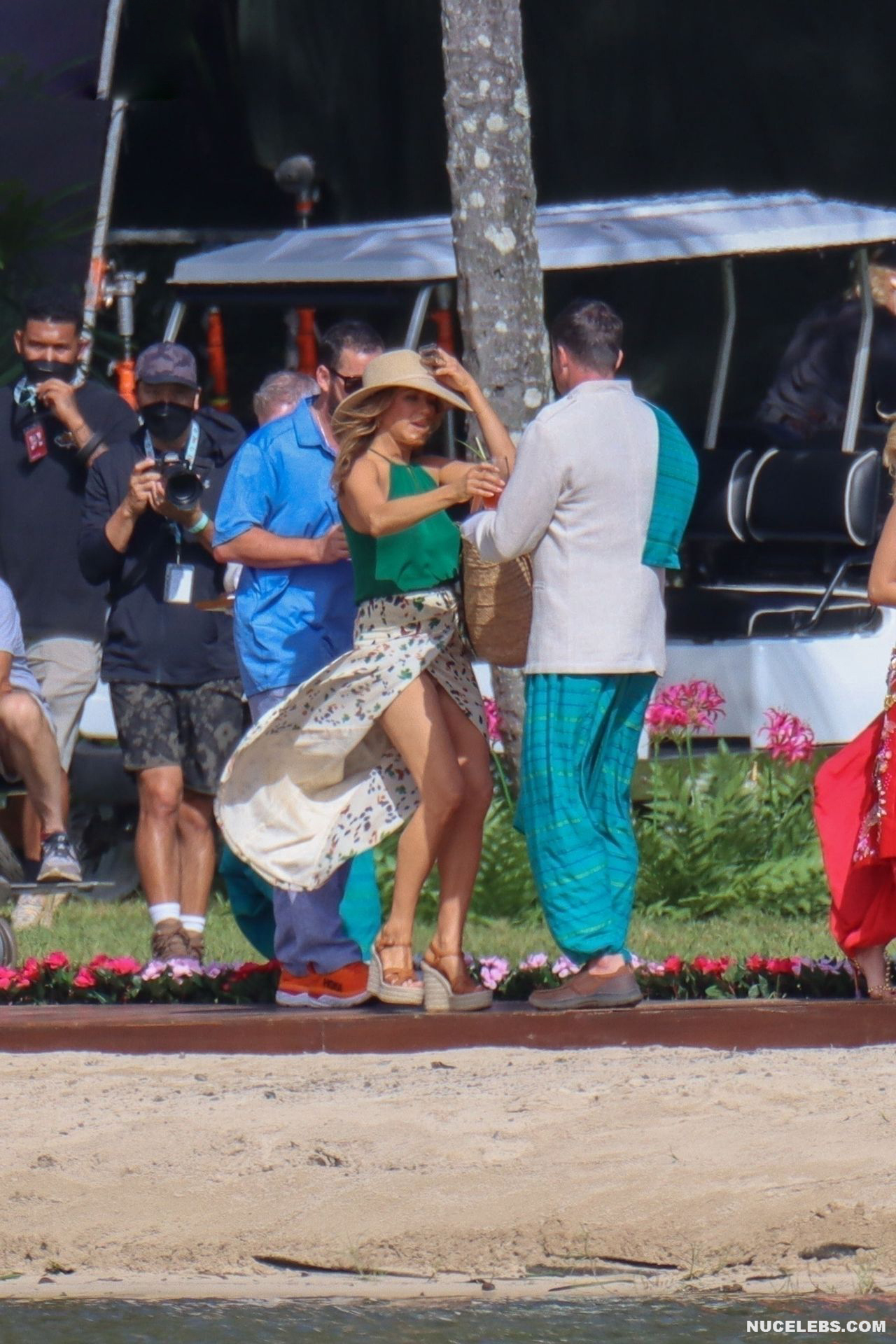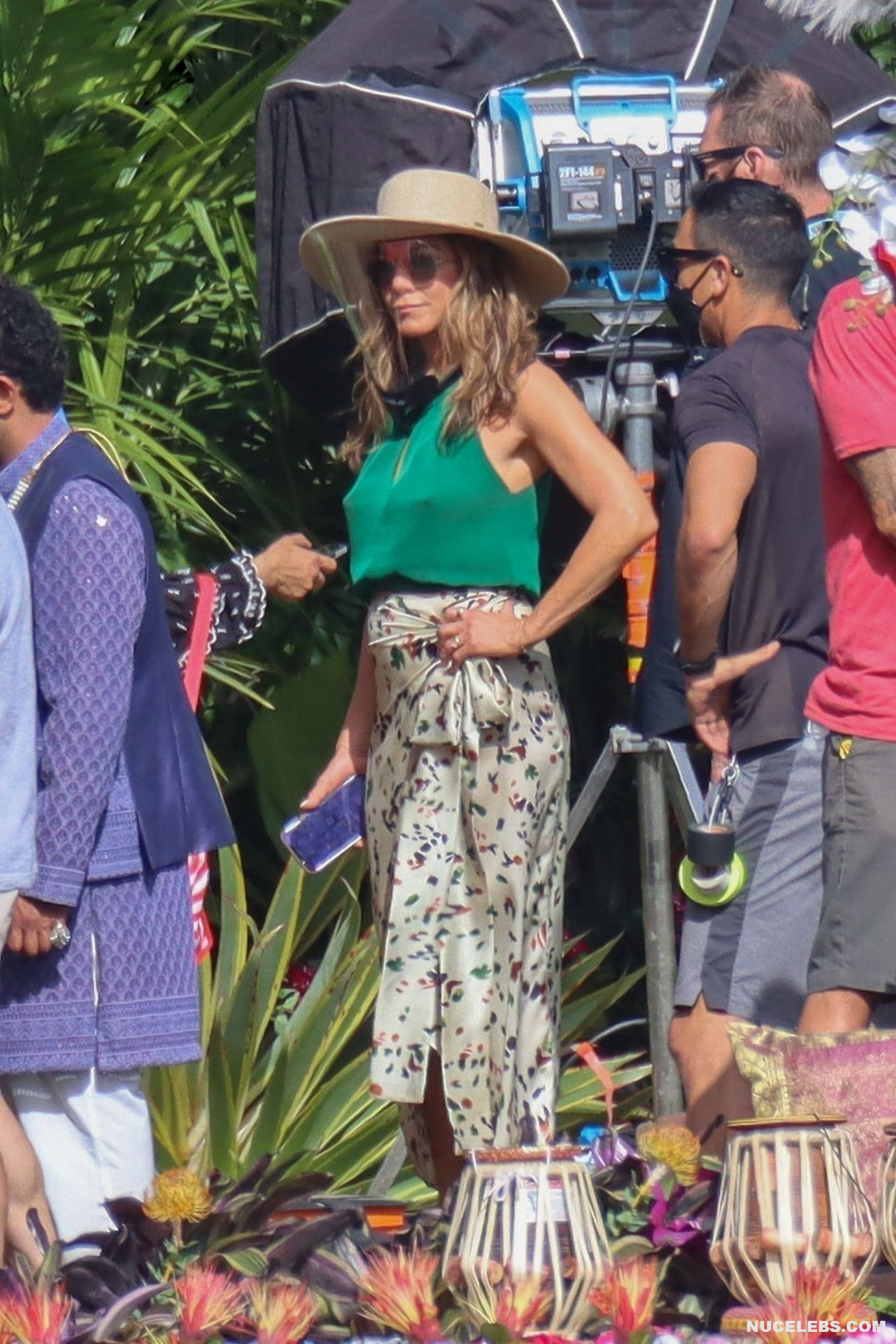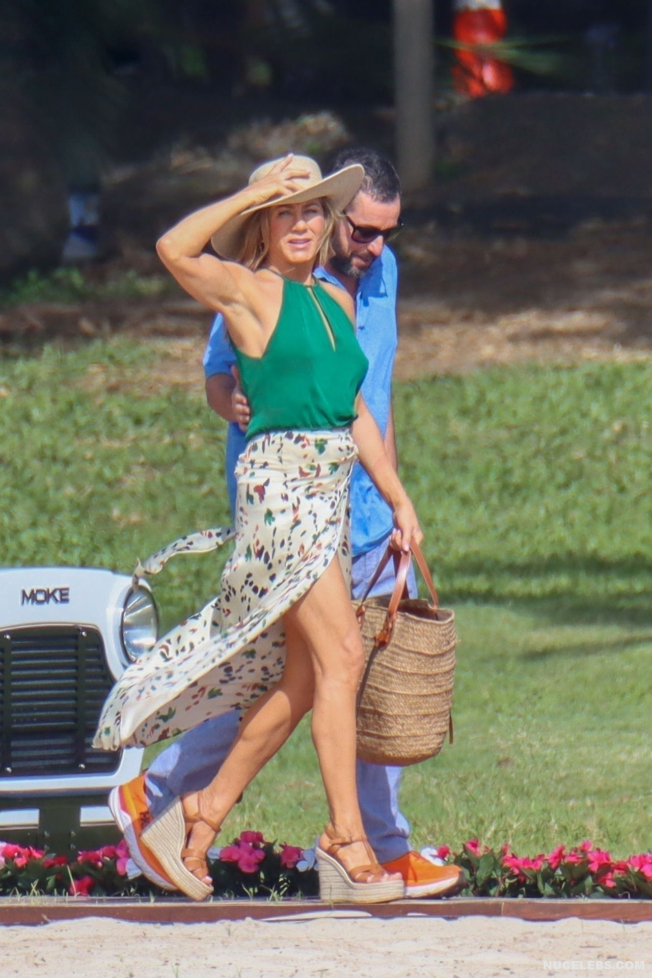 Despite the fact that she has a great figure for her age, Jennifer Aniston is in no hurry to show nude. Although the paparazzi who constantly follow her managed to make some hot shots. So, they filmed this Hollywood actress walking near the palm trees. The celebrity was wearing a cute green top that showed her poke nipples. In addition, Jennifer Aniston’s long skirt opened to the sides in a gust of wind and her small panties became visible to everyone, hiding her nude pussy!