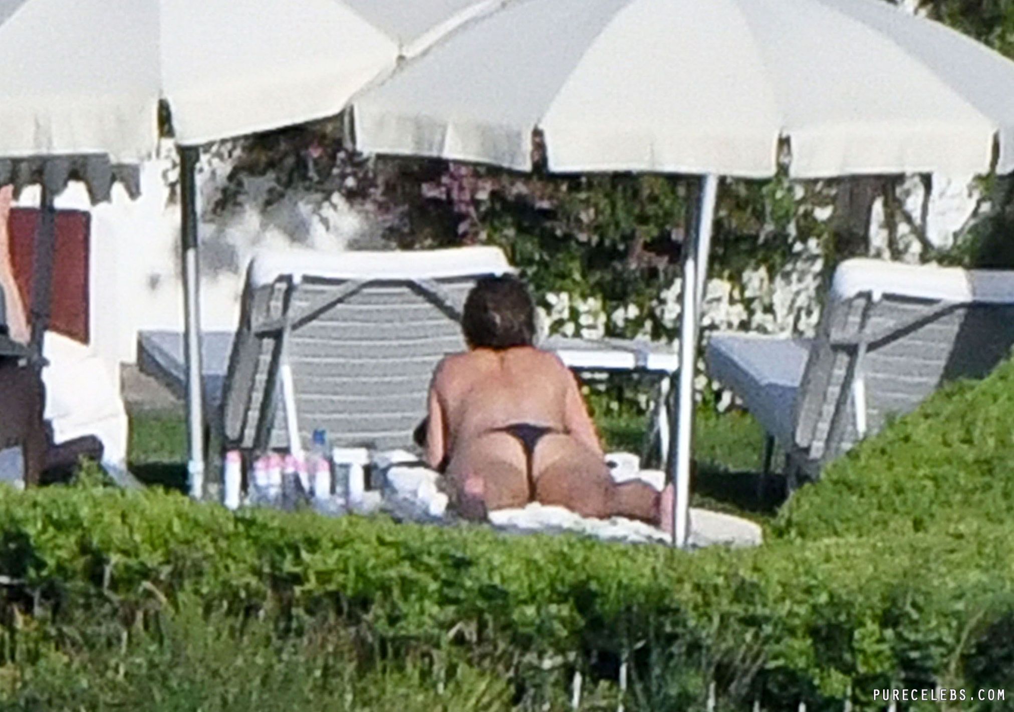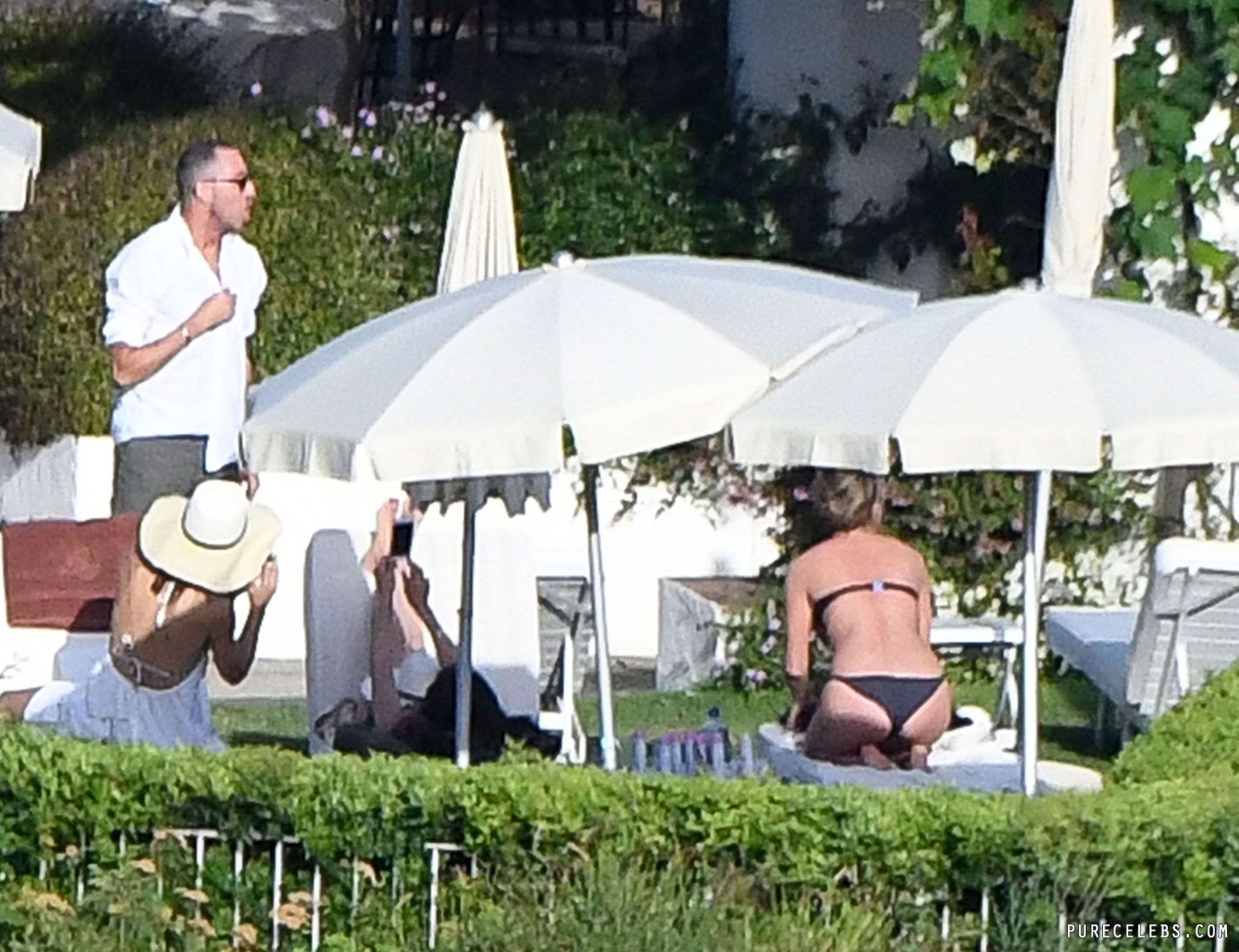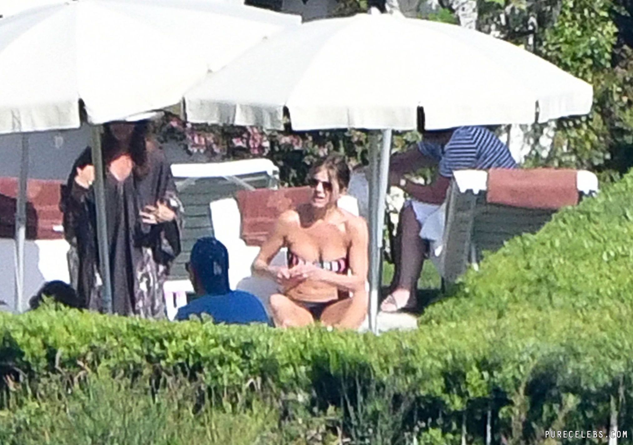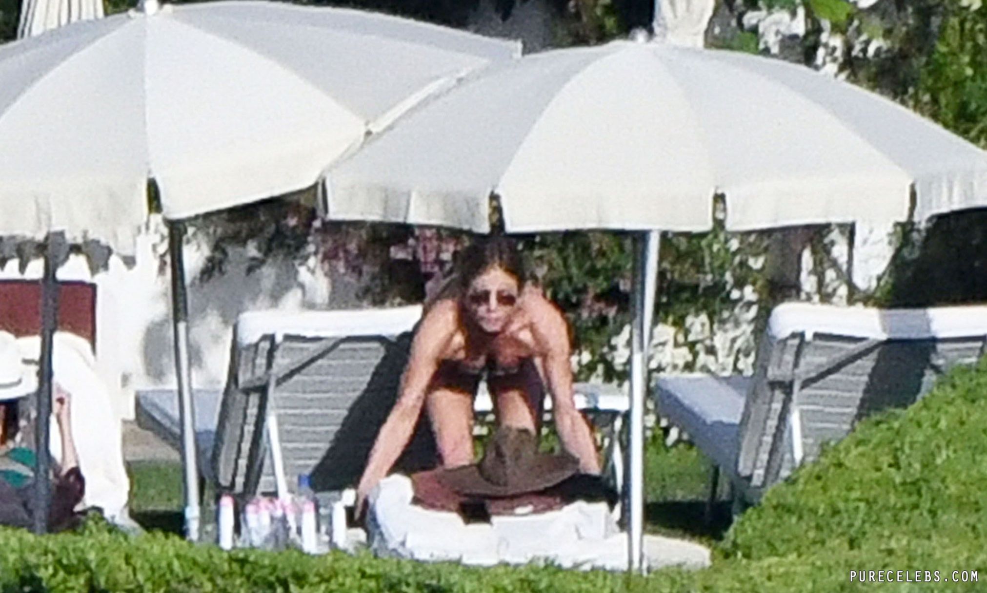 It seems like American actress Jennifer Aniston was caught off guard while on vacation judging by these candid bikini photos. Sneaky paparazzi snapped a whole gallery of celebrity pictures that will make your mouth water. Now a MILF, Jennifer still looks hot, especially when she starts showing off her ass while wearing a little black thong, and trying to get an even sun tan out by the pool.