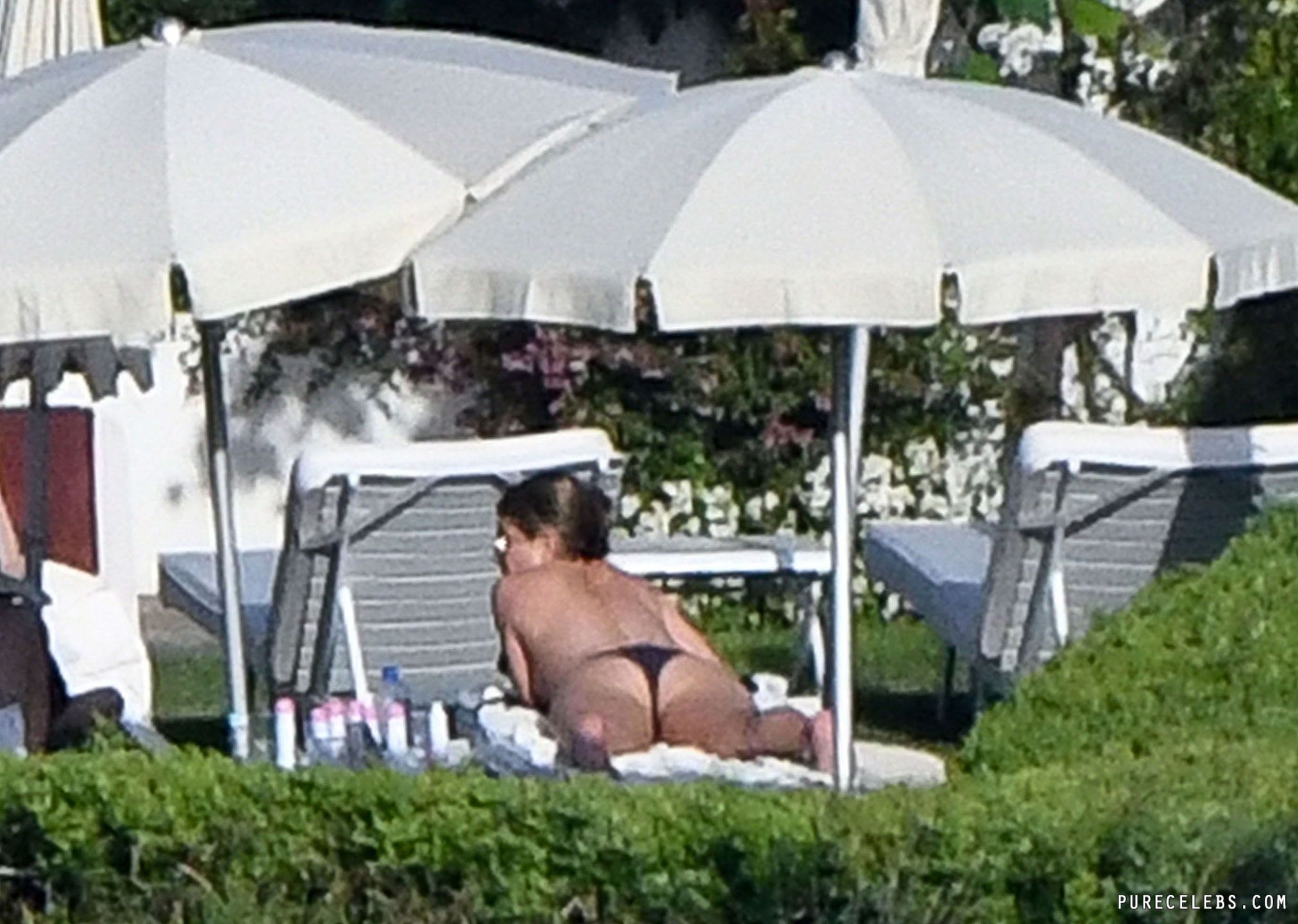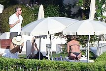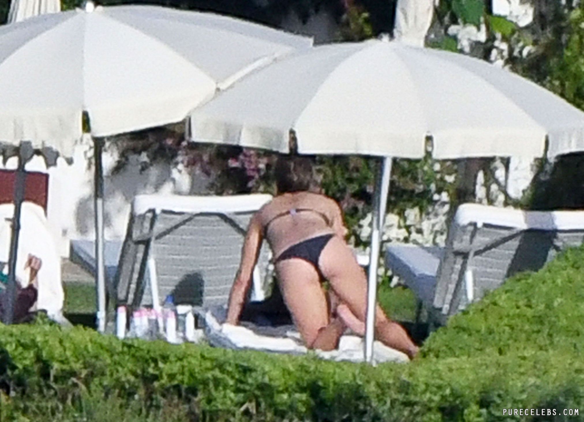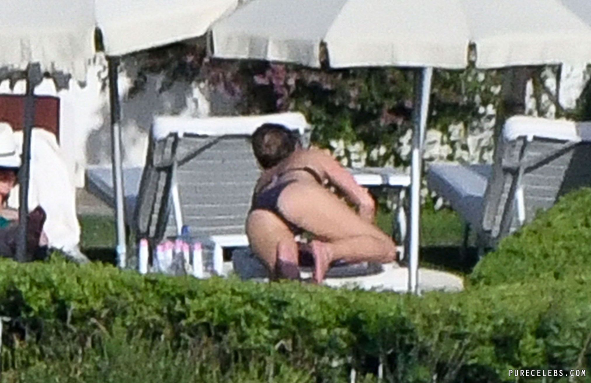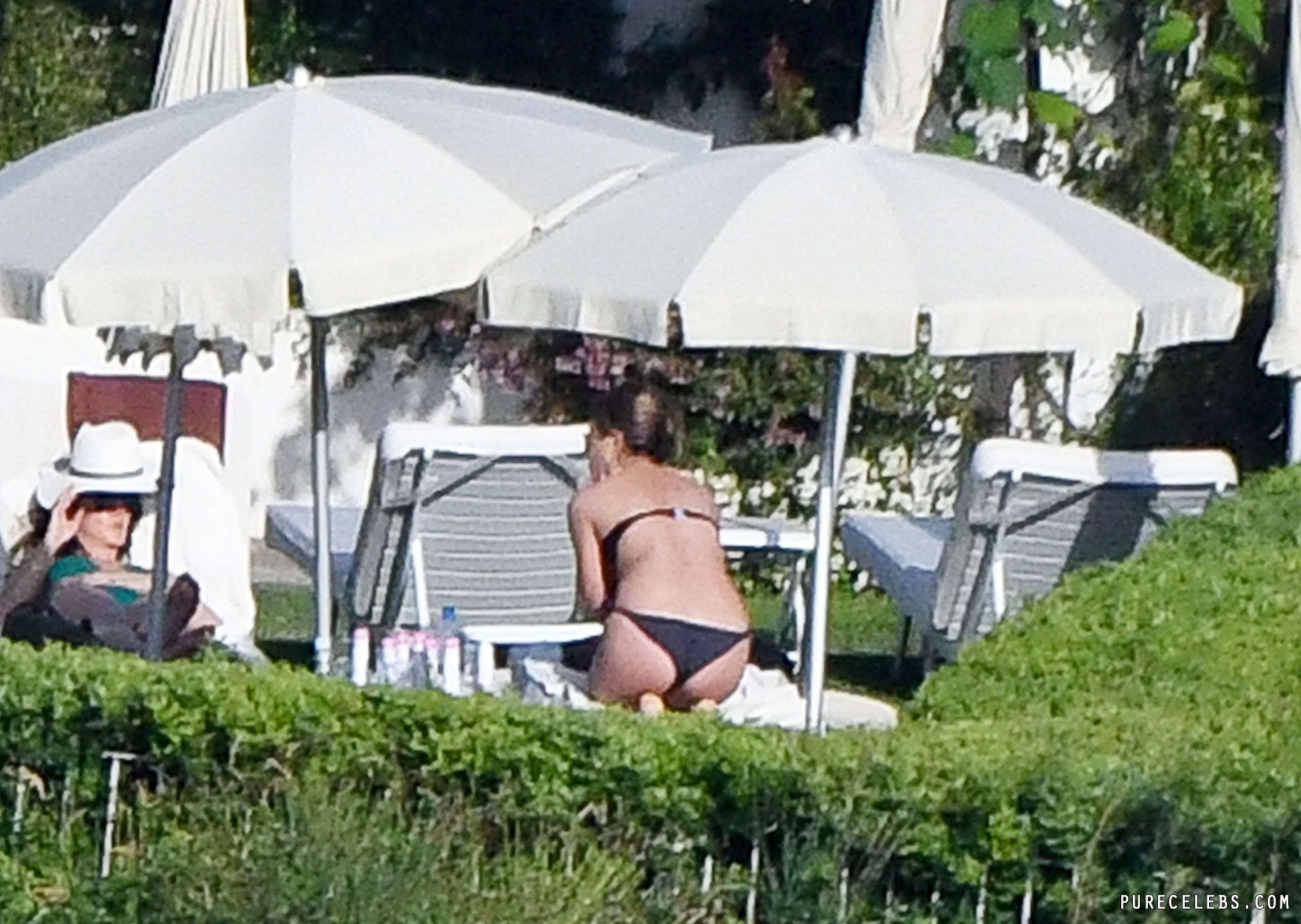 It seems like American actress Jennifer Aniston was caught off guard while on vacation judging by these candid bikini photos. Sneaky paparazzi snapped a whole gallery of celebrity pictures that will make your mouth water. Now a MILF, Jennifer still looks hot, especially when she starts showing off her ass while wearing a little black thong, and trying to get an even sun tan out by the pool.