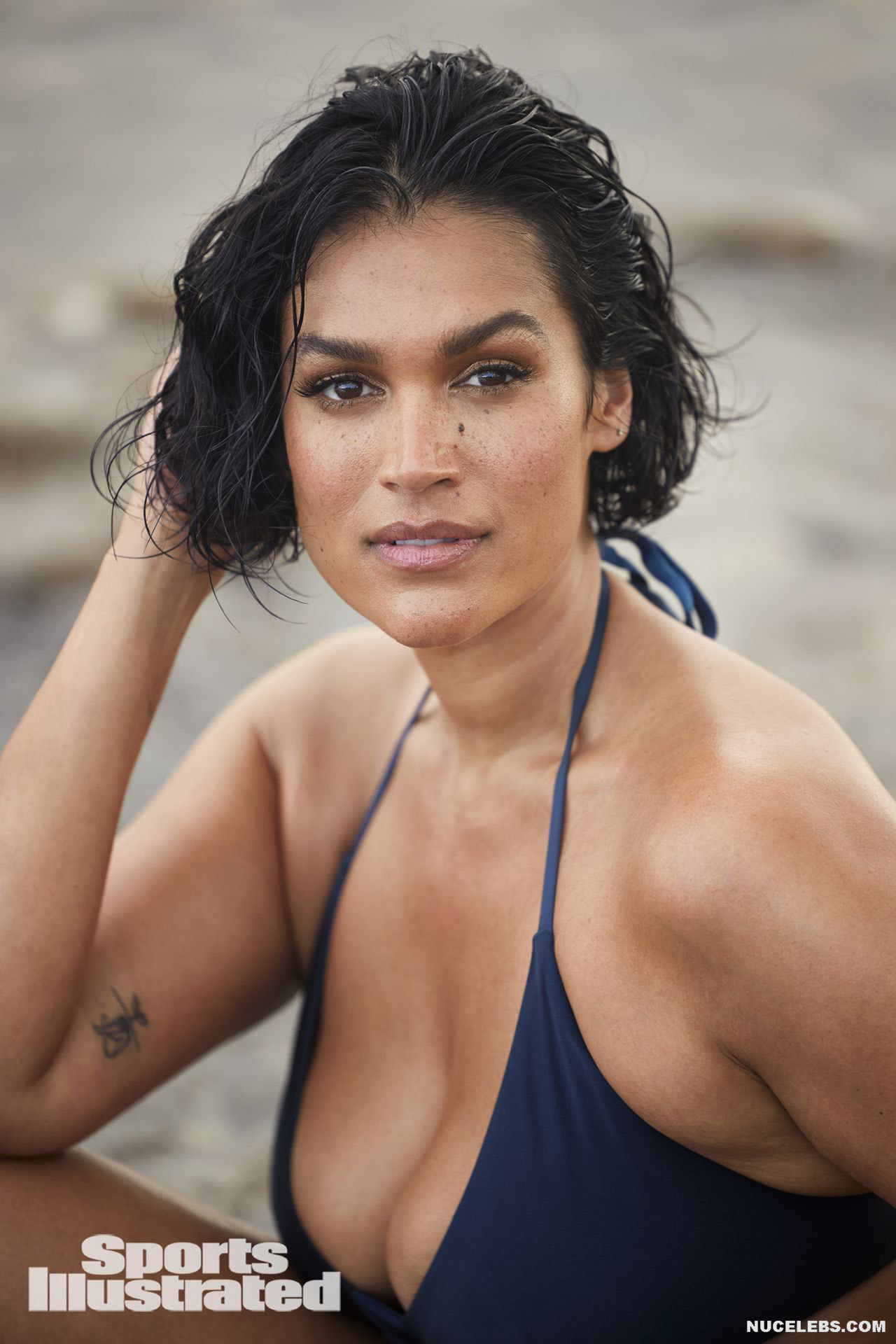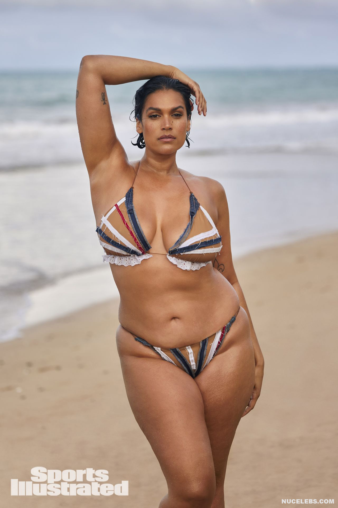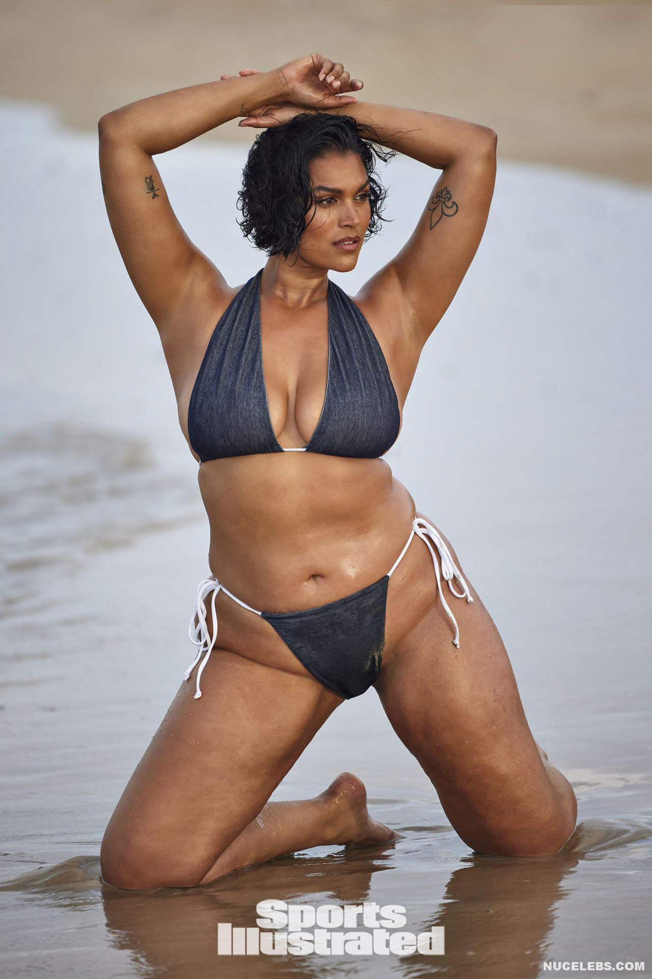 Jennifer Atilémile genuine beauty shines through in every photo in Sports Illustrated Swimsuit 2023. Her wavy chestnut hair frames her face delicately, while her expressive brown eyes convey a sense of sincerity. This celebrity was happy to show off her curvaceous figure in small bikinis, lying on the sand. At the same time, it seemed that Jennifer Atilémile’s nude big boobs were about to slip out of a miniature bra.