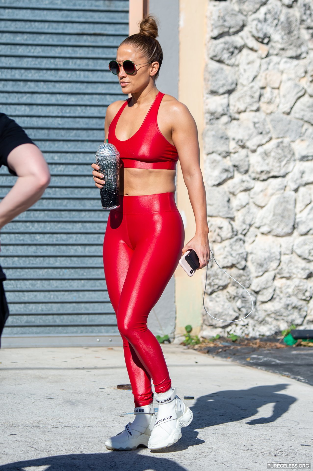 Beauty Jennifer Lopez was seen in a latex red outfit that perfectly repeated all the bends of her body nude. The red short top opened the celebrity’s bare tummy and perfectly fitted her sweet tits with poking nipples. It is also worth noting the famous ass Jennifer Lopez in tight pants from which it was impossible to look away. And also this actress pleased everyone with her wonderful cameltoe, which was also clearly visible.