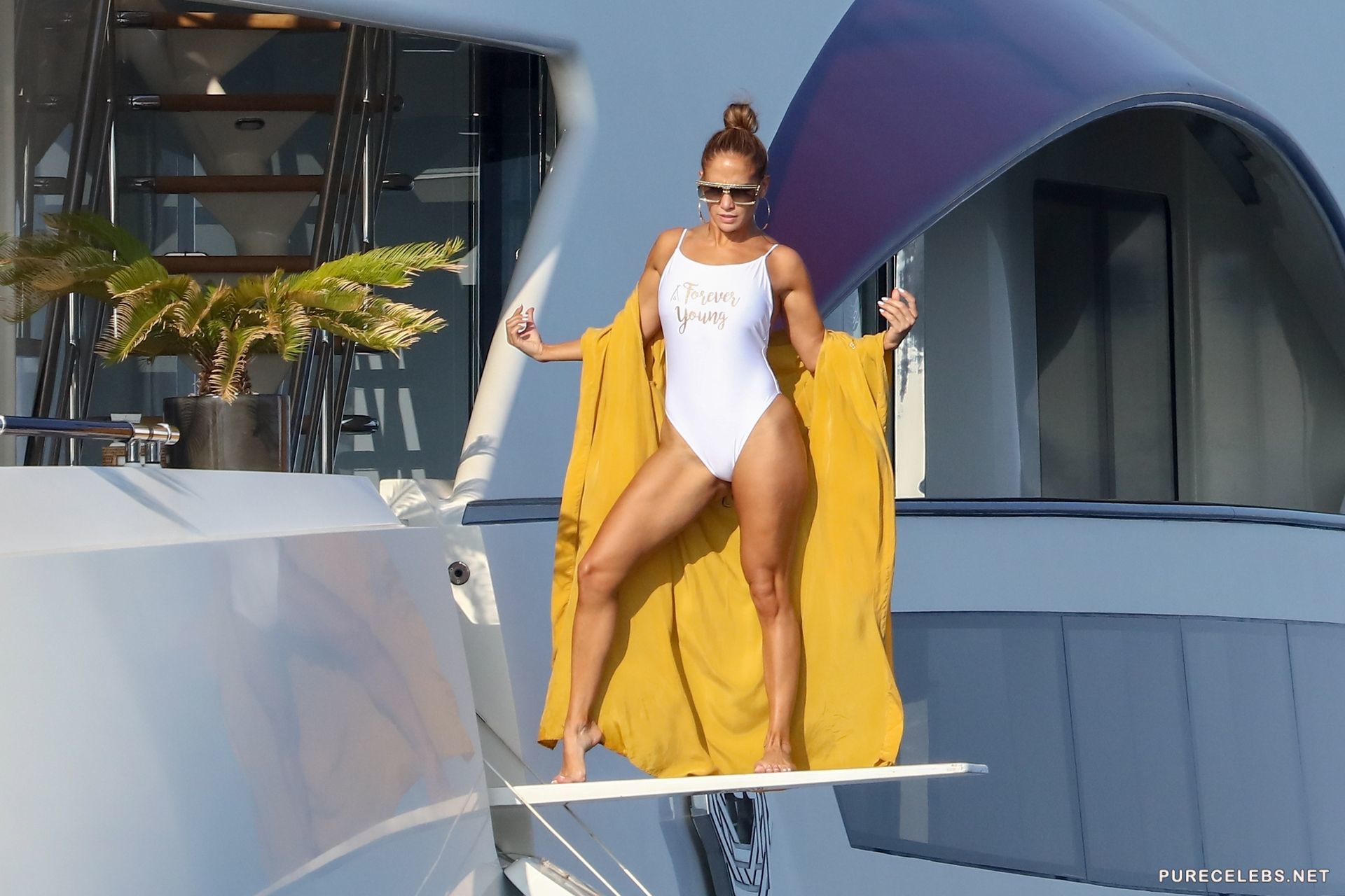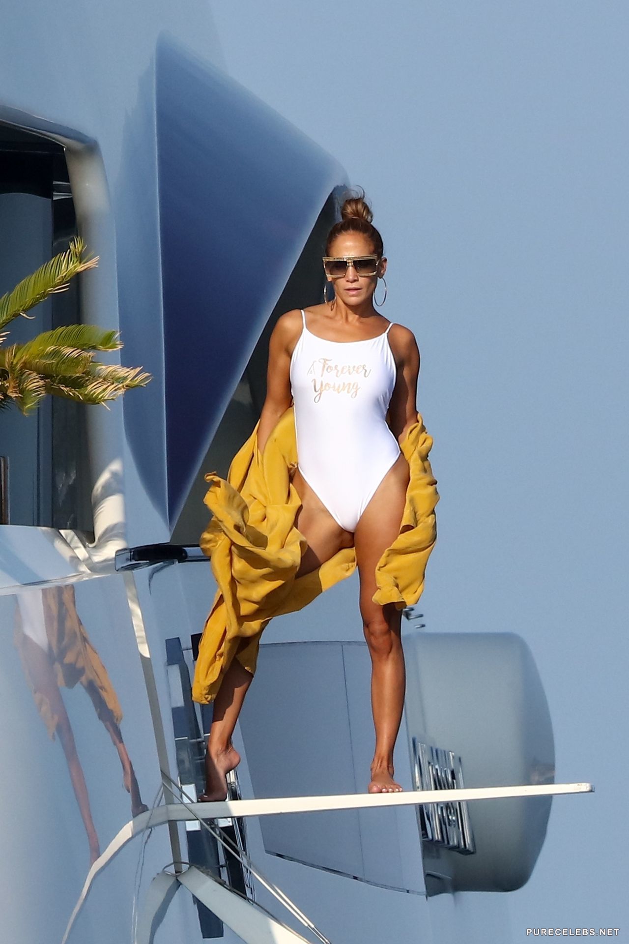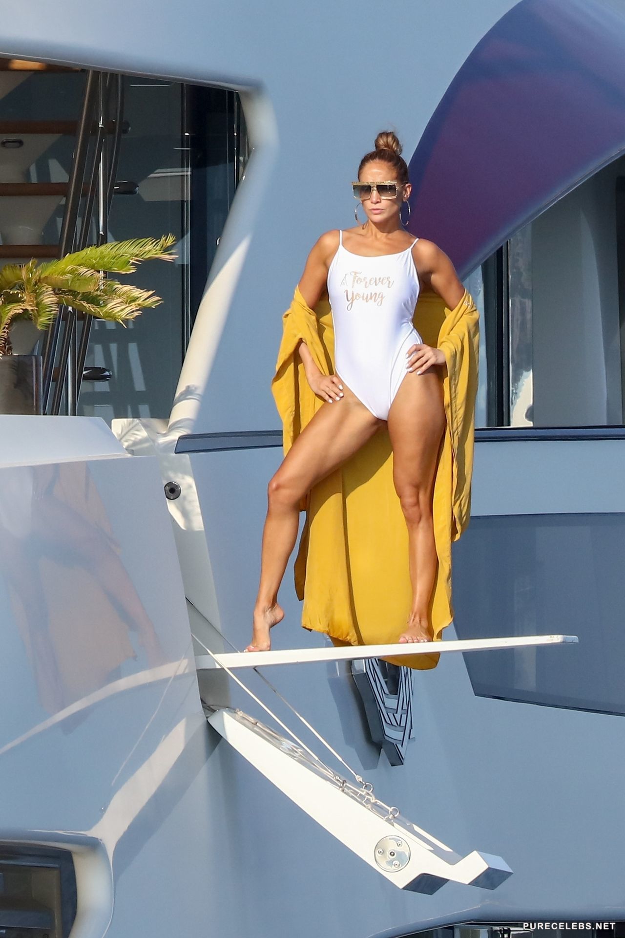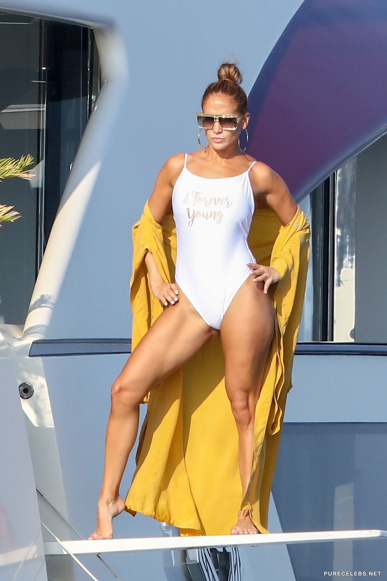 Recently, an American actress Jennifer Lopez was spotted resting on a yacht. The charming beauty in sunglasses took off her yellow bathrobe, staying in a white tight-fitting swimsuit with the words “Forever Young”, which perfectly contrasted with her body. Her elastic booty looked just breathtaking in a narrow swimsuit. The celebrity was happy to show off her figure and you certainly can not resist this beauty!