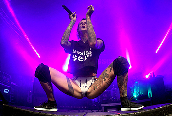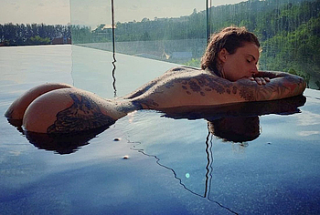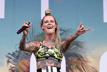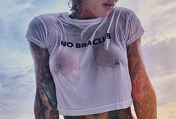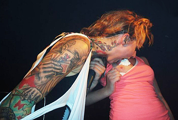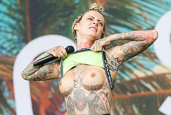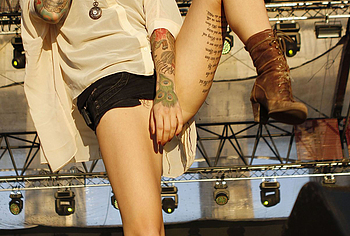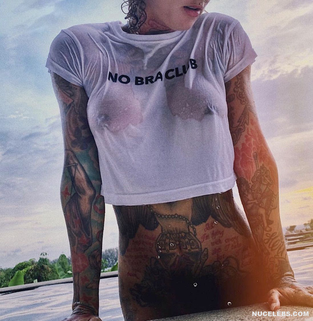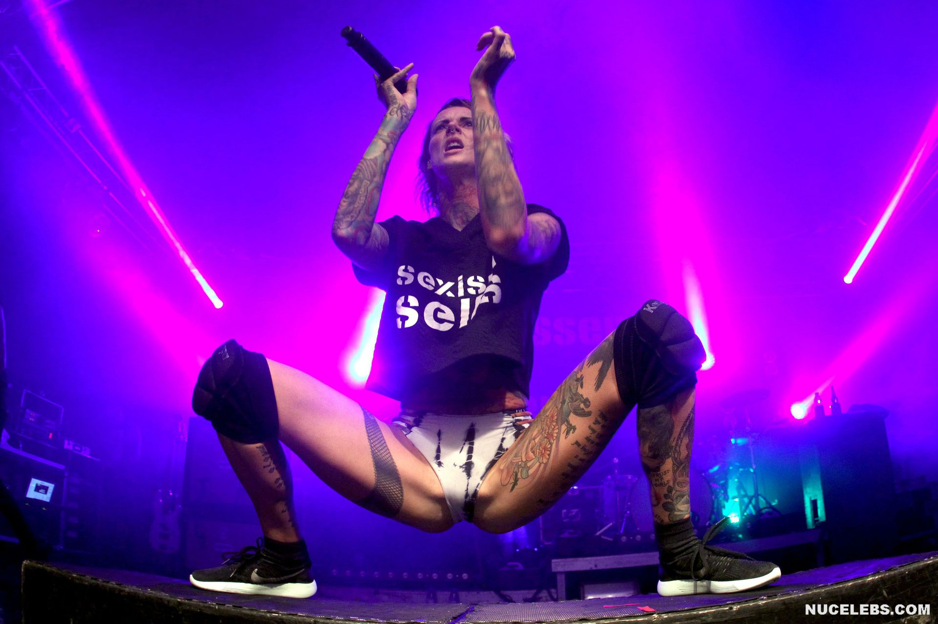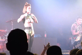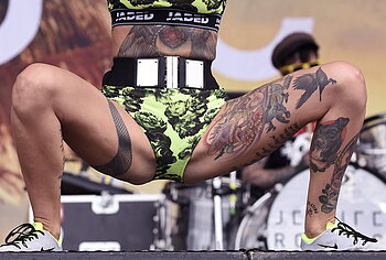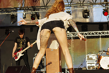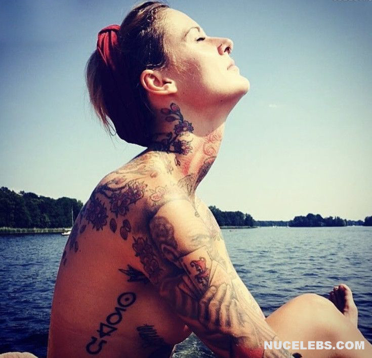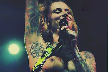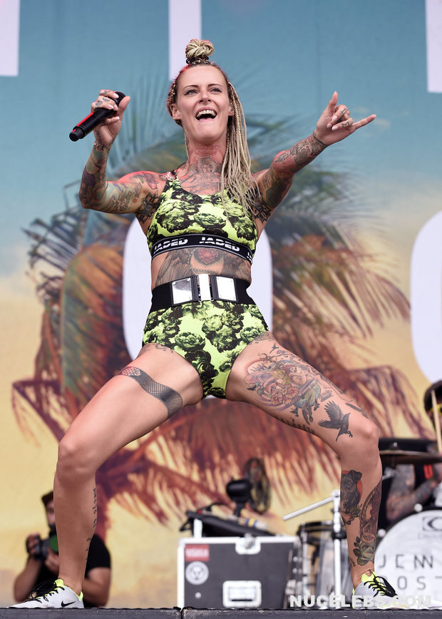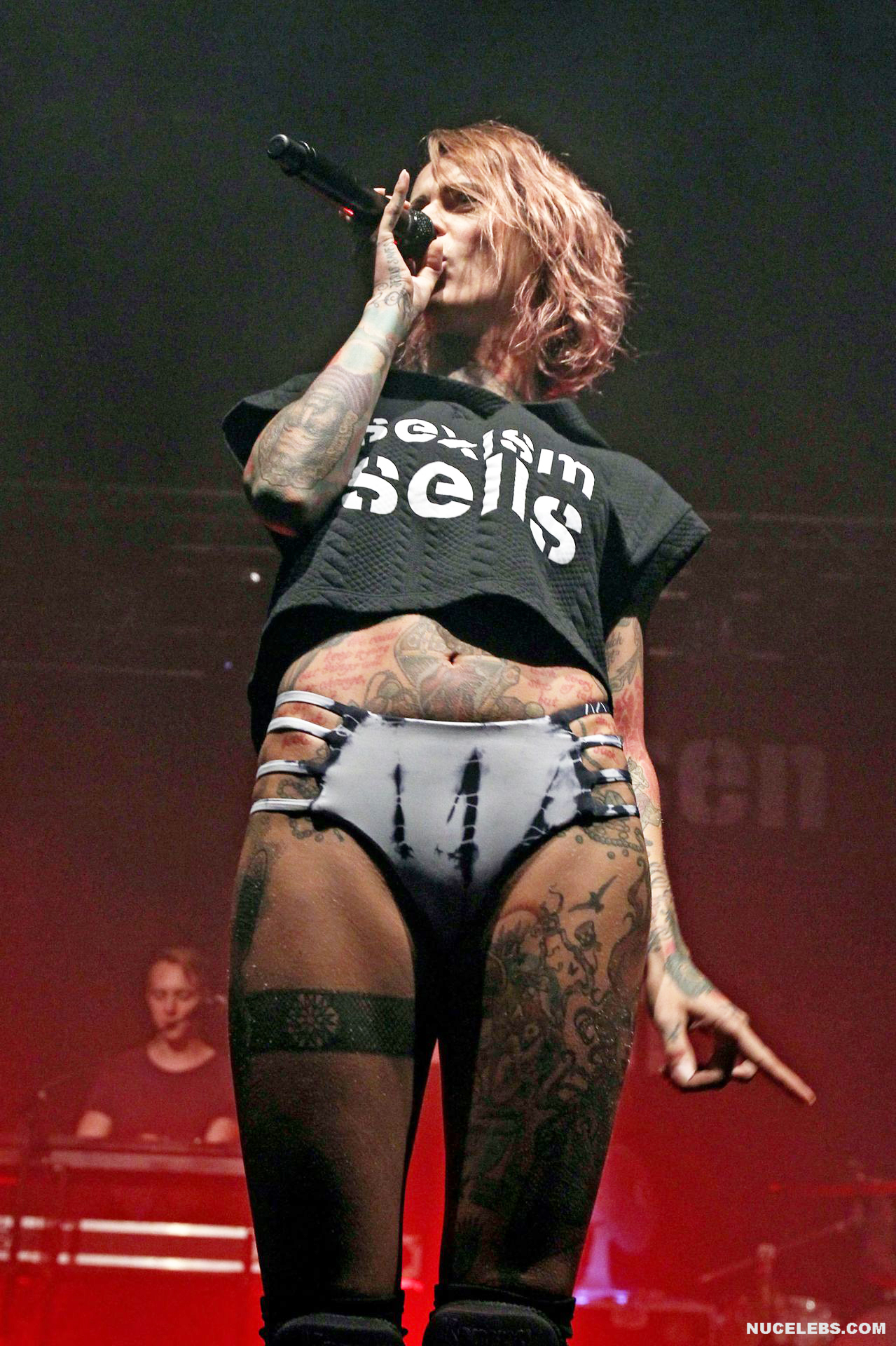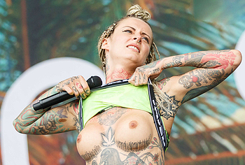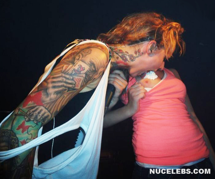 It looks like Jennifer Weist is having a lot of fun showing off her nude body in public. This German rock musician often performs on stage in panties that accentuate her awesome cameltoe. Also, this celebrity does more provocative things. So, Jennifer Weist showed off her nude tattooed boobies by lifting up her green top while performing on stage!