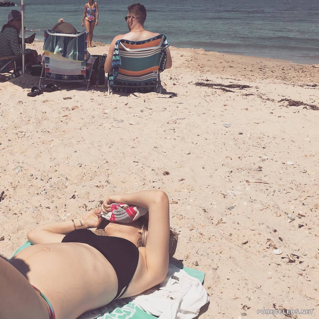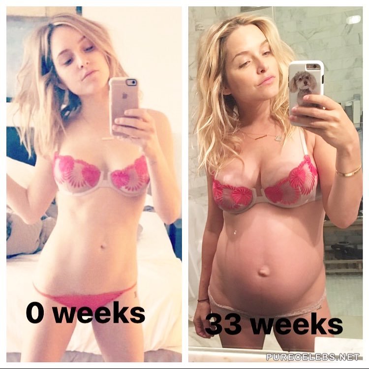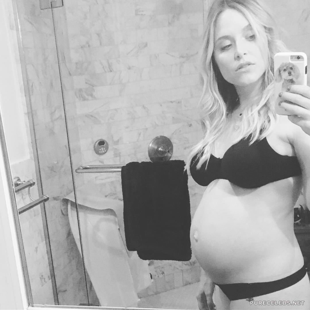 Actress and author Jenny Mollen and her husband Jason Biggs, the star of the American Pie movies are expecting a new baby. The hot 38 year old blond decided to update her fans about her pregnancy with some sexy nude selfies. Jenny photographed herself in the bathroom groping her plump breasts and showing off her large pregnant belly. She also posted some before and after photos of herself wearing sexy lingerie in order to show the progress of her pregnancy.