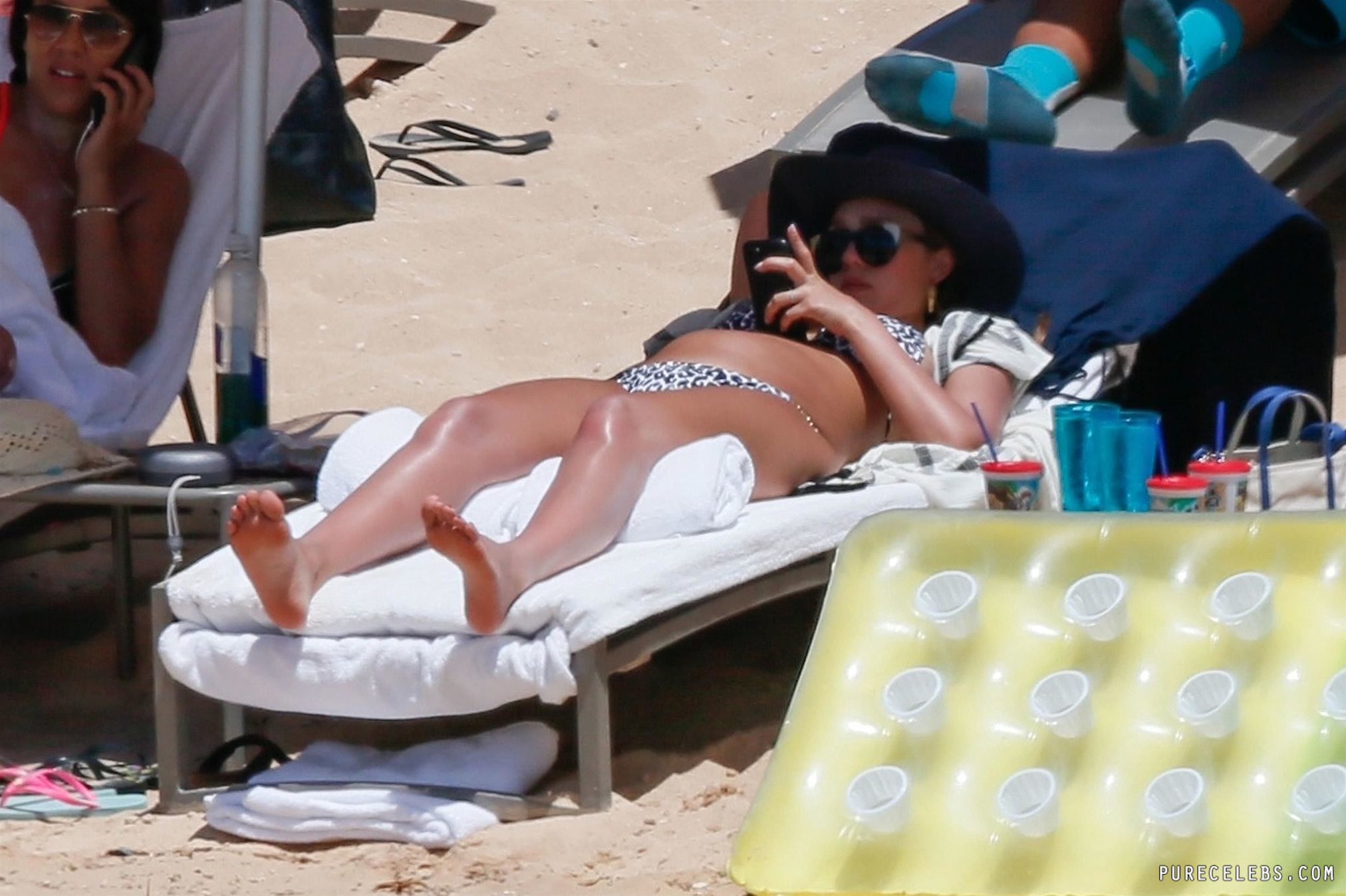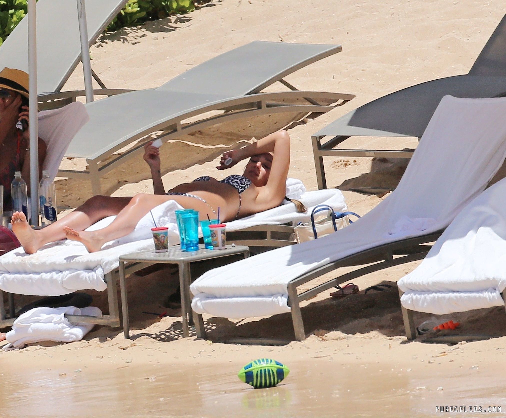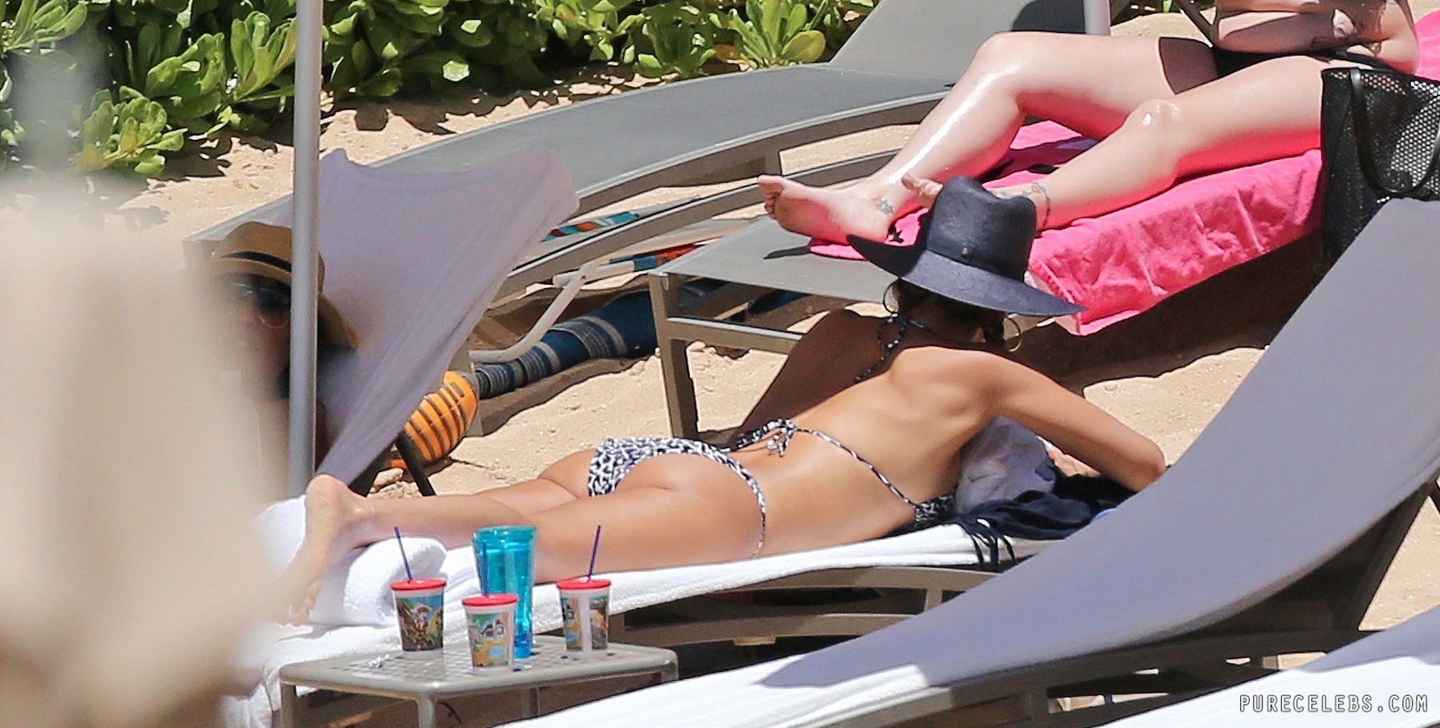 Paparazzi have long dreamed of catching American actress Jessica Alba nude. But so far they managed to take a photo of this celebrity in a bikini during her beach vacation. It is worth noting that the girl looked very hot when she was sunbathing in a white bikini with a black print. Especially sexy was her juicy buttocks in small panties. But the bra seemed too small for her chic breasts. It was clear that Jessica Alba nude boobs could slip out of it at any moment.