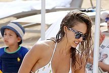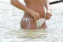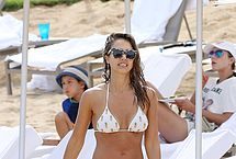 Actress Jessica Alba can’t have a day without paparazzi following her, judging by these photos, but if she had, then we couldn’t see her in such hot bikinis in the beach. Wearing a whit swimsuit, this hottie presented her golden brown figure during a vacation, while swimming and surfing. But, we couldn’t pass up the chance to show her in yellow panties, behind the scenes, at a photo shoot.