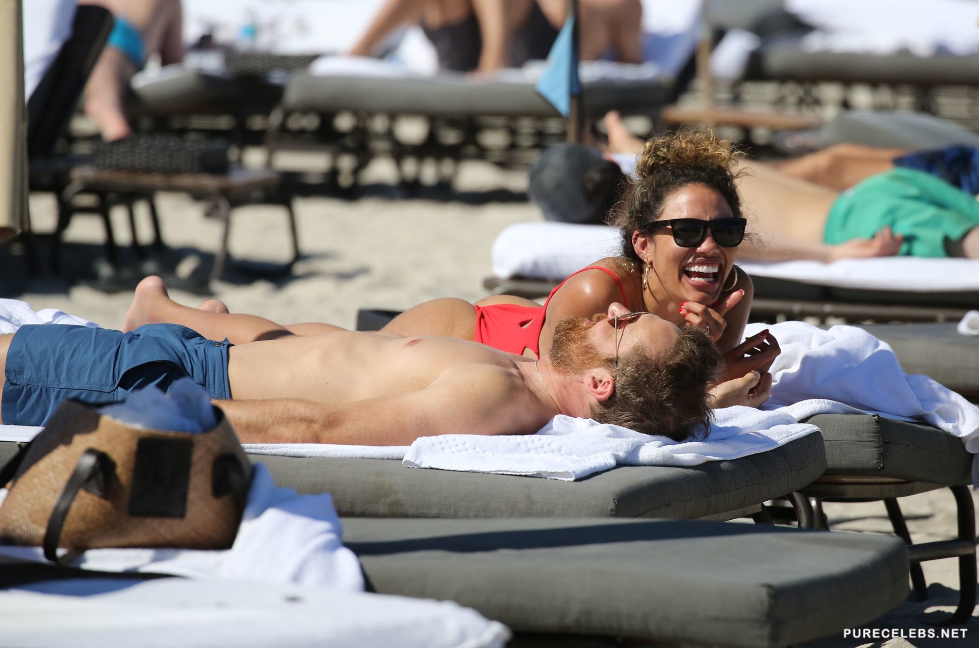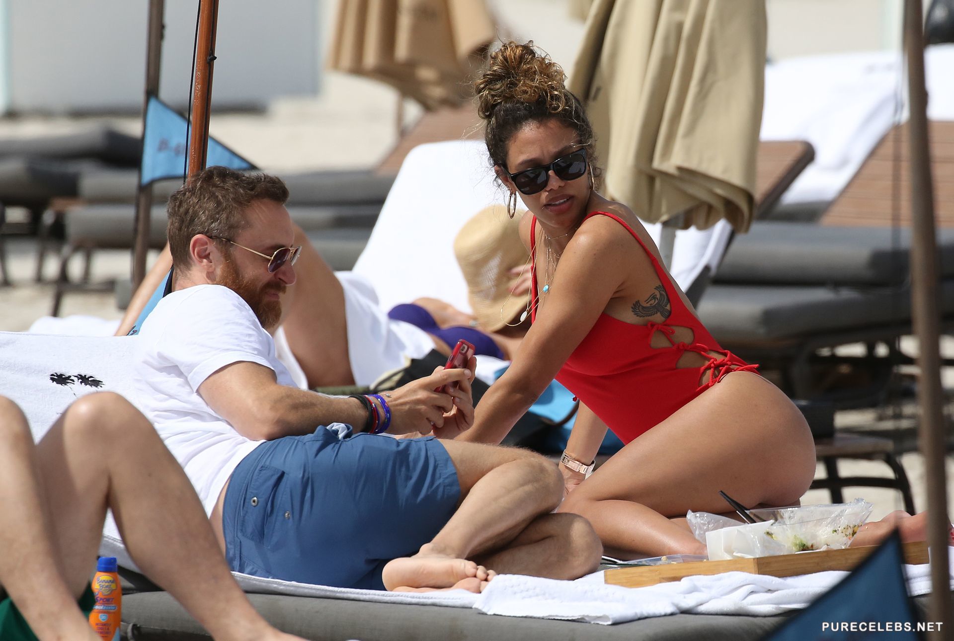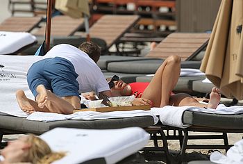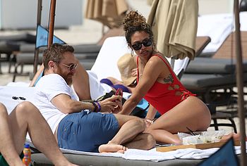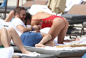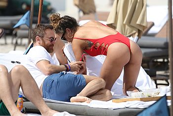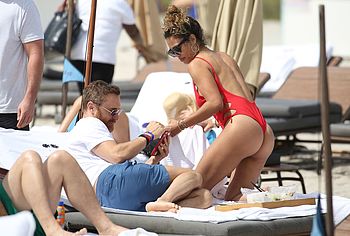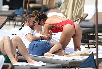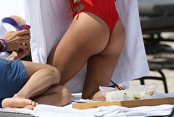 Jessica Ledon was spotted relaxing on the beach. This celebrity felt confident enough to wear defiant red swimsuit showing off her gorgeous figure. Her ass in red thongs looks very seductive, asking to grope it. Her breasts look charming and almost jump out of a bathing suit leaving space for your sexual fantasy with them.