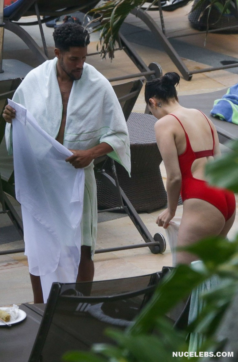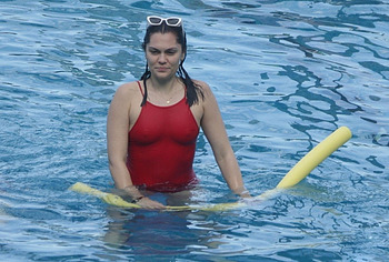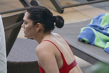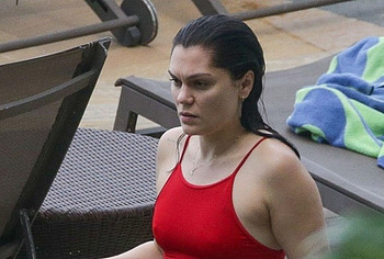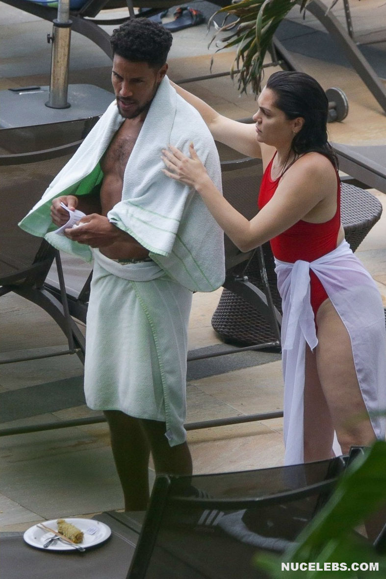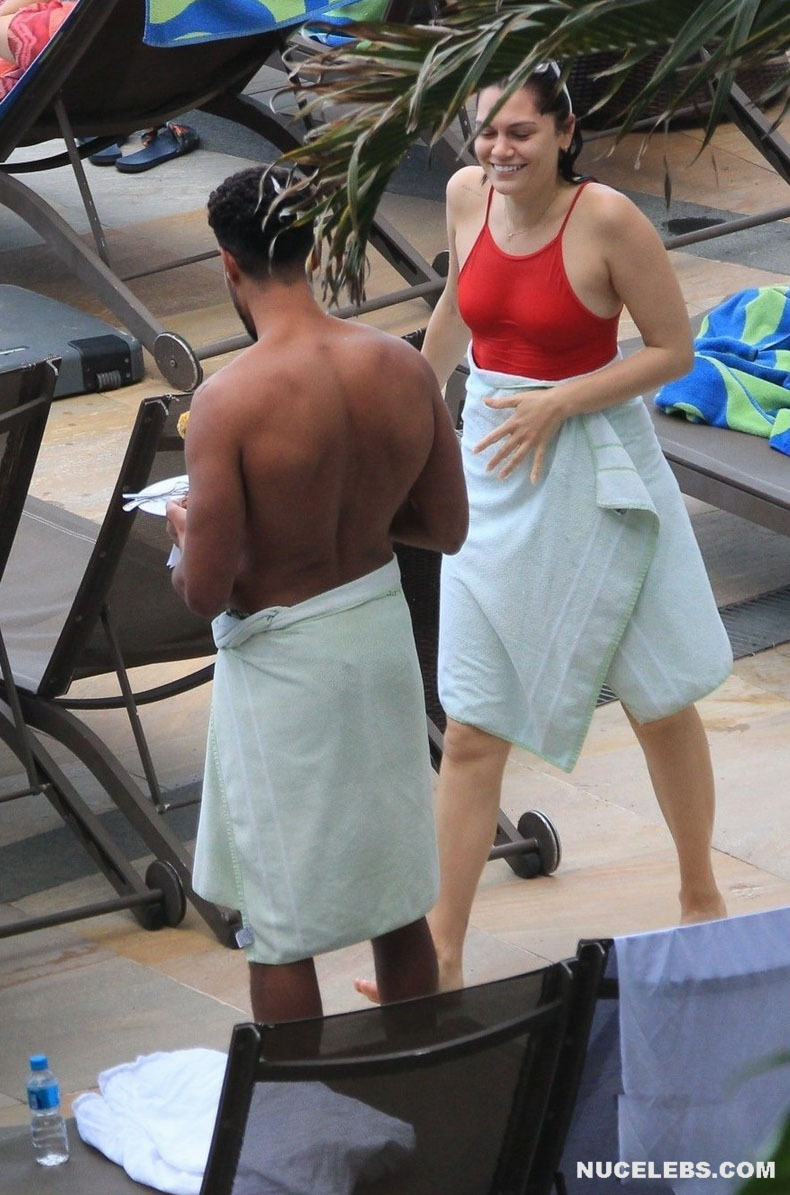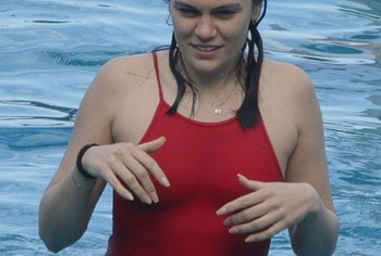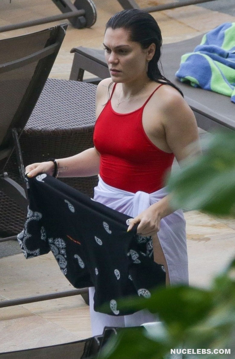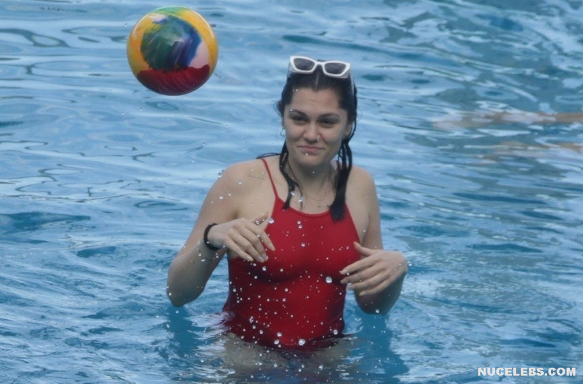 The paparazzi wasted no time and took pictures when Jessie J was relaxing by the pool. This charming girl was dressed in a red swimsuit, the bottom of which emphasized her awesome curvy ass. Also, when her bathing suit got wet, Jessie J’s nipples poke out through the thin fabric. Oh, this brunette singer looked very sexy in those moments, didn’t she?