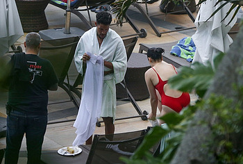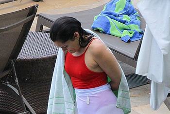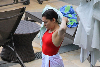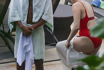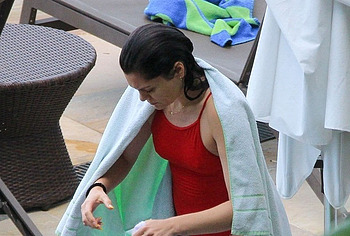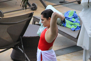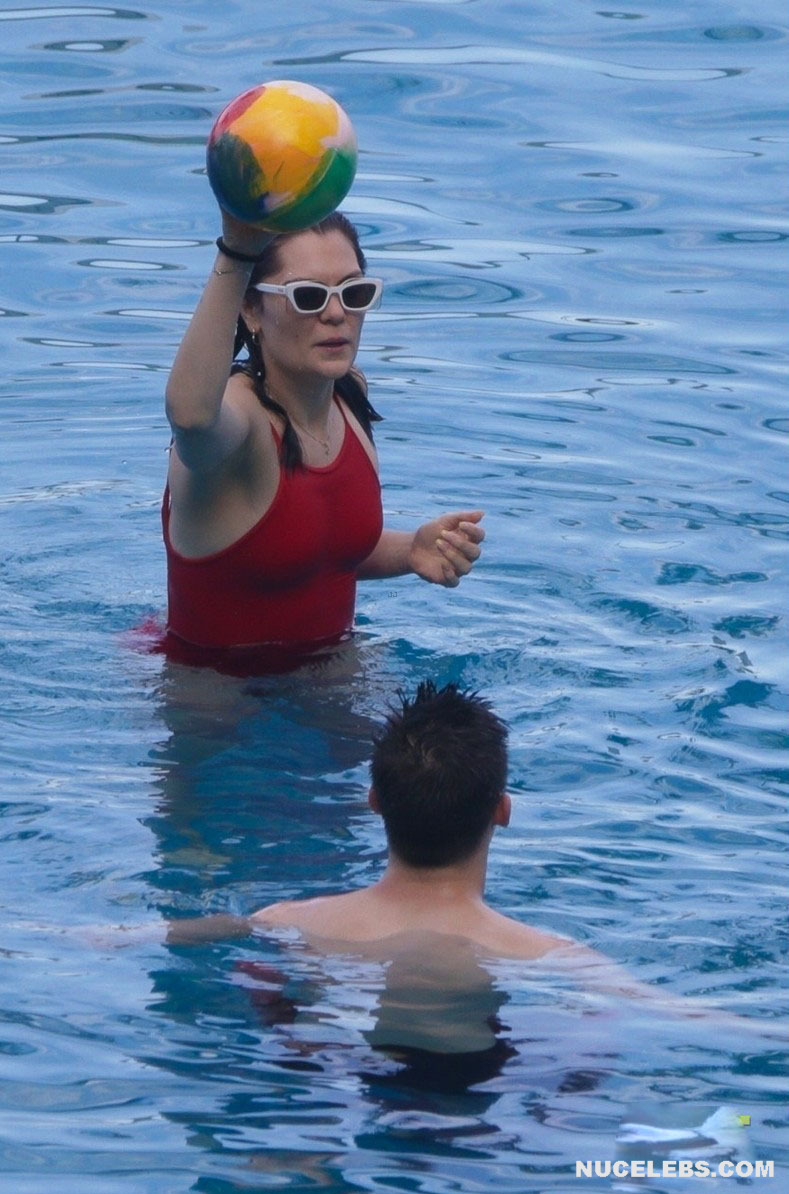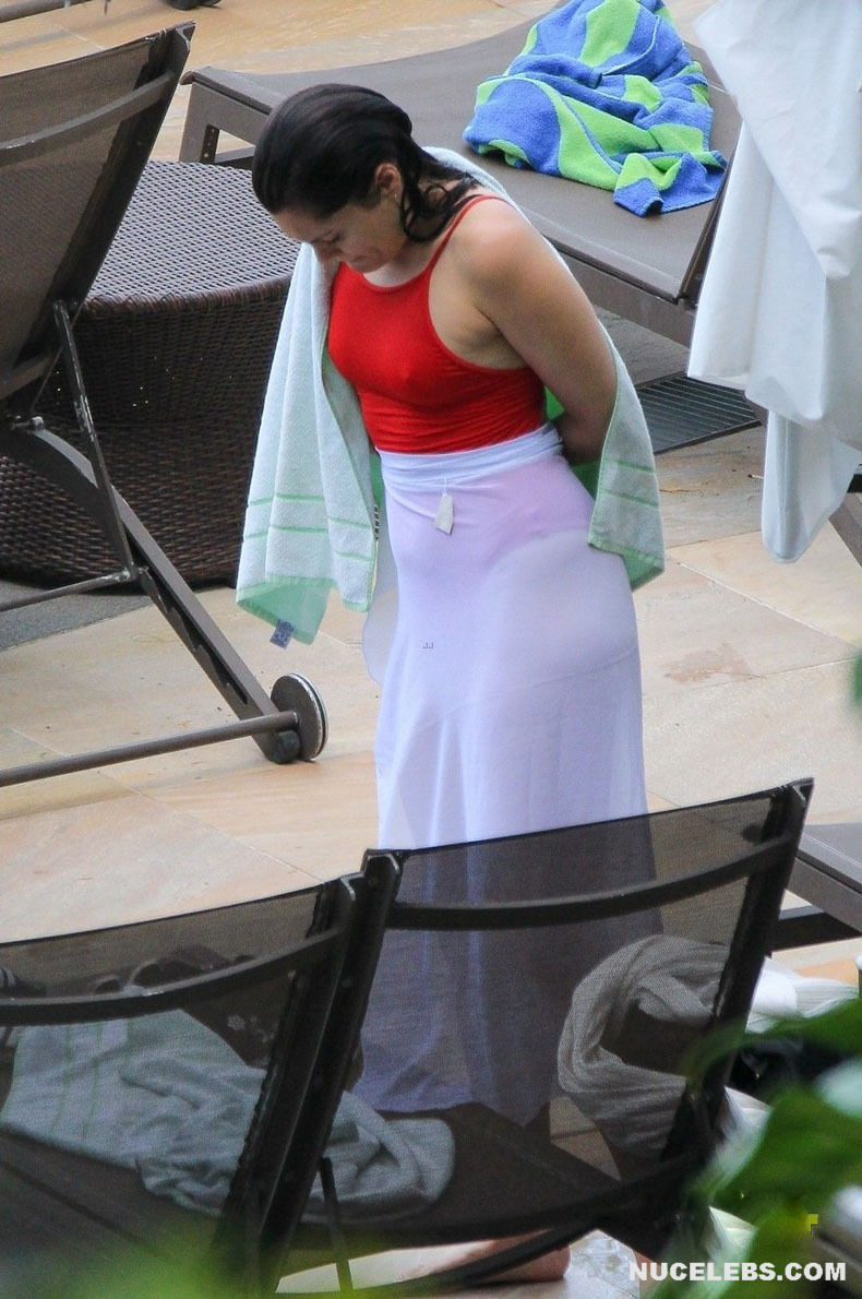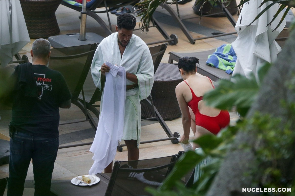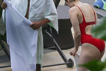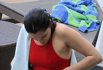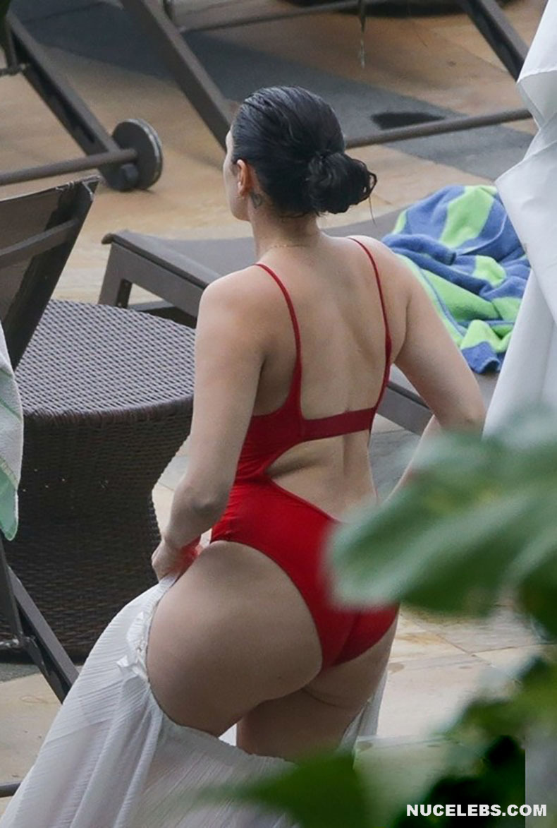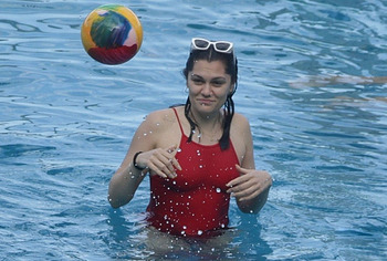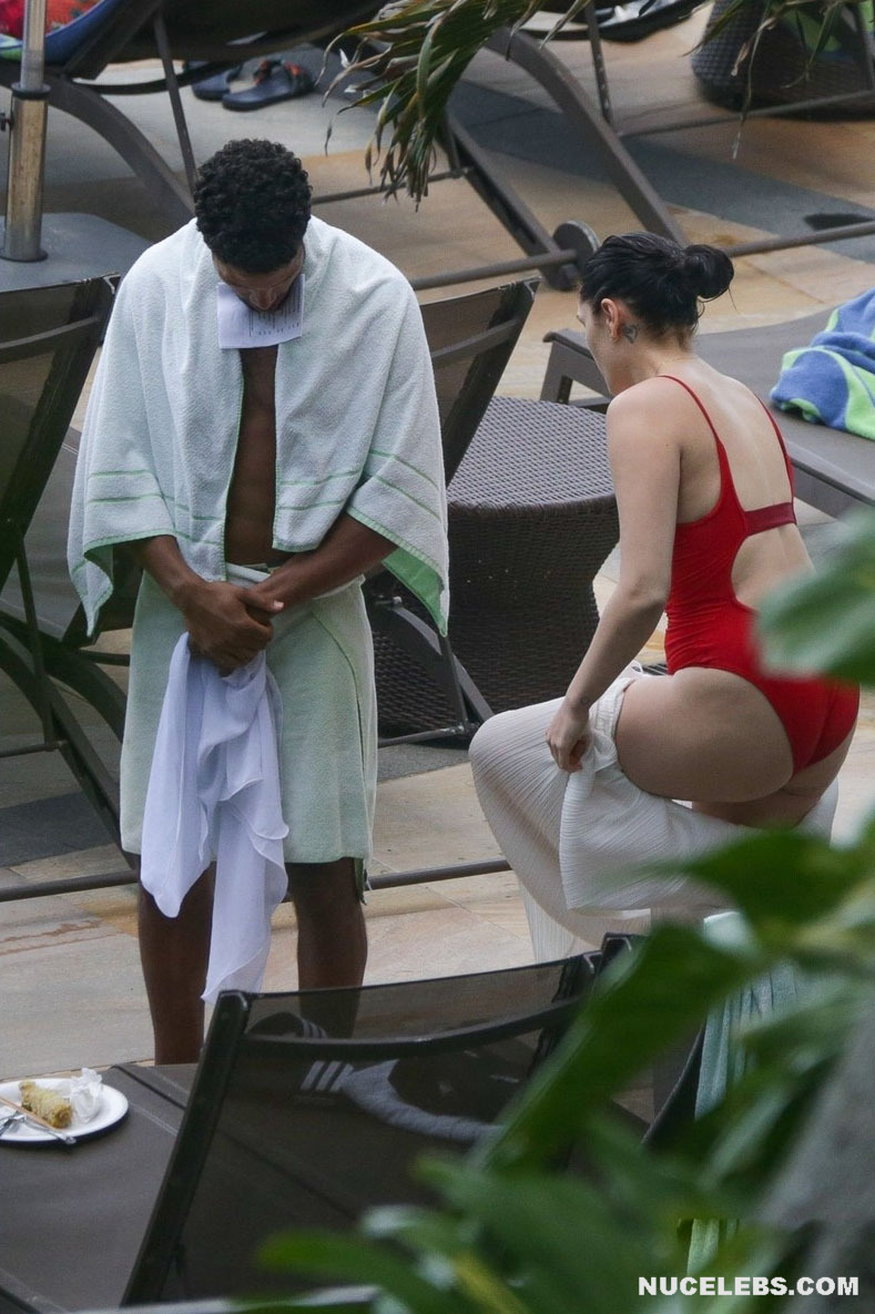 The paparazzi wasted no time and took pictures when Jessie J was relaxing by the pool. This charming girl was dressed in a red swimsuit, the bottom of which emphasized her awesome curvy ass. Also, when her bathing suit got wet, Jessie J’s nipples poke out through the thin fabric. Oh, this brunette singer looked very sexy in those moments, didn’t she?