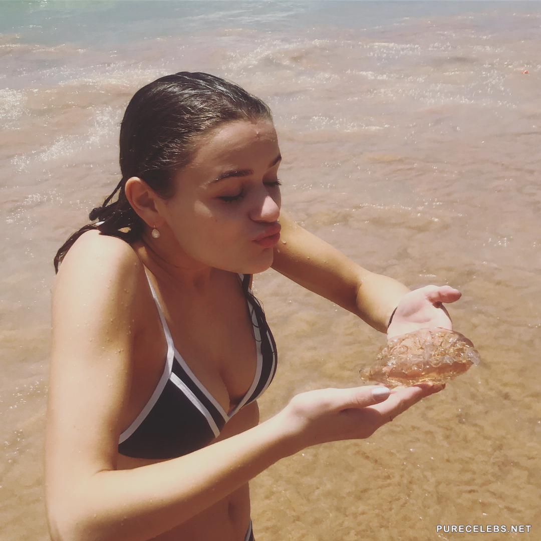 This summer all the stars came out to the beach to play, and young aspiring actress Joey King is no exception. The petite brunette and her boyfriend got all wet and posed for some sexy beach photos. They were busy catching jellyfish and soaking up the sun. Joey looks absolutely stunning in her little black and white bikini that perfectly displays her perky boobs.