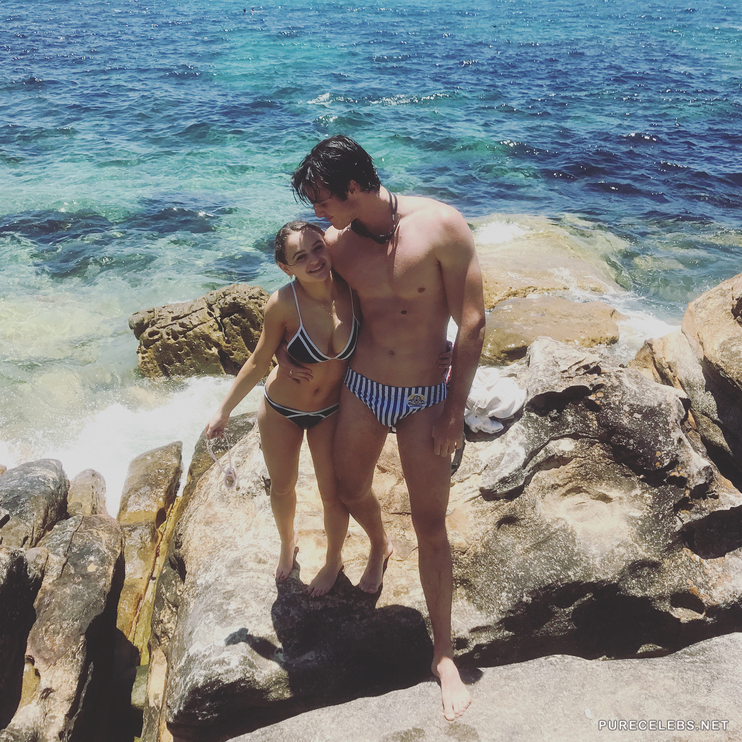 This summer all the stars came out to the beach to play, and young aspiring actress Joey King is no exception. The petite brunette and her boyfriend got all wet and posed for some sexy beach photos. They were busy catching jellyfish and soaking up the sun. Joey looks absolutely stunning in her little black and white bikini that perfectly displays her perky boobs.