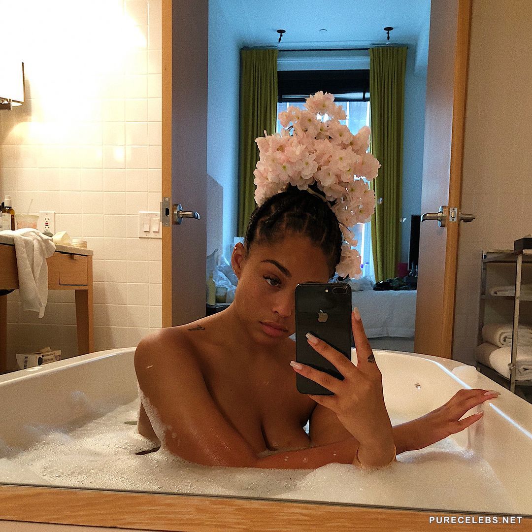 Jordyn Woods likes showing her body off so she takes some selfies in front of the camera as she is taking a bath. Once she gets nice and clean she exits the tub and then she puts on a white thin A shirt in which her nipples become clearly visible and she shoots a picture of her body in front of the mirror.