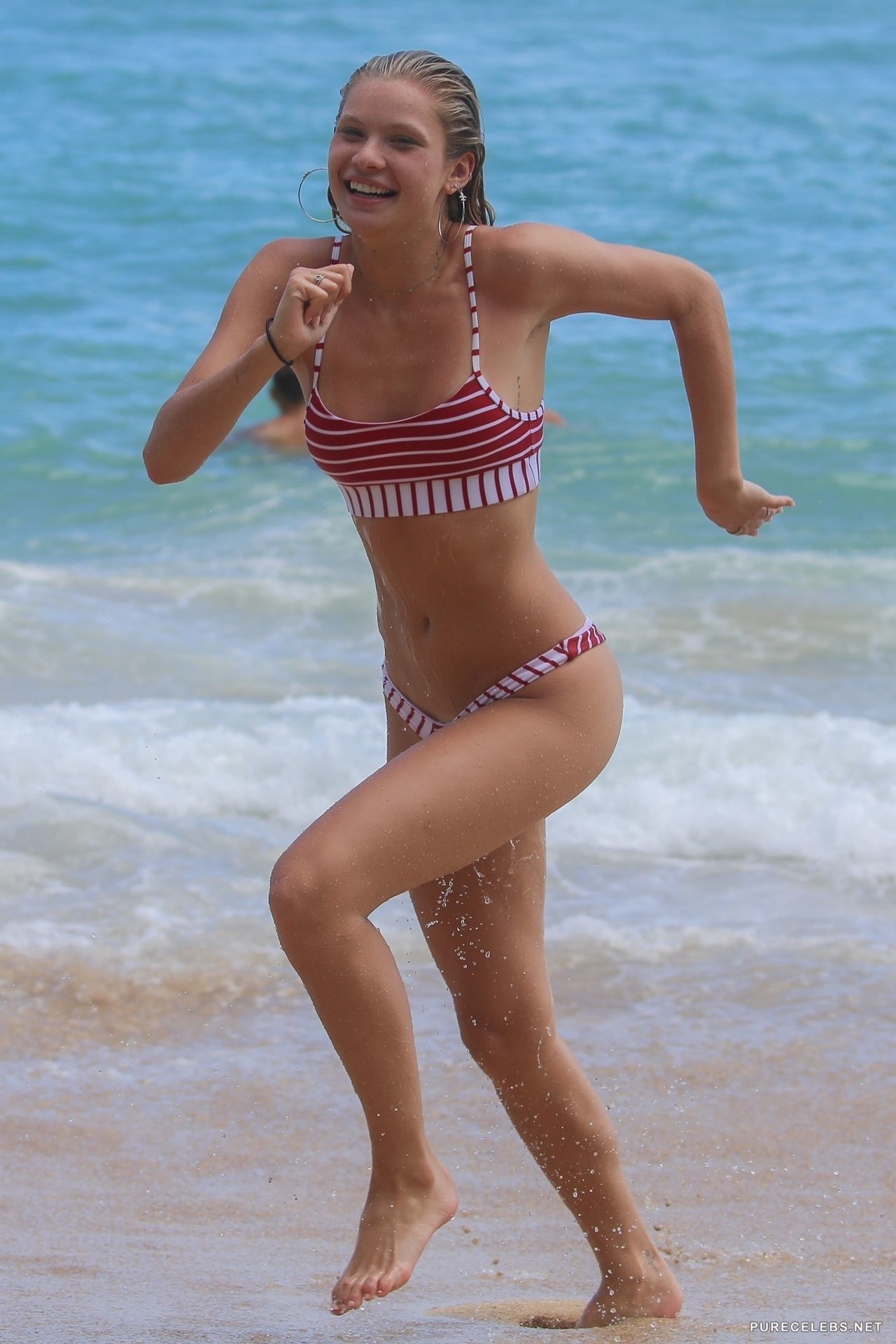 You definitely can’t look away from the American model Josie Canseco when you will see her photos from the rest on the beach. The hot blonde was dressed in a striped red and white bikini that perfectly emphasized the curves of her amazing body. Her boobs in a narrow bra looked incredibly attractive. And when she ran through the water, her little thong slipped from her wonderful ass and everyone could see it.