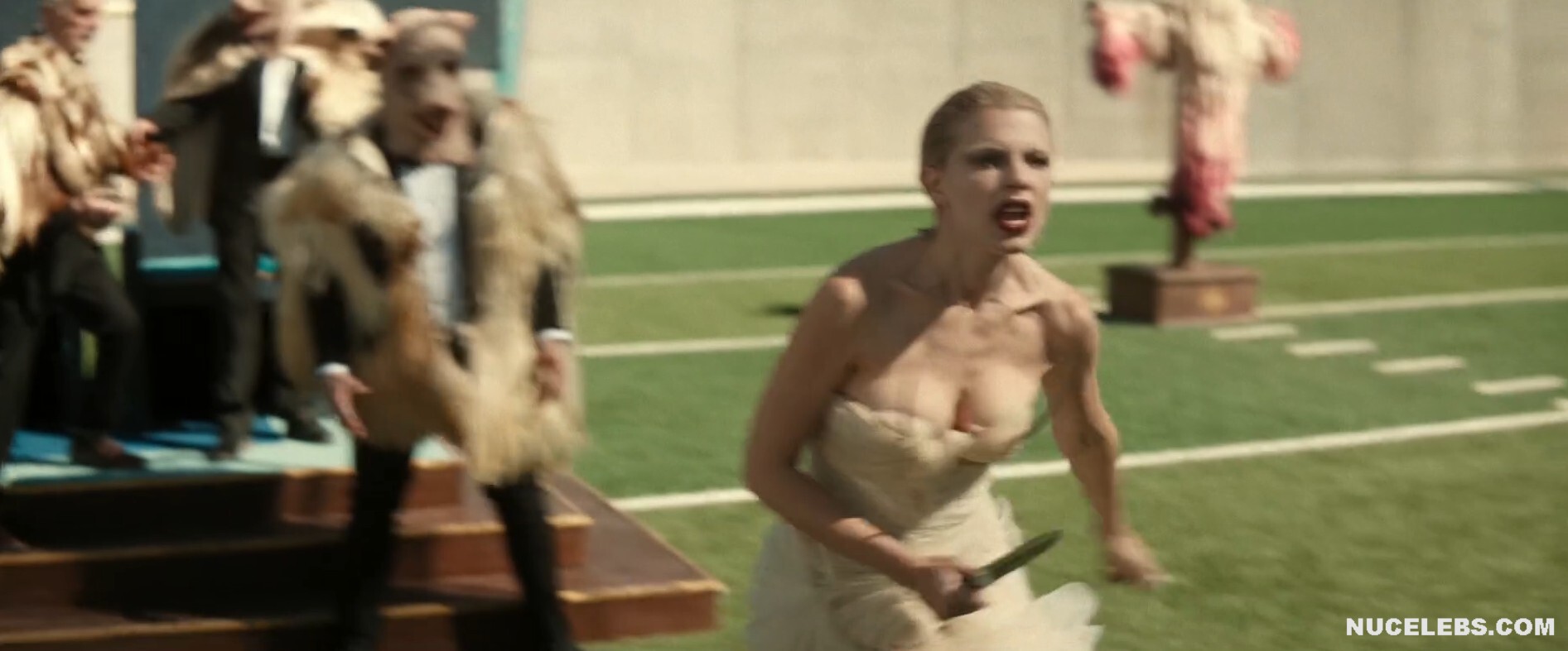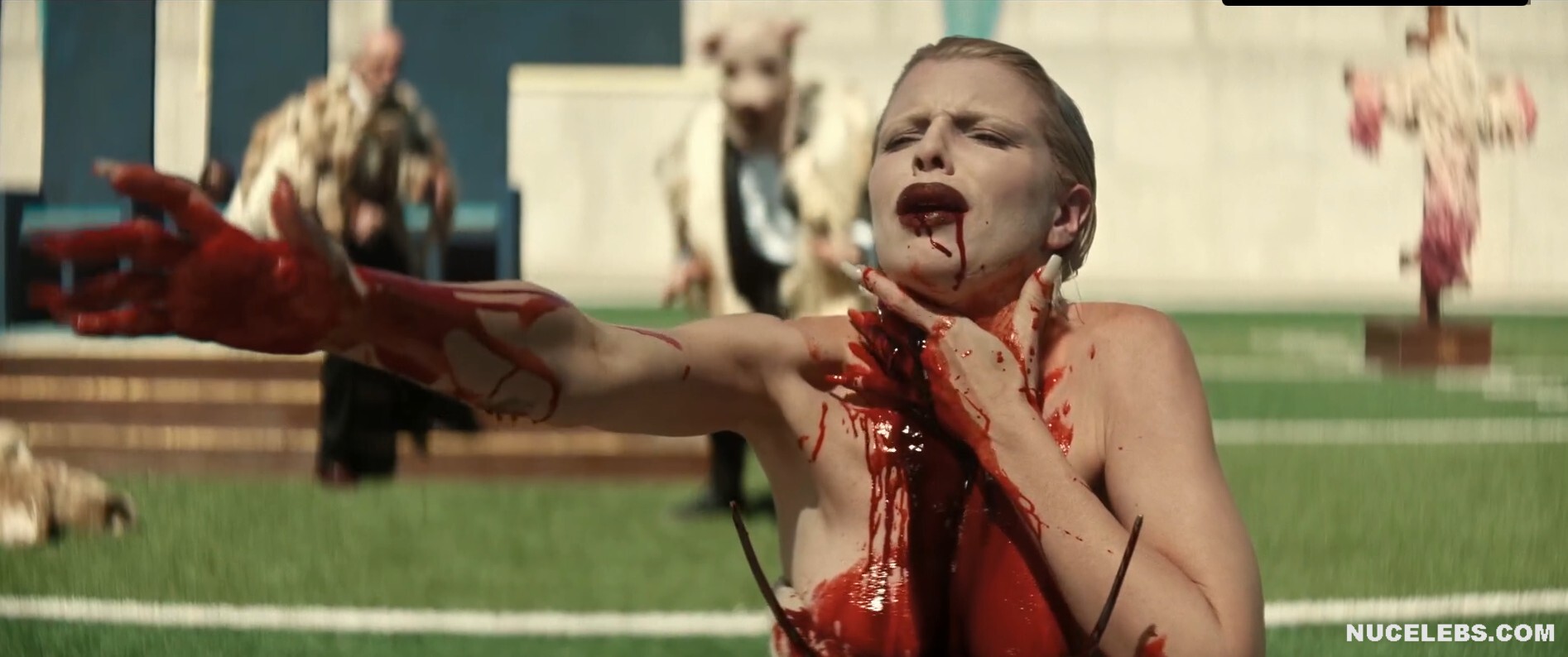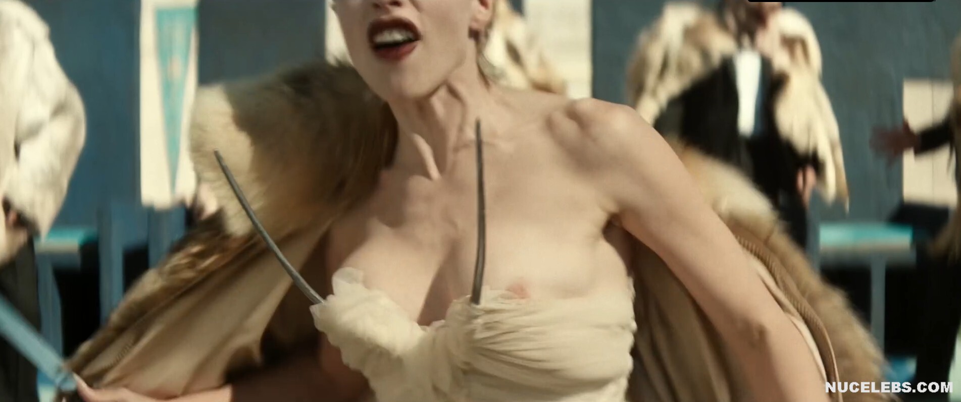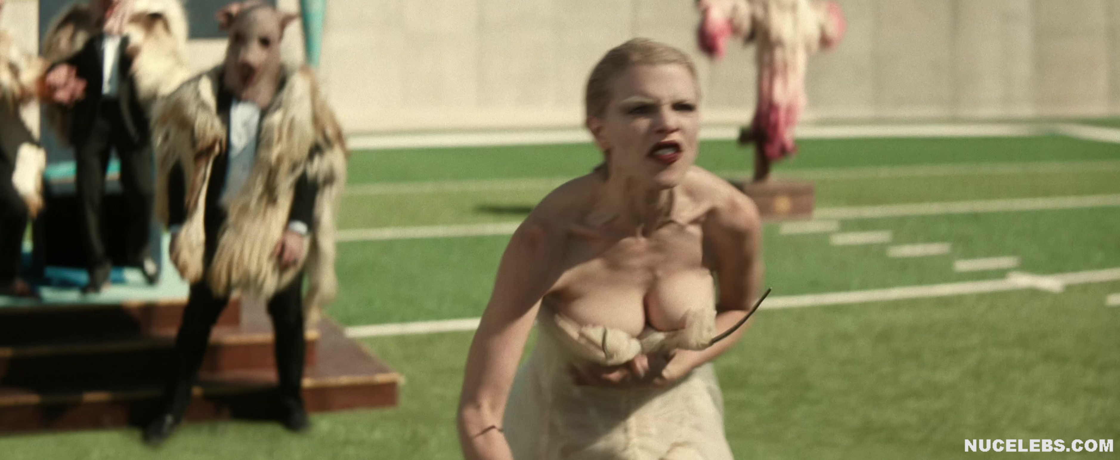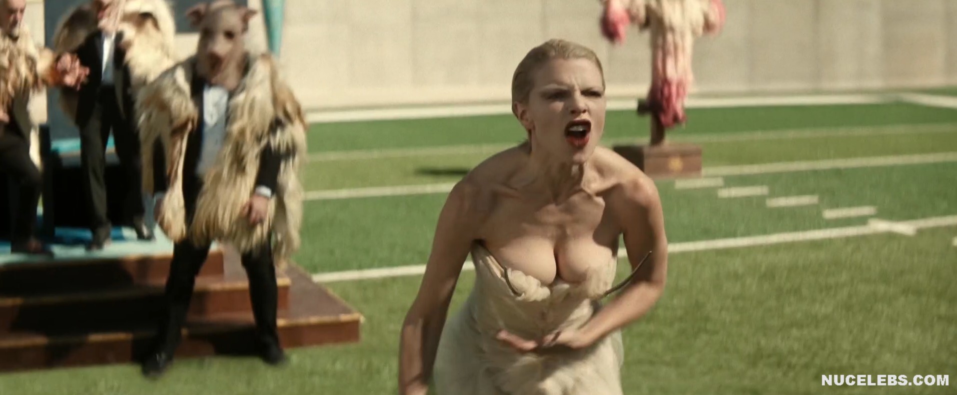 Witness Julia Fox showing her nude tits in “HIM”! This beauty was wearing a stunning dress with a huge neckline. Because Julia started running, her boobs just popped out of the dress. By the way, it’s worth noting that this actress has an incredibly beautiful body. We hope we’ll see completely naked Julia Fox in other films.