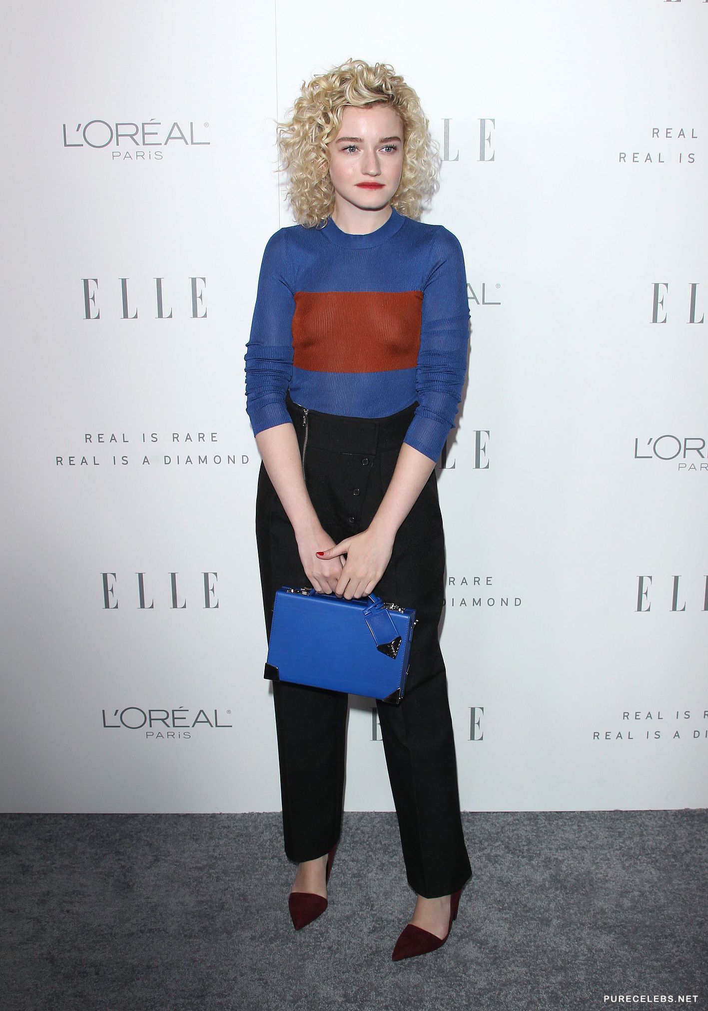 This cute girl with curly blonde hair is an American actress and model, Julia Garner. She appeared in famous movies such as Perks of Being Wallflower and more importantly in Sin City: A Dame to Kill For where she portrayed the sexy vixen. In real life she also is seductive, sexy, with elegant body. Paparazzi took photos of her on the red carpet braless wearing completely see through shirt with her perky nipples poking out from underneath. Of course such massive tits is hard to contain in this dress, and luckily for us there were nipple slips.
