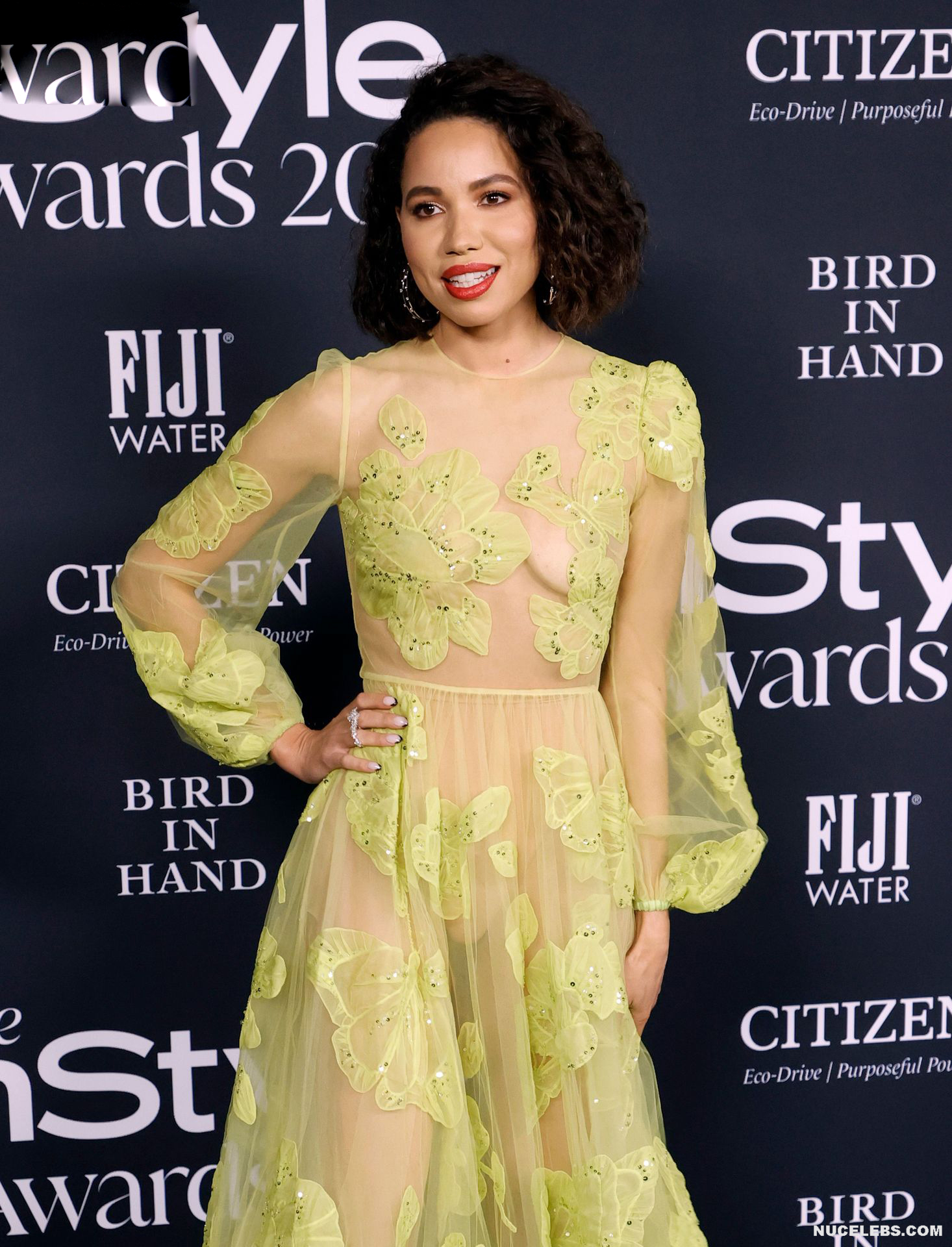 It looks like Jurnee Smollett decided to drive everyone crazy with her almost nude body during one of the events. So the celebrity chose for herself an outfit in which she was simply irresistible. So, the girl was wearing a transparent dress with yellow butterflies. At the same time, when Jurnee Smollett turned her back to the camera, her nude ass was visible! And her juicy tits were perfectly visible through the thin fabric!