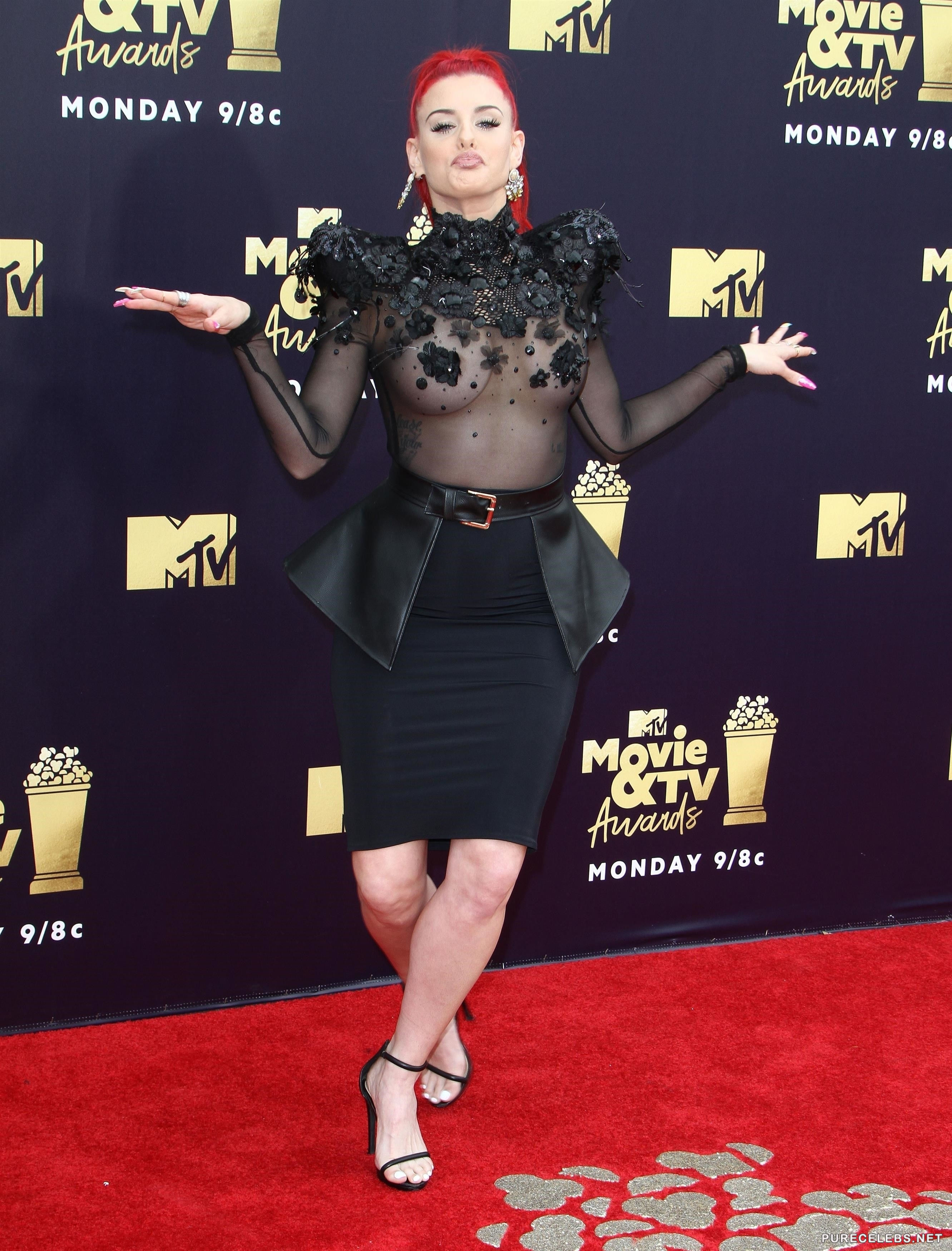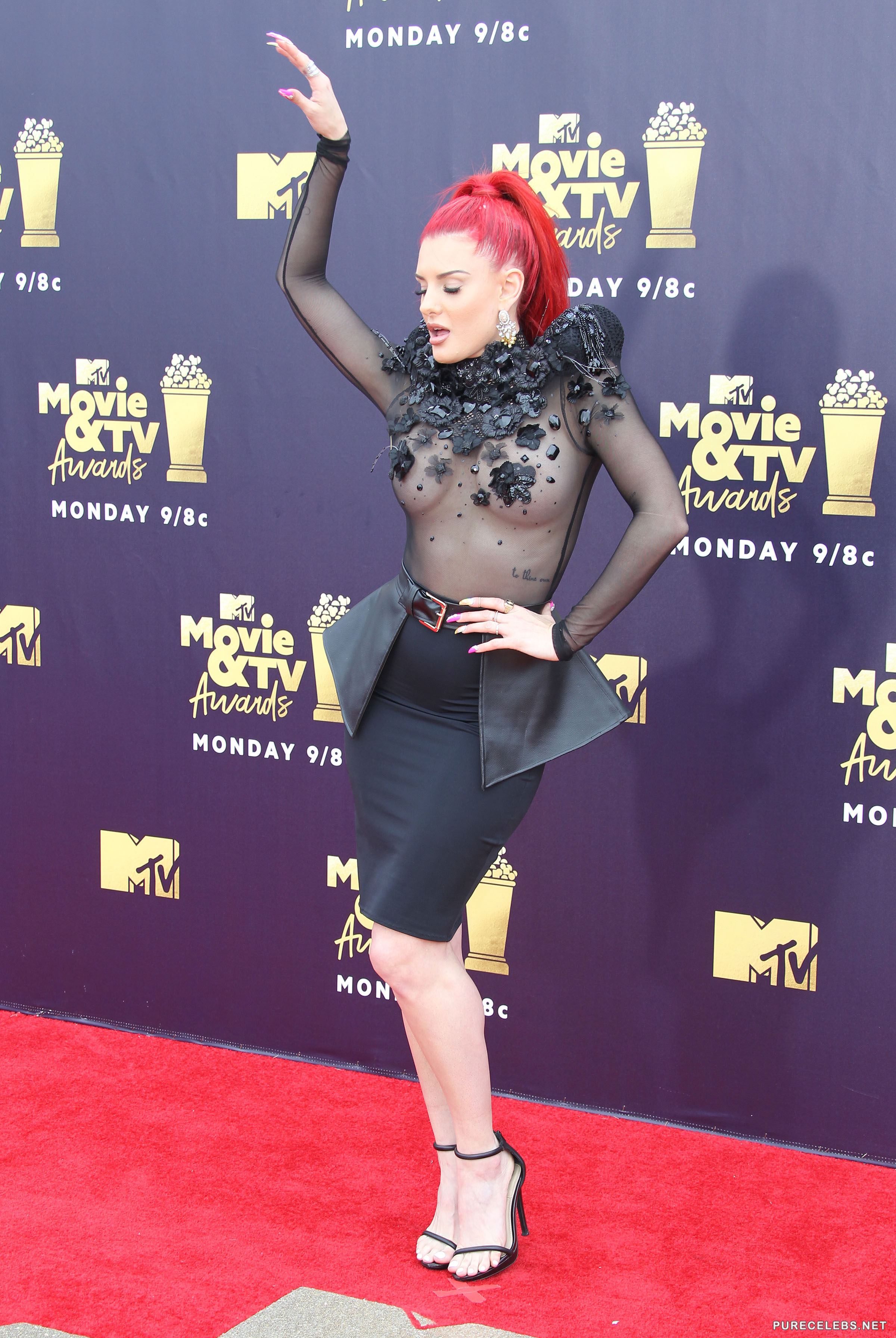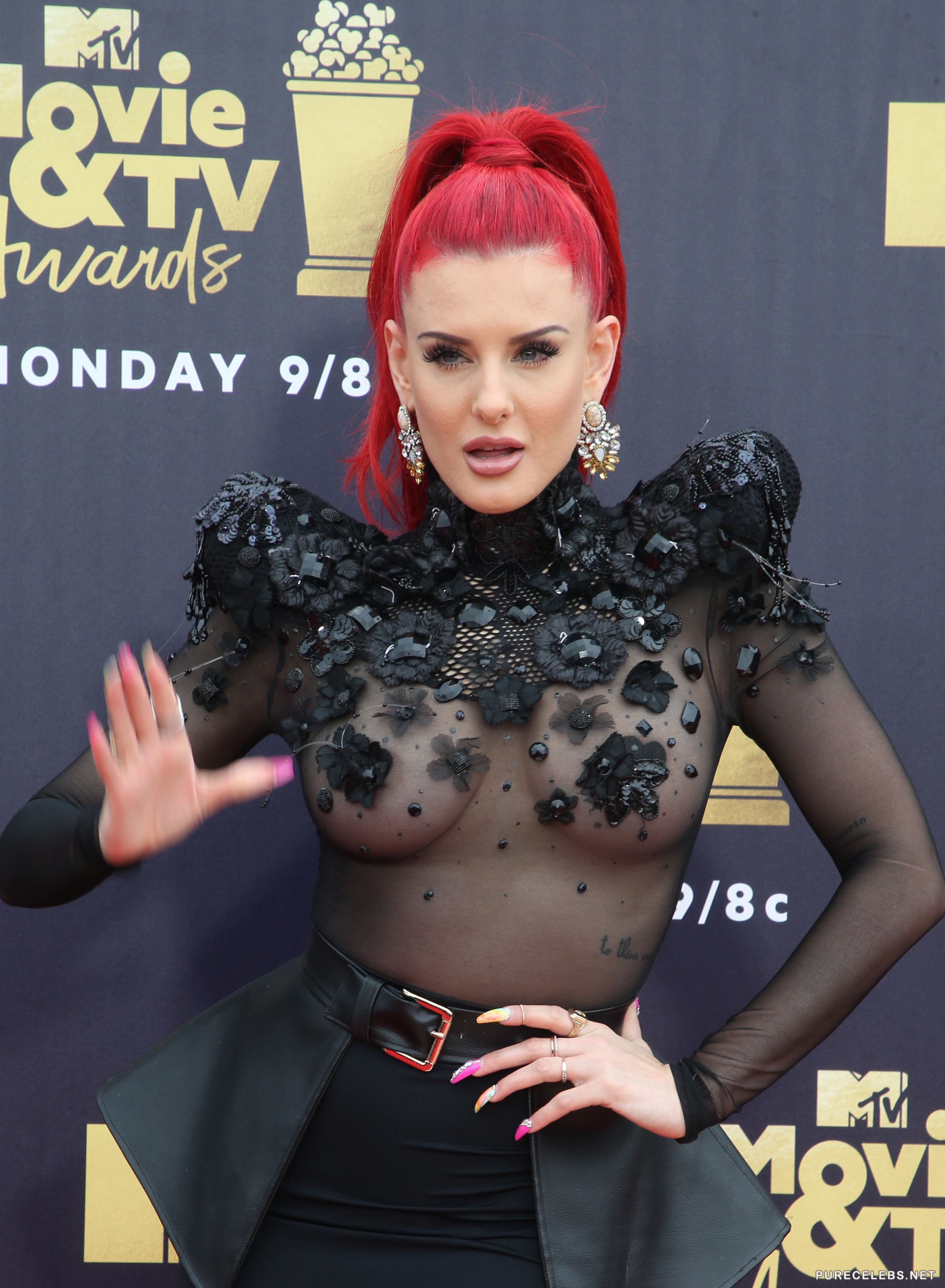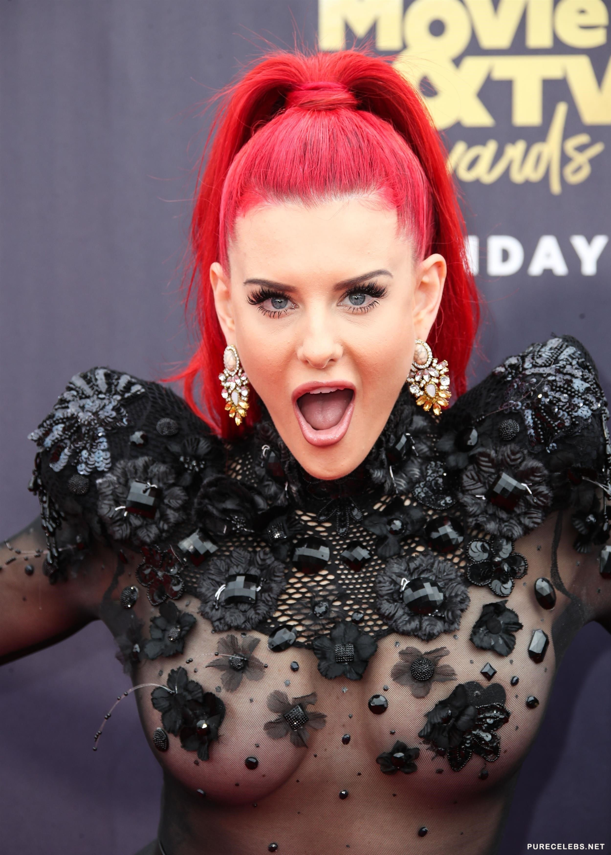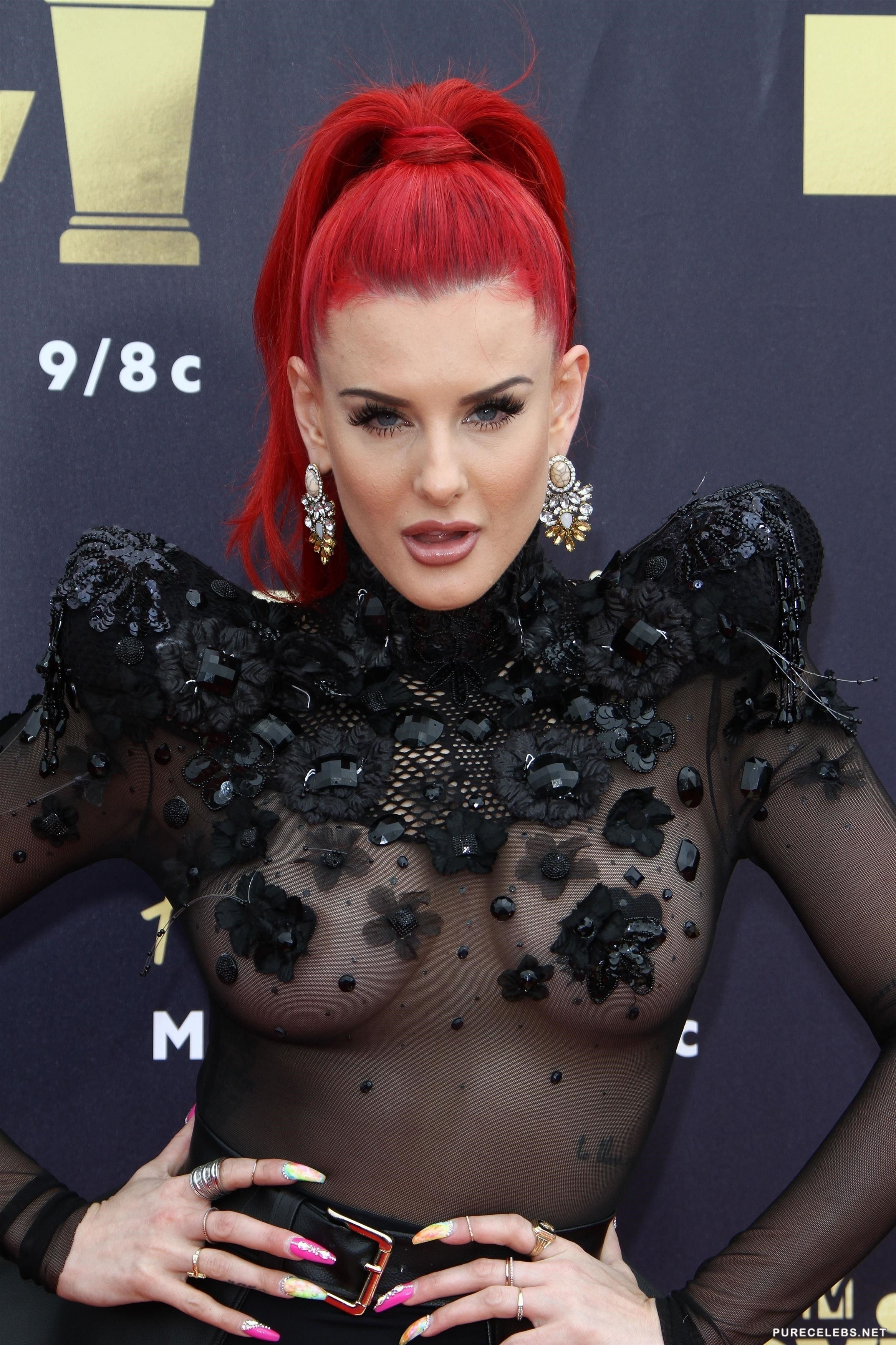 Justina Valentine is a fun loving redhead and since she knows that cameras will be taking shots of her on the opening night of some movie, she puts on her transparent top and she walks out in front of a crowd of people. The hottie is staring into the camera lenses with lust in order to show off how much all this attention makes her happy.