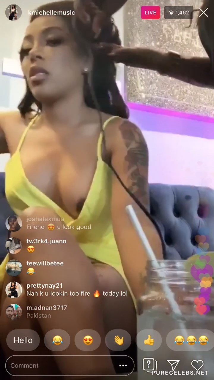 American singer K. Michelle always knows how to get the attention of fans. For example, a celebrity was recently broadcast live when preparing for a performance. While the girl was doing her hair, the star decided to drink water and stirred a little in the chair. The singer did not expect that her amazing nipple with a hard brown nipple jumped out of the deep neckline of her yellow dress, and everyone can see it.
