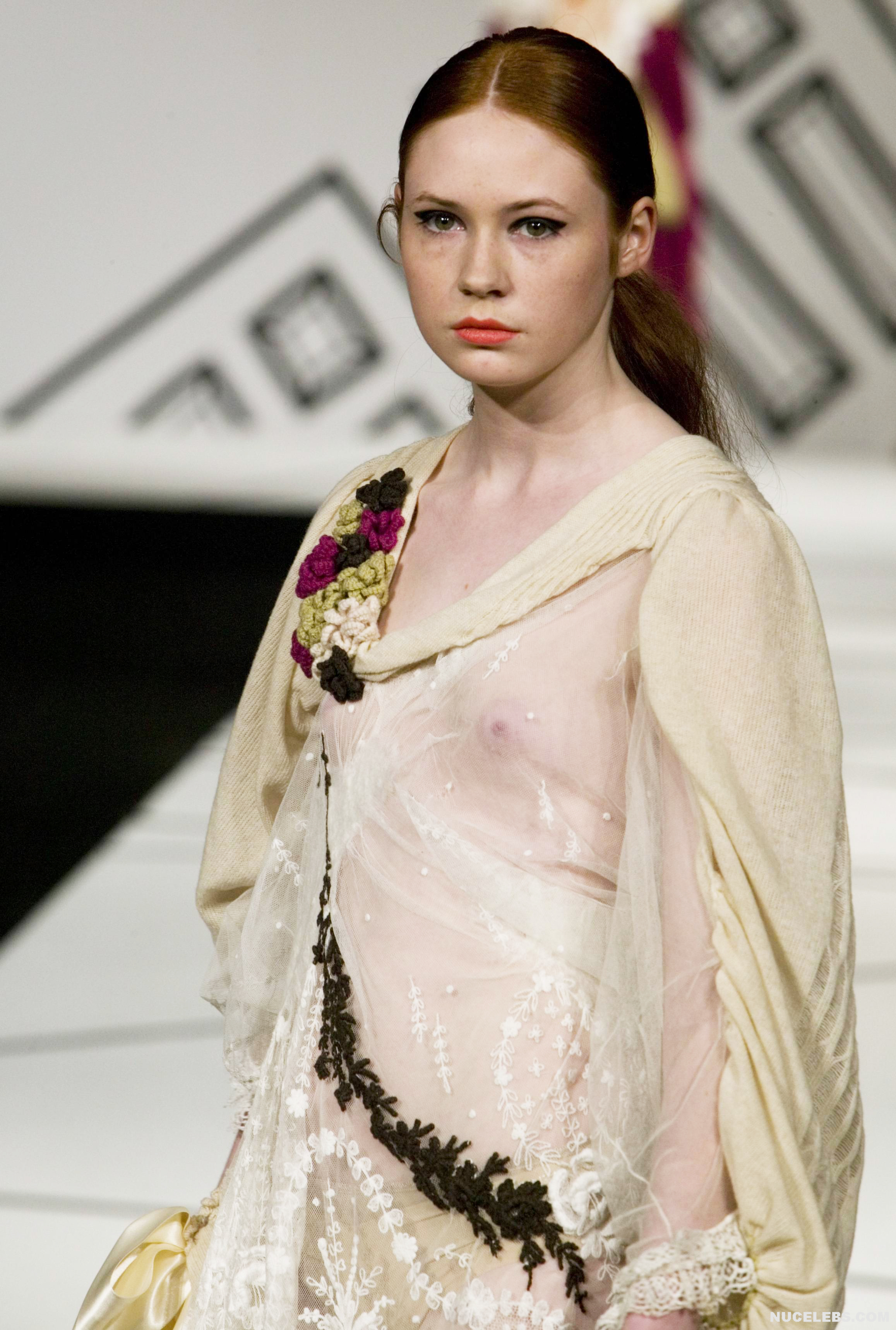 Red-haired beauty Karen Gillan showed her almost nude boobs during one of the shows. The celebrity walked the catwalk in a light transparent dress, and as it turned out, she was braless. This is why Karen Gillan’s nude titties with brown nipples showed through her outfit. Also, this girl is not averse to teasing you with her photos in seductive lingerie.