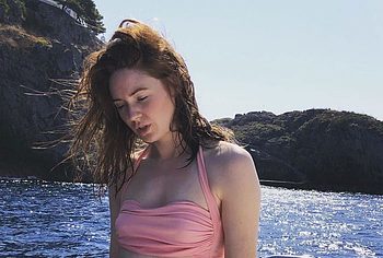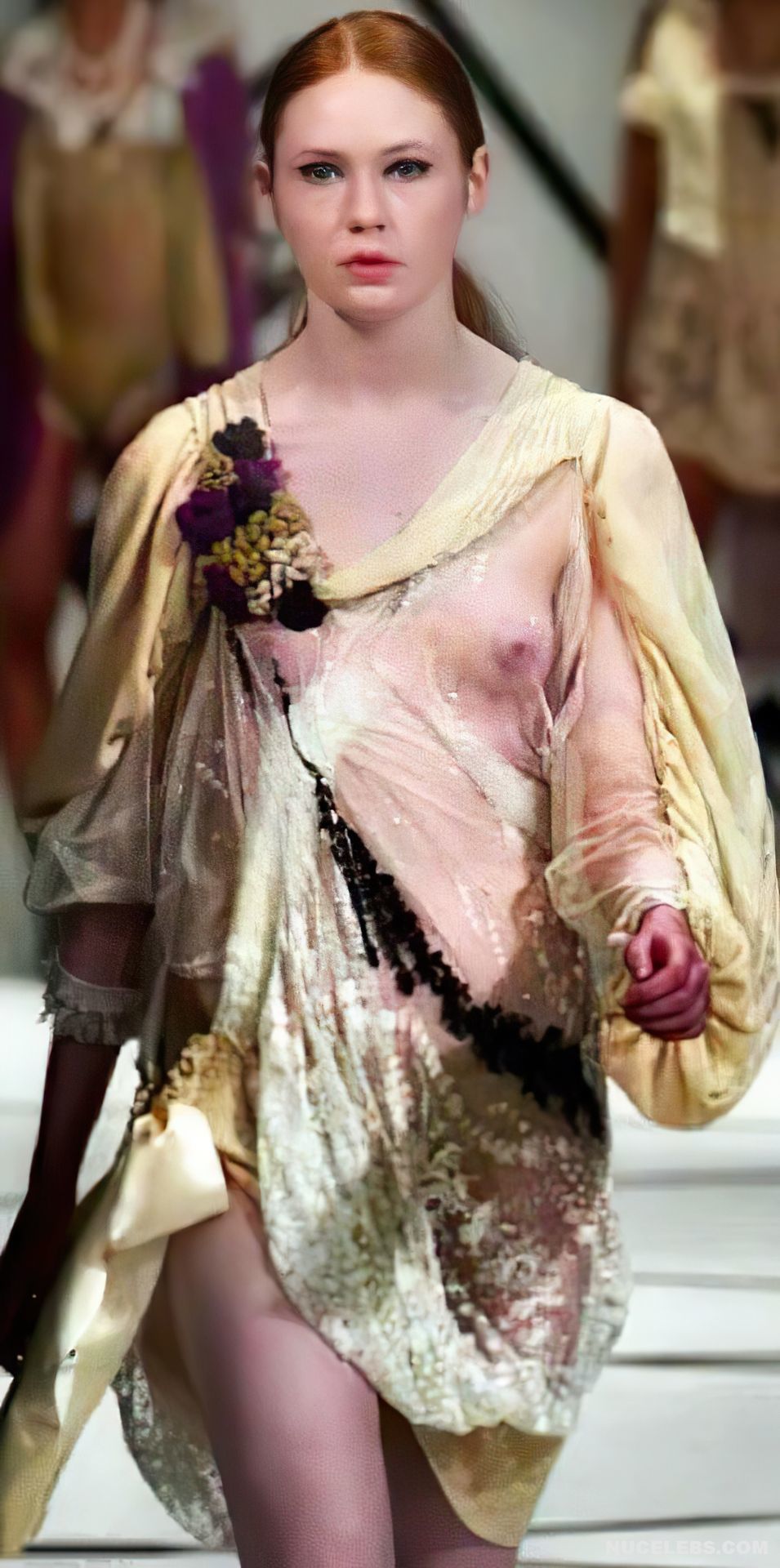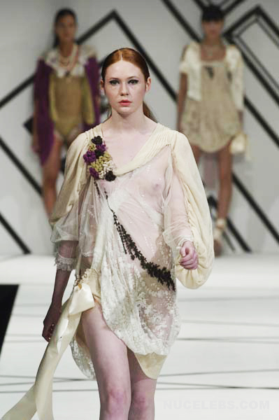 Red-haired beauty Karen Gillan showed her almost nude boobs during one of the shows. The celebrity walked the catwalk in a light transparent dress, and as it turned out, she was braless. This is why Karen Gillan’s nude titties with brown nipples showed through her outfit. Also, this girl is not averse to teasing you with her photos in seductive lingerie.