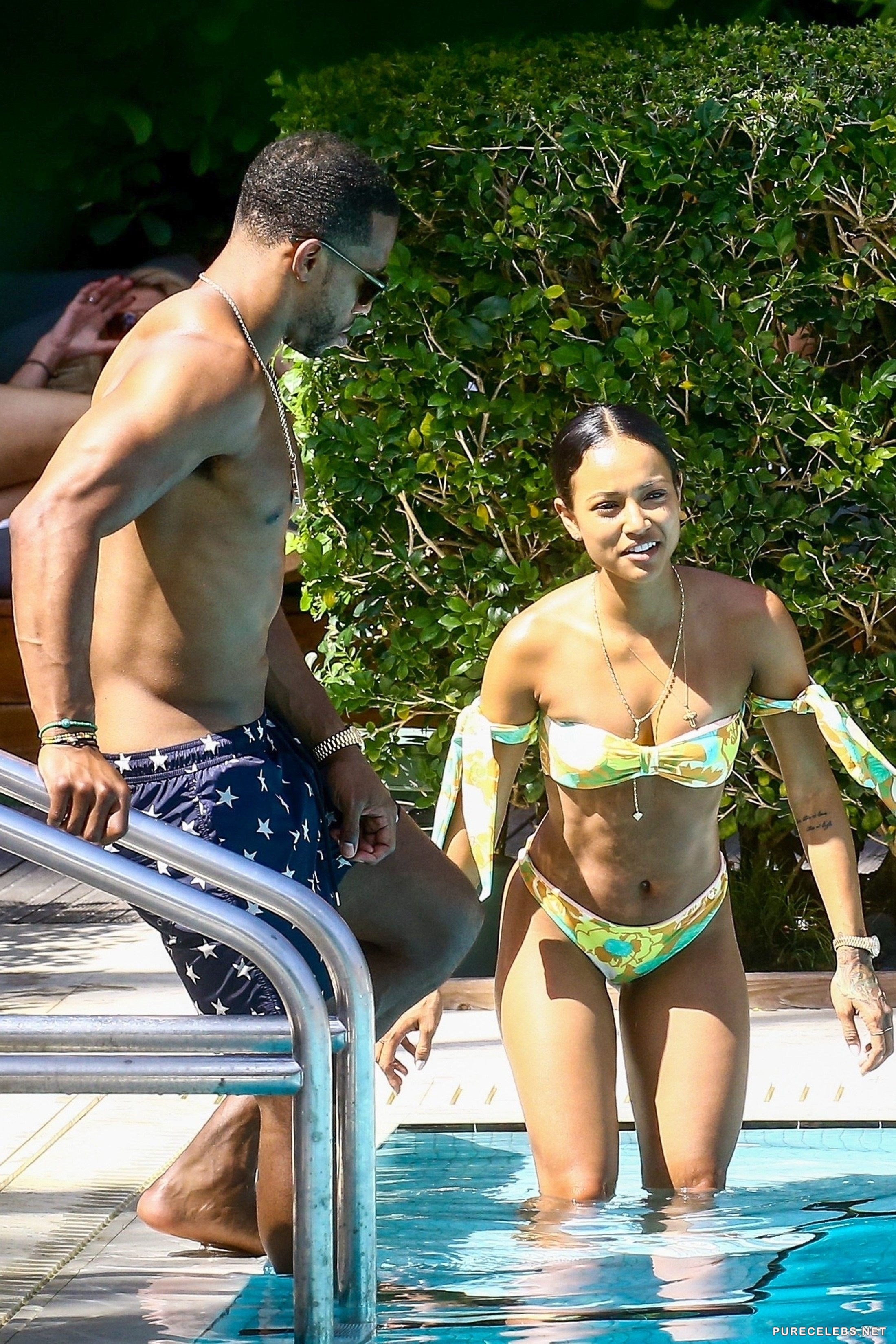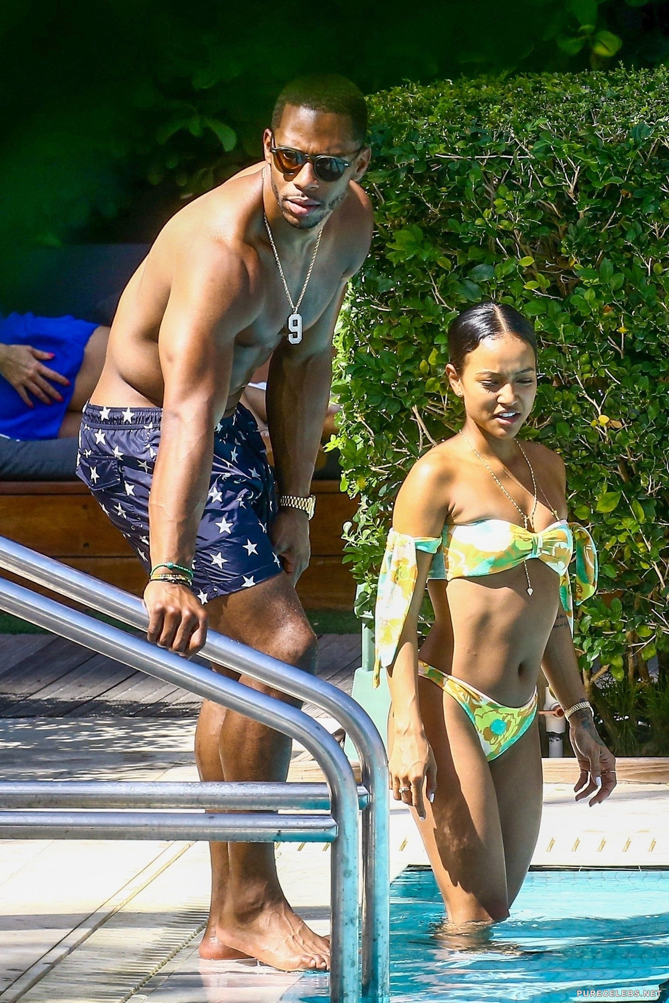 This hot young model Karrueche Tran, decided to spend a day with her boyfriend American footballer Victor Cruz in private resort. They were not afraid to express their lust in the pool, which paparazzi caught on his camera. They start by kissing in the pool and she grinds down his cock in the water. Later they get outside to sunbathe and she lays next to him, exposing her ass in bikini thong.