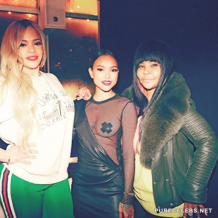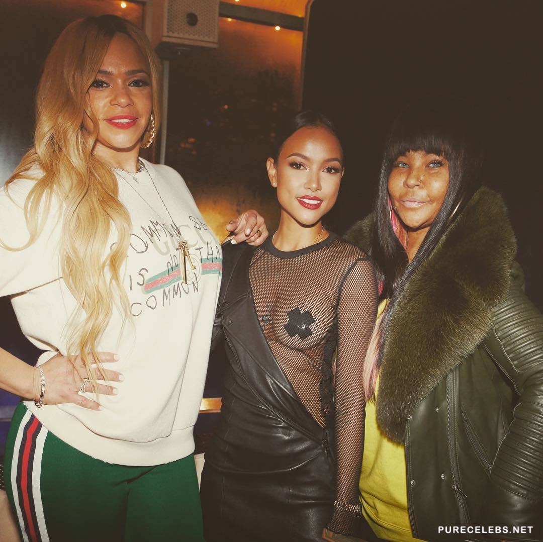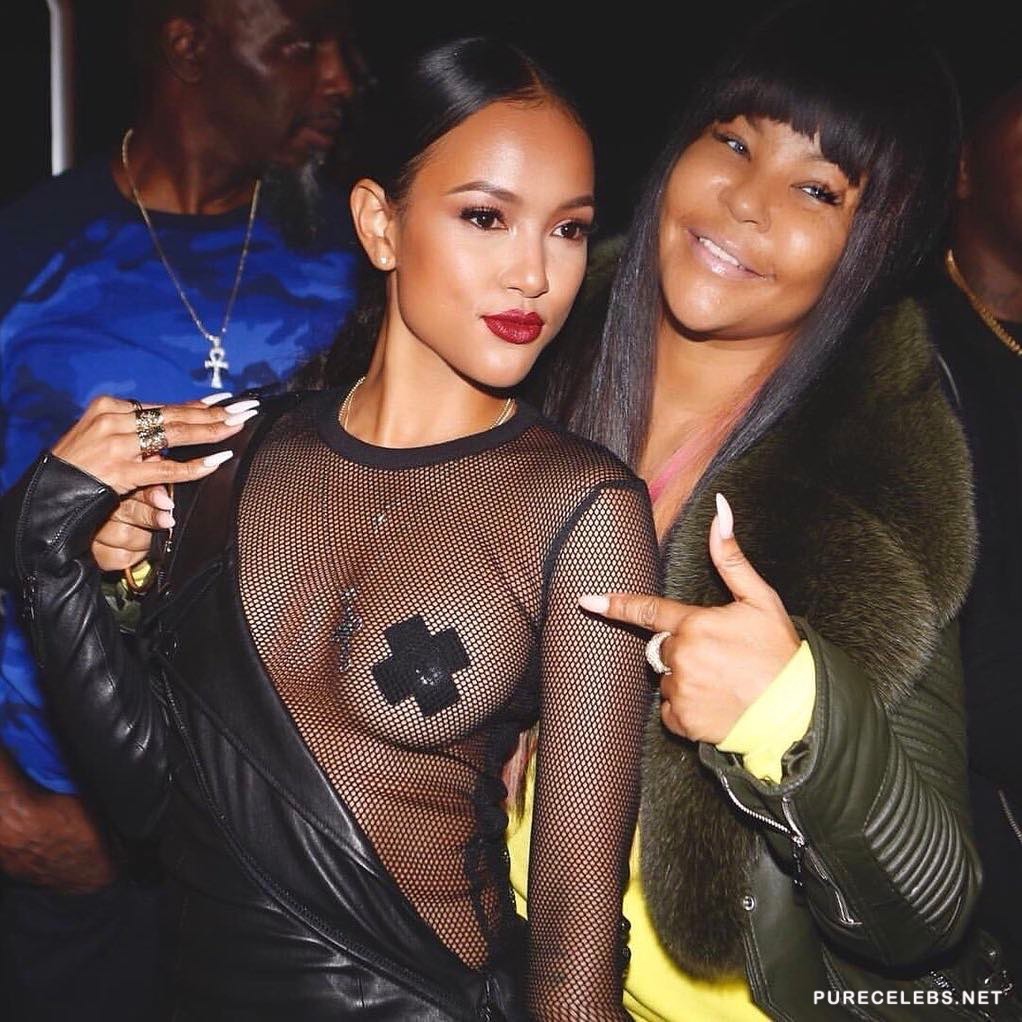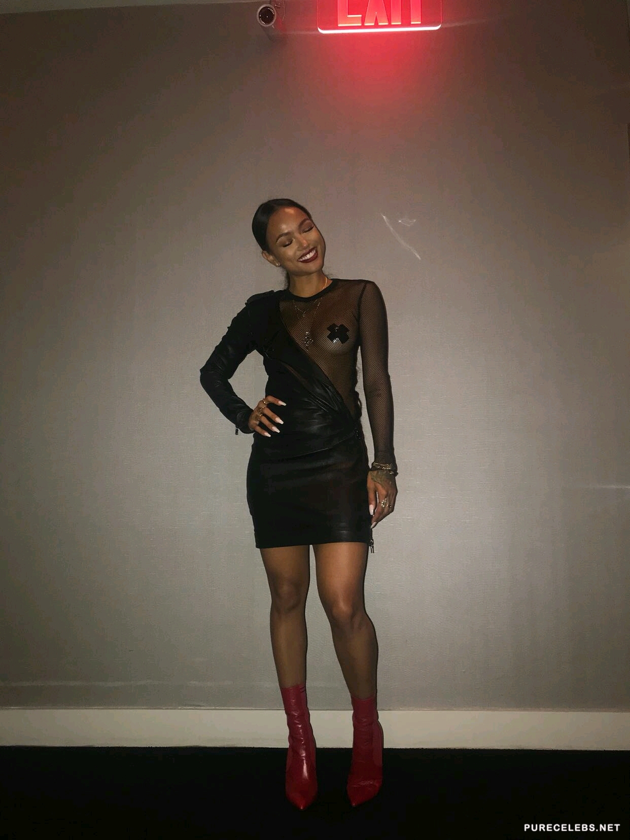 Karrueche Tran likes dressing sexy for her public appearances. Reporters photographed her wearing a black leather dress with a mesh top showing her beautiful breast. Unfortunately this ebony beauty decided to conceal her nipple from the public by sticking some black tape over it and forming an X. Well, X marks the sweet spot that everyone is looking at. She looked amazing at the party in her sexy dress.