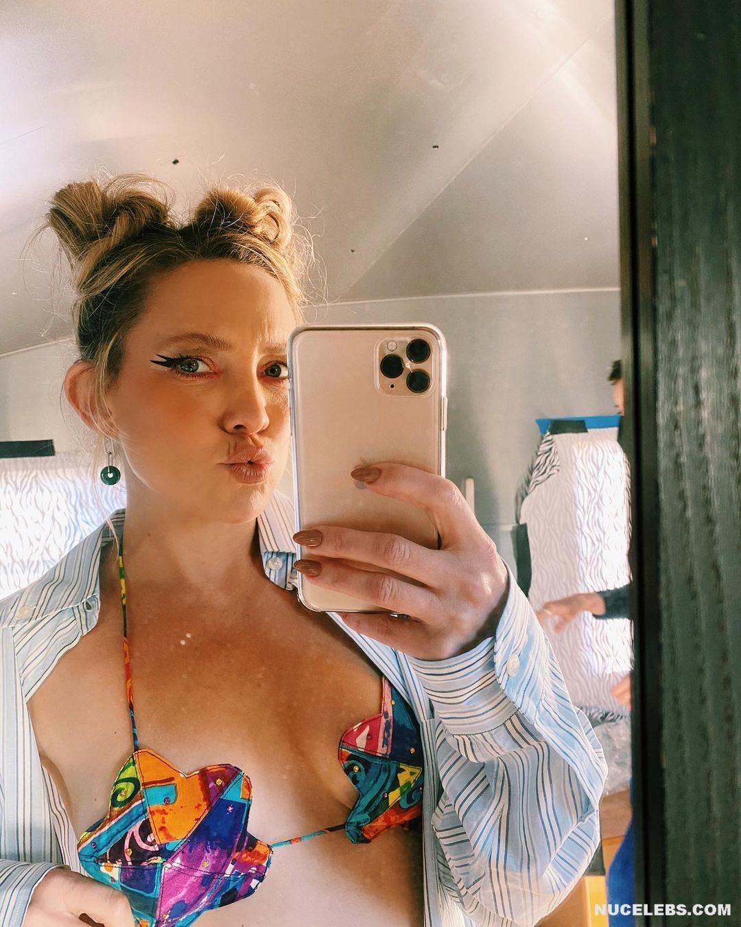 American actress Kate Hudson manages to charge everyone around her with her excellent mood. She also loves to excite the imagination of her fans with her provocative photos. For example, Kate Hudson took a great selfie while posing in blue lingerie, which accentuates her seductive curves. Kate Hudson is also happy to tease you with her nude tits. In one of the photos, this celebrity posed topless, showing off her elastic buttocks in tight leggings. But Kate Hudson still covered her nude breasts with her hands.