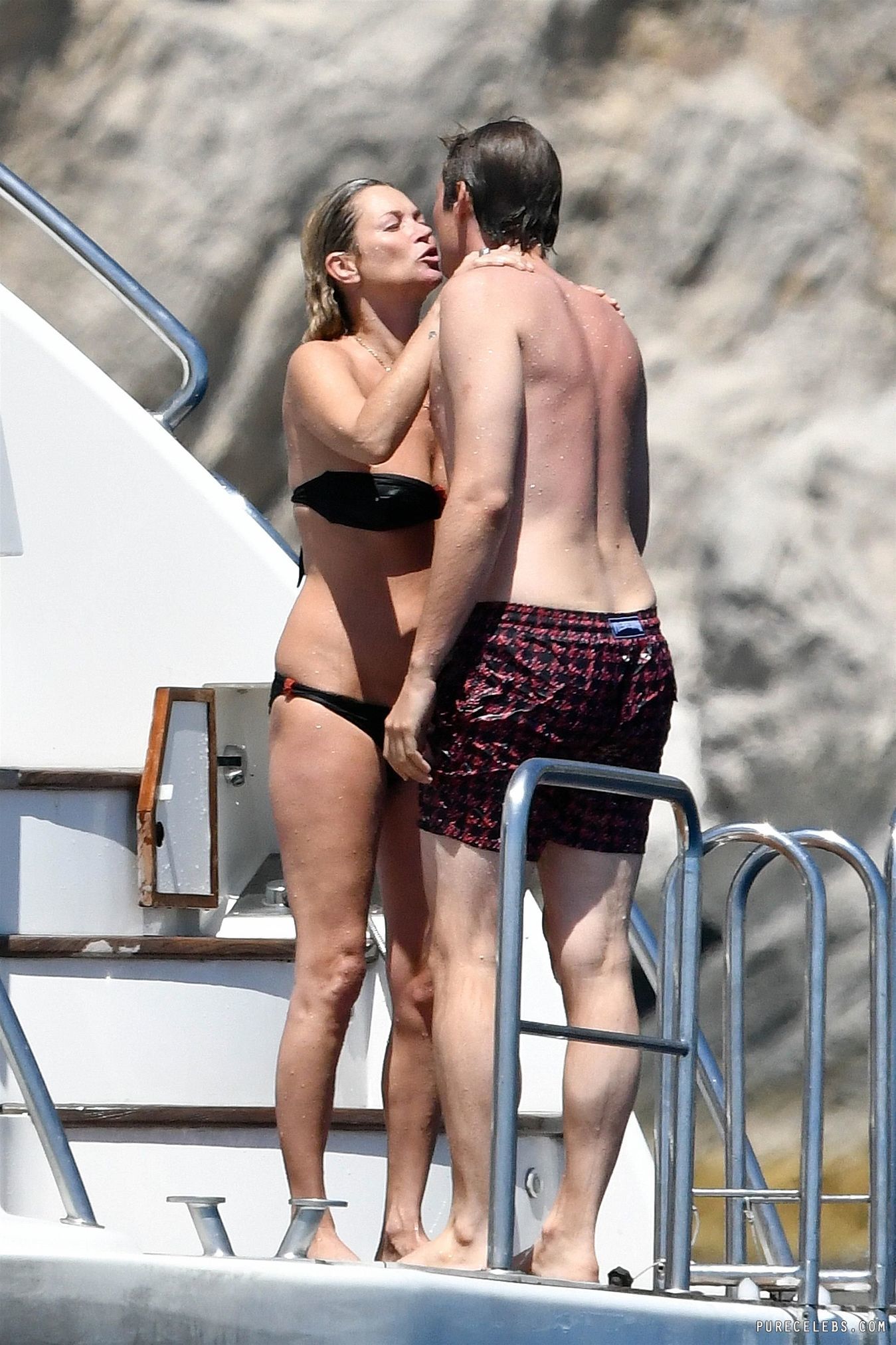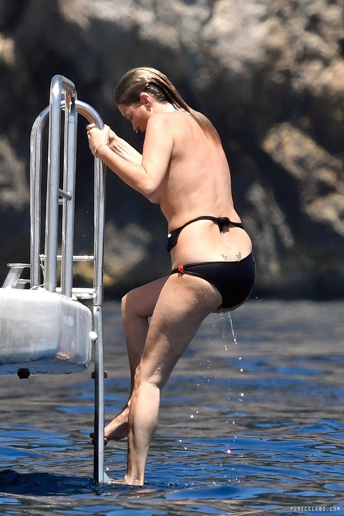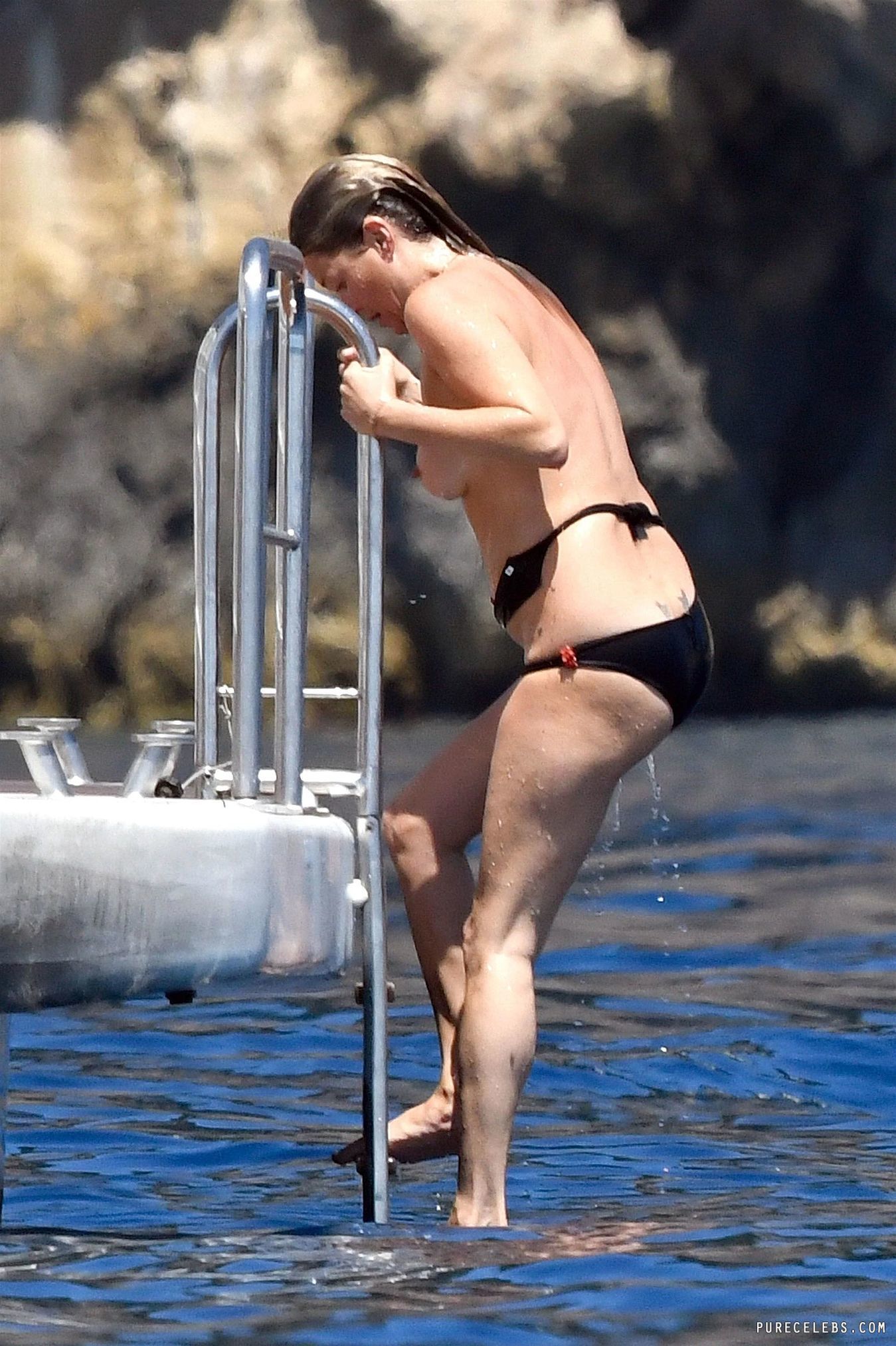 Paparazzi managed to photograph the nude boobies of British model Kate Moss during her vacation. The girl just had a great time with her boyfriend on the yacht. The celebrity was wearing a black bikini, the bra of which was small for her chic breasts. It is therefore not surprising that her big melons slipped out of it as she emerged from the water. Kate Moss nude juicy tits with hard nipples looked very seductive. I would like to touch them!