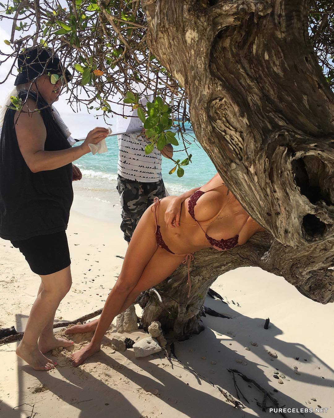 Kate Upton has world fame as one of the best and most often featured models for Sports Illustrated Swimsuit Issue, and she was also on the cover of the 100th-anniversary edition of Vanity Fair. In this photo shoot we can see her standing on the beach, holding her massive boobs, leaning on the tree in lacy purple lingerie and walking around wearing black corset and thong, flaunting her perfect body.