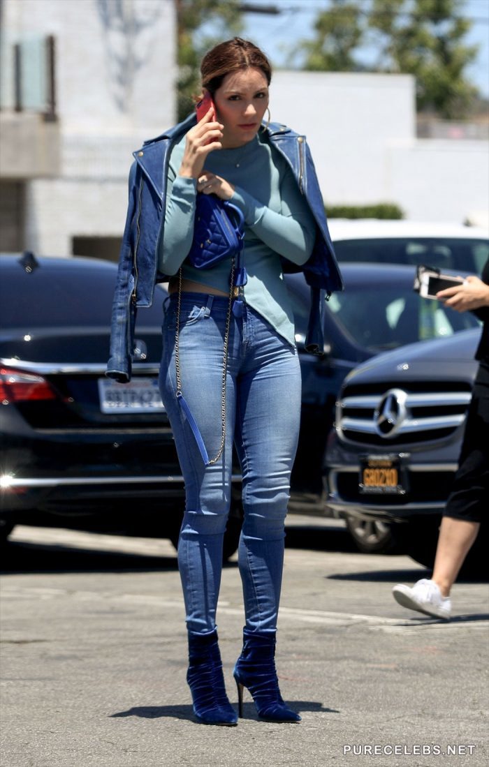 The American singer Katharine McPhee was in a pretty piquant situation that captured by the paparazzi. The celebrity was walking down the street wearing a blue outfit — jeans, top and jacket, and also complemented her image with blue booties and a handbag. But the star did not take into account that her jeans were too tight, and now everyone can admire her amazing cameltoe, which was clearly visible.