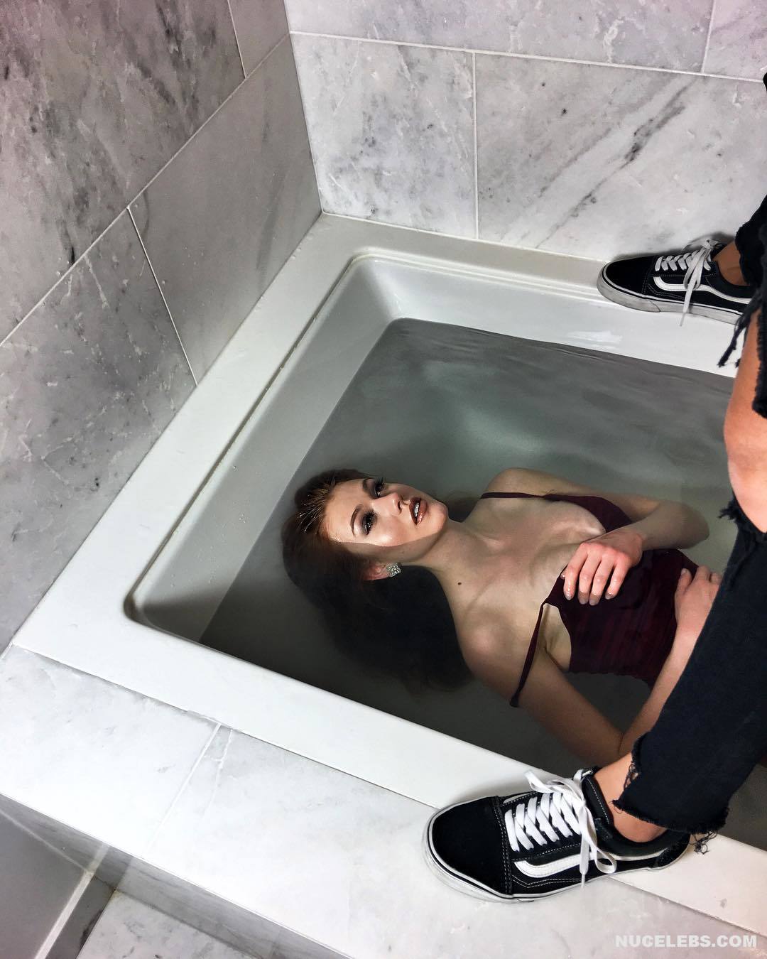 American actress Katherine McNamara knows how to impress the audience with her provocative outfits. For example, this beauty happily posed in the kitchen in a short striped robe. The top of the robe was unbuttoned and part of Katherine McNamara’s nude tits could be seen. Also, this celebrity showed off her nude boobies at one of the events. The actress wore a dark green outfit with a sheer top. At the same time, Katherine McNamara’s nude boob with a brown nipple was visible through the fabric and was almost not covered with multi-colored dots.